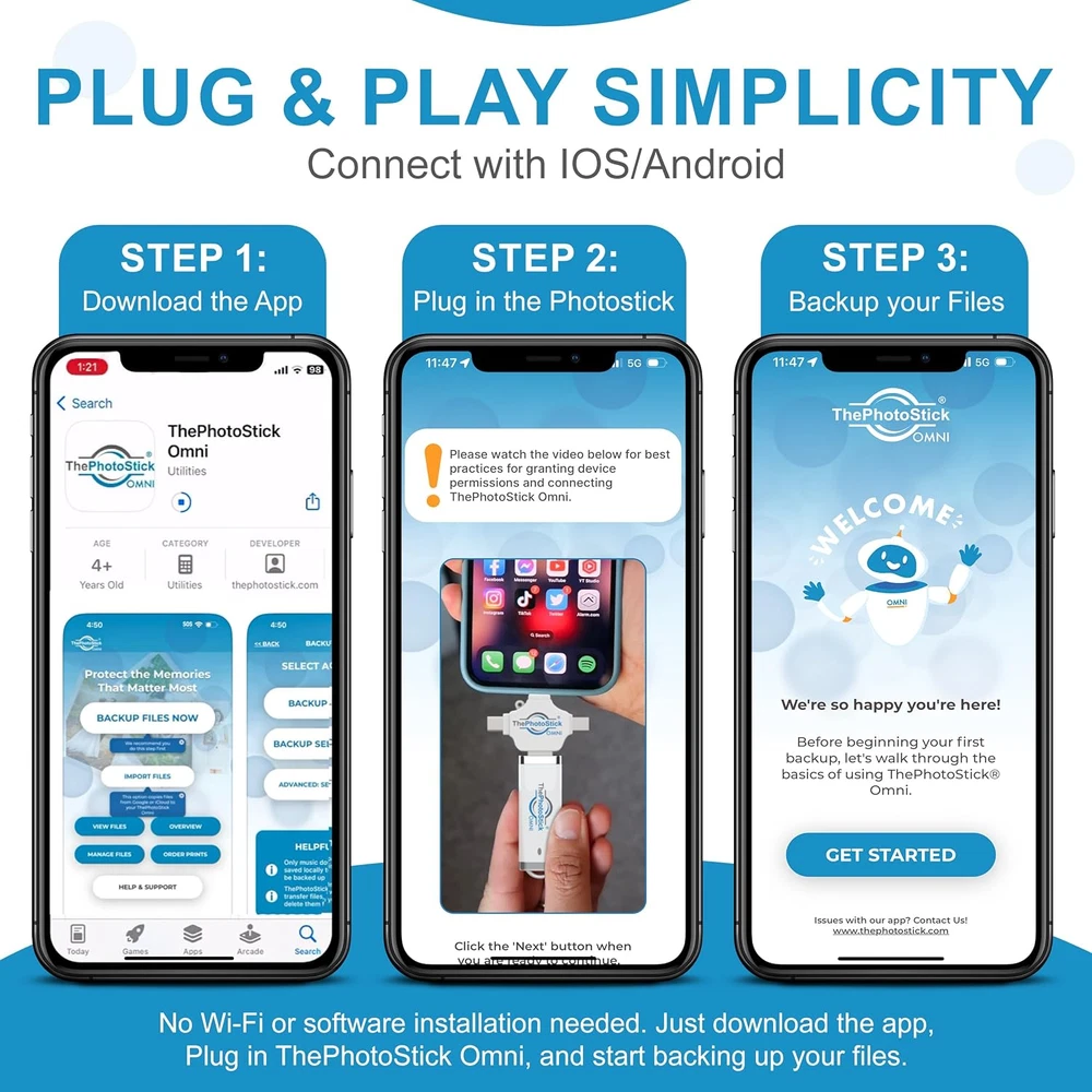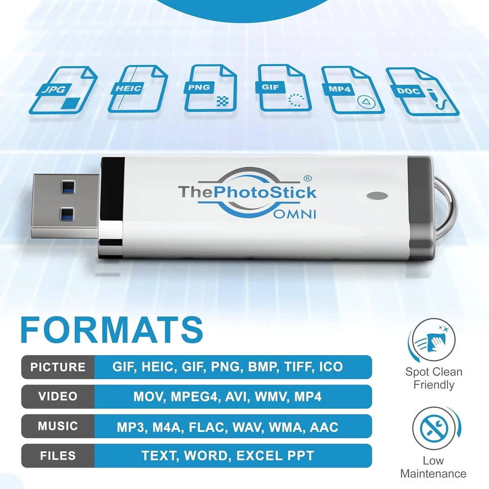 Store New Arrivals Add to Favorite View Feedback Thephotostick® Omni 32GB Flash Drive & Memory Stick – Photo & Video Backup USB for Iphone, Android, Mac & PC – Multiport USB Drive for Easy File Storage & Transfer Description Flash Memory Type USB Write Speed 30 MB/s Read Speed 30 Megabytes Per Second Memory Storage Capacity 32 GB Brand ThePhotoStick Country of Origin USA Hardware Connectivity Technology USB Type A Item Weight 0.317 ounces Manufacturer ThePhotoStick Connectivity Technology USB Model Name ThePhotoStick Omni Hardware Interface USB Special Feature Lightweight, Dual USB Connector Package Dimensions 5.24 x 2.52 x 0.59 inches Compatible Phone Models iPhone, Android Simple, Secure File Backup – ThePhotoStick Omni automatically finds and backs up photos, videos, and other files, helping keep your digital life organized and protected across devices. High-Capacity USB Storage – This 32GB USB thumb drive and photo storage stick holds over 12,000 photos and videos, making it a reliable USB storage solution for on-the-go backup and file access. Multi-Device Compatibility – Designed to work as a USB stick for PC, Mac, iPhone, iPad, and most Android phones and tablets. One jump drive for your whole digital world. Easy-to-Use with Free App – Just download the app, plug in the USB memory stick using the correct adapter, and follow the on-screen steps to back up your files. Broad File Format Support – Compatible with common photo and video formats like JPEG, PNG, HEIC, GIF, MOV, and MPEG4, plus many others. This flashdrive works across platforms as a versatile USB drive. System Requirements & Ports – Requires Android 8.0+, iOS/iPadOS 13.0+, Windows 7 SP1+, or macOS 10.13+. Includes USB-A, USB-C, micro-USB, and Lightning connections. Product Description 1 Universal Compatibility 2 As Seen In 3 File Backup On the Go ABOUT US We offer the best prices around on high quality products. Our E-store includes media such as books, movies, music and games while offering electronics, toys, sporting apparel, clothing, tools, general home, garden items and more. SHIPPING We are always working hard to ensure your package arrives as soon as possible. Please understand that some factors like weather, high postal traffic, and the performance of shipping companies are outside of our control. We offer free shipping to the lower 48 states and ship within 2 business days of payment, usually sooner. We do not accept P.O. Boxes. Please provide a physical address. RETURNS We offer a 30-Day Return Policy on items which you are not completely satisfied with. You have the option for a full-refund or an exchange of the item. No returns are available on items shipped outside of the USA. PAYMENT We accept PayPal. CONTACT US This page content is yet to come Please ad us to your favorite seller and visit again later Thank You