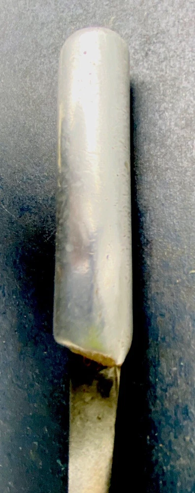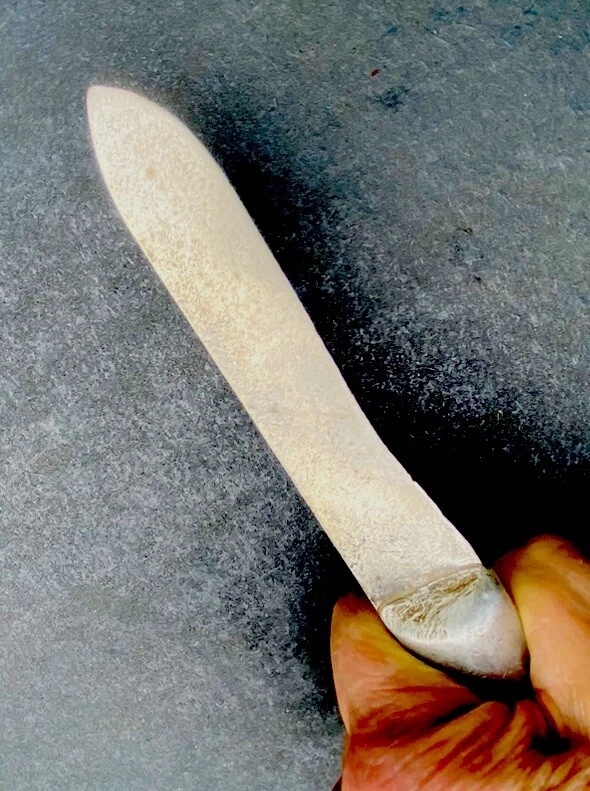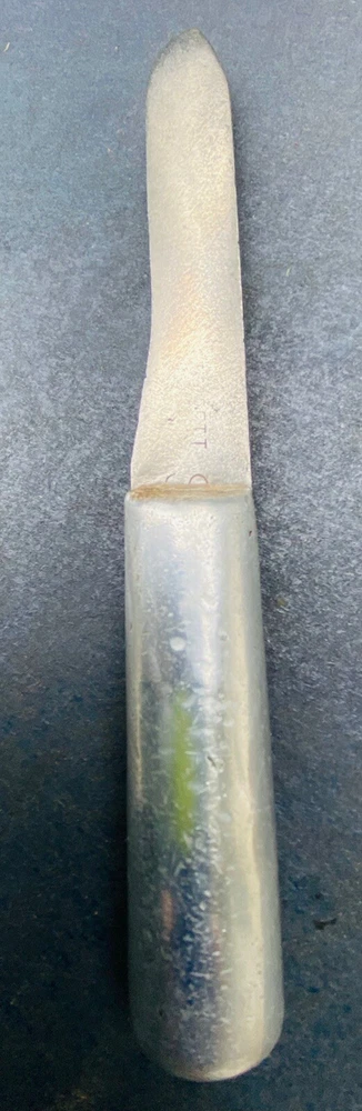 This hefty little theater made knife incorporates a 4 3/8” carbon steel blade from what was another factory made blade. The OAL is 8”. The blade has essentially no flex. It is moderately sharp. The crudely cast aluminum handle mostly obscures what looks like a large letter “S”. There are some mostly worn other letters on the blade flat, to the left of the “S”. You should be able to see what I am talking about in the second photo. Please examine the photos, a part of this description. Ask any questions. I have been an eBay seller for 24 years. Your satisfaction matters !
