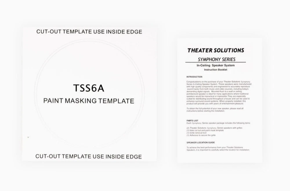 Theater Solutions symphony Series brand in-ceiling angled speaker is designed for consumers who demand the very best quality sound. The 15 degree angle is designed for directing the sound towards your listening area. This speaker is the perfect solution when in wall speakers are not an option. This speaker can be used as your front, rear or center channel. Deep bass, full bodied sound and comparable quality to the name brands, but at an affordable price. This speaker is perfect for home theaters, surround sound and all styles of music. Made with only the highest quality, moisture resistant materials to deliver unsurpassed sound in any listening environment. Sophisticated design and measurement equipment, including computer assisted design software were used to design this speaker to achieve an optimized balance and interface between components to give the very best quality performance and longer life. The easy in-ceiling installation and Ultra wide sound dispersion design make them ideal for discreet, single or multi-room installations. All of Theater Solutions speakers are self-mounting and feature the latest swing-out dog leg mounting system for easy installation. Paintable White aluminum Grills that offer added rust protection In moisture-prone areas such as bathrooms, kitchens and saunas; as well as a fabric scrim inside the grill that hides the drivers from view and will not interfere with the sound. The interlaced glass fiber 6. 5" Cone with butyl rubber surround is extremely lightweight yet rigid for even more extended bass, smooth high frequency response and greater power handling. The 1 inch pivoting liquid cooled silk dome tweeter offers the smoothest high frequency response and pivots to direct sound at listeners. The three position tweeter switch allows for precise tuning to your rooms acoustics. A 2nd order 18dB per octave Crossover round out the state of the art Components that add up to the best quality and design at a fantastic price! See less Features & details Theater Solutions TSS6A symphony Series angled in ceiling speaker, recommended power is 10-250 watts, efficiency is 95dB, frequency response is 28hz-21 kHz, 8ohm 2-Way design, 15 degree angle to direct sound to listeners, 6. 5" Extended Throw interlaced glass fiber cone woofer with butyl rubber surround, pivoting liquid cooled Silk dome tweeter 0dB, minus 3dB and minus 6dB tweeter adjustment switch, 2nd order 18dB per octave crossover, spring loaded wire terminals, paintable frame and grill, integrated wall-lock mounting system Cut out template and full instructions included, Cut out is 8. 625", overall is 9. 5", mounting depth is 5", designed and engineered in the USA
