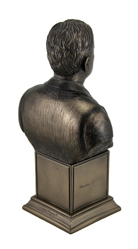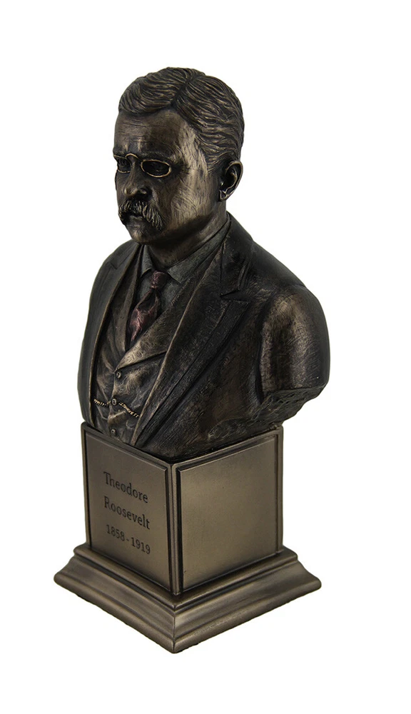Dimensions - 7 1/4 in. High, 4 1/4 in. Long, 2 3/4 in. Wide - Perfectly sized for display, this bust captures Theodore Roosevelt's dynamic presence. Expertly Cast in Resin - Crafted with precision and care, the resin material ensures durability and intricate detailing. Antique Bronze and Color Washed Finish - The timeless bronze finish, enhanced by subtle color washes, adds depth and character. Amazingly Detailed - Every feature, from Roosevelt's iconic mustache to his determined expression, is meticulously rendered. A Great Gift For History Buffs - Commemorate Roosevelt's impactful legacy with this finely crafted bust, an ideal present for history enthusiasts. Our eBay Store About Us Add to Favorite Sellers U.S. President Theodore 'Teddy' Roosevelt On Inscribed Plinth Bronze Finished Resin Bust Statue - 7.25 Inches High - Amazing Detail -Hand Painted Accents Dimensions - 7 1/4 in. High, 4 1/4 in. Long, 2 3/4 in. Wide - Perfectly sized for display, this bust captures Theodore Roosevelt's dynamic presence. Expertly Cast in Resin - Crafted with precision and care, the resin material ensures durability and intricate detailing. Antique Bronze and Color Washed Finish - The timeless bronze finish, enhanced by subtle color washes, adds depth and character. Amazingly Detailed - Every feature, from Roosevelt's iconic mustache to his determined expression, is meticulously rendered. A Great Gift For History Buffs - Commemorate Roosevelt's impactful legacy with this finely crafted bust, an ideal present for history enthusiasts. A tribute to one of America's most iconic leaders, this finely crafted Theodore "Teddy" Roosevelt bust captures the essence of the 26th President. Standing at 9 inches tall and 6 inches wide, this remarkable statue showcases Roosevelt's distinctive features, from his strong jawline to his characteristic mustache. Expertly cast in resin, the bust boasts a beautiful bronze finish, accentuating the intricate details of Roosevelt's likeness. The nuanced sculpting skillfully brings out the character and determination that defined the president's tenure. The bust's lifelike representation serves as a captivating addition to any decor, invoking the spirit of Roosevelt's progressive era. This Theodore Roosevelt statue serves as an enduring tribute to a man who left an indelible mark on American history. Whether displayed in a home office, library, or as a centerpiece in a historical collection, this sculpture encapsulates the charisma and strength for which Teddy Roosevelt is renowned. Meticulously crafted, this bust is not merely a decorative piece but a homage to the ideals and values upheld by President Roosevelt. It serves as a reminder of an era characterized by innovation, conservation, and a commitment to social progress. Ideal for history enthusiasts, collectors, or anyone inspired by Roosevelt's legacy, this bronze bust captures the essence of a dynamic leader, making it a fitting centerpiece for those who appreciate the rich tapestry of American history. Product Details Color Bronze Height 7.25 Length 4.25 Weight 2 LB