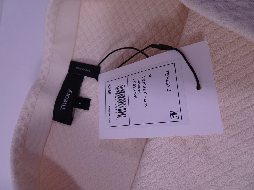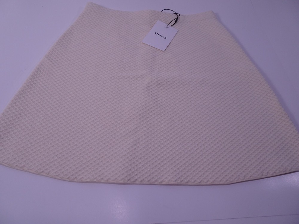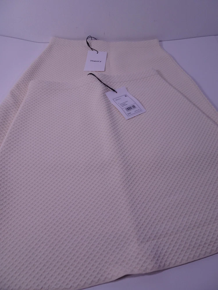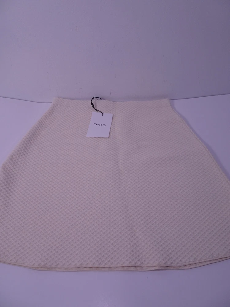 Theory Teslia A-Line Skirt Vanilla Cream NWT 298 Size P=0-2. Details & care A charming A-line skirt is subtly textured with a diamond-embossed pattern for a preppy look. 17" length (Small) 83% rayon, 13% nylon, 1% spandex Dry clean Imported Model stats: 5'10" height, 32" bust, 25" waist, 36" hip. Model is wearing size small Item #10079286