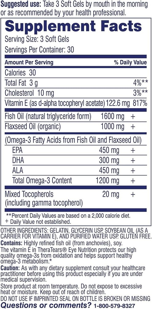TheraTears Omega 3 Supplement, 1200mg, 90 ct (Pack of 1) About this item: TheraTears Eye Nutrition 1200mg Omega-3 Supplement provides eye nourishment to help irritated eyes The clinically tested supplement utilizes an optimized blend of triglyceride fish oil and organic flaxseed oil with vitamin E Advanced Omega-3 Supplement nourishes eyes to promote healthy tears* A suggested use of 3 softgels supports eye health and may be used with TheraTears Dry Eye Therapy Lubricant Drops. Doctor recommended and created; TheraTears was created by an ophthalmologist after 18 years of research for dry eyes Designed to support tear production for greater eye lubrication, help maintain tear film integrity and promote overall eye health.* *These statements have not been evaluated by the FDA. This product is not intended to diagnose, treat, cure or prevent any disease Contains 1 bottle of TheraTears Eye Nutrition 1200mg Omega-3 Supplement, 90 count Product Description: The omega-3s in TheraTears Nutrition come from organically grown cold-pressed lignan-free flaxseed oil, and premium molecularly-distilled (mercury-free, PCB-free) fish oil. This flaxseed/fish oil blend supplements omega-3 metabolism better than flaxseed or fish oil alone, and makes TheraTears Nutrition great for healthy tears and eyes, and great for healthy saliva and oral health. "Our landmark research shows that omega-3 nutrition is critical for normal tear function that is necessary to maintain healthy, comfortable eyes throughout the day. And new research also shows that TheraTears Nutrition also supports saliva production that is necessary for oral health and mouth comfort. Try TheraTears Nutrition and see what we have accomplished!" Jeffrey P. Gilbrand, MD.