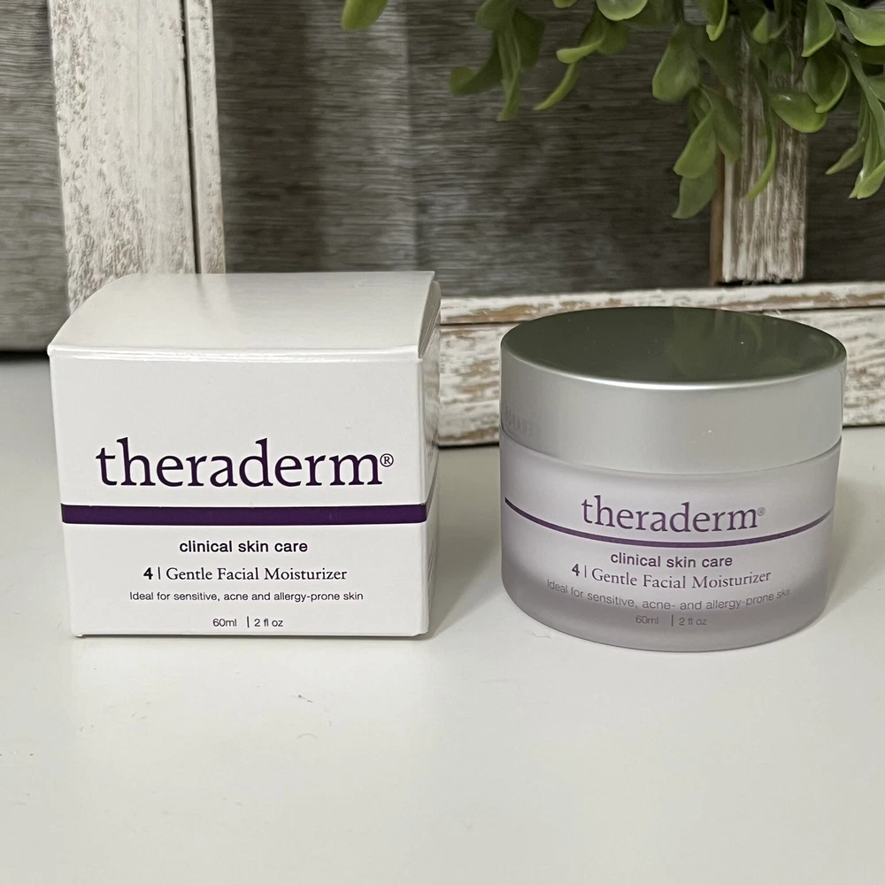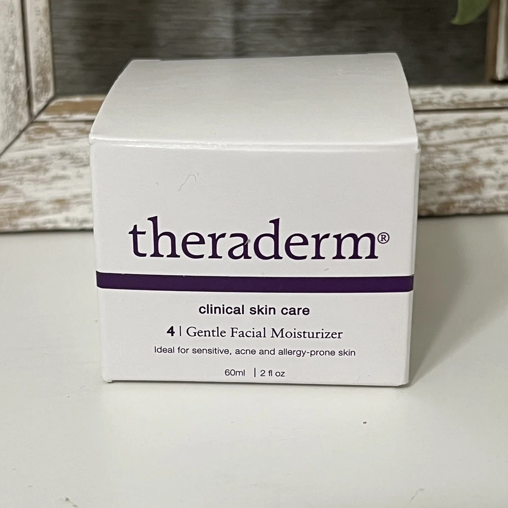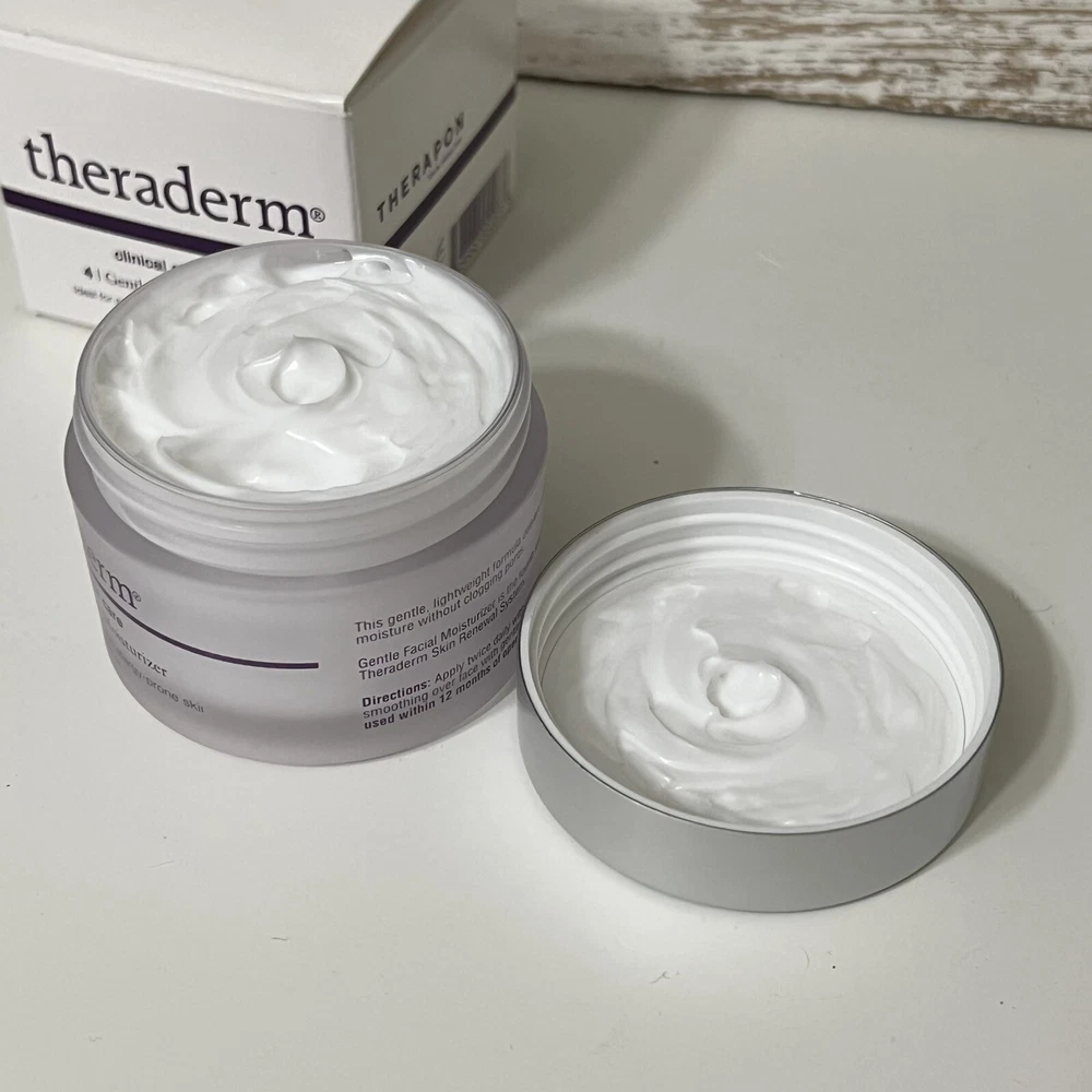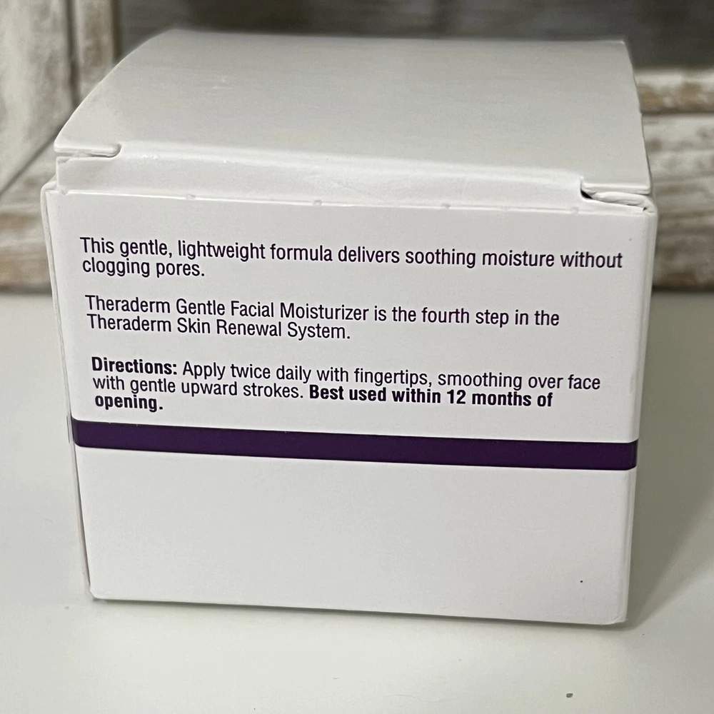 Theraderm Gentle Facial Moisturizer 2 Fl. Oz New NIB Clinical Skincare. All Ingredients: Water, Caprylic/Capric Triglyceride, Glycereth 26, Squalane, Propylene Glycol, Stearic Acid, Cetyl Esters, Glyceryl Stearate SE, Hyaluronic Acid, Glycosaminoglycans, Soluble Marine Collagen, Triticum Vulgare (Wheat) Germ Oil, Dimethicone, Nylon, Methicone, Carbomer, Diazolidinyl Urea, Iodopropynyl Butylcarbamate, Triethanolamine Beneficial Ingredients: Hyaluronic Acid Does Not Contain: Parabens Fragrance Dyes