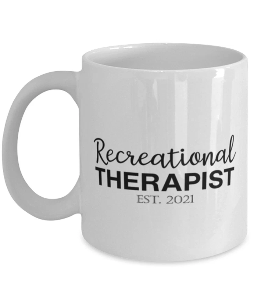 Therapist Graduation Mug Recreational Therapist Est 2021 Graduation Gift Gift Product Details.. This high quality 11oz. ceramic white mug has a premium hard coat that provides crisp and vibrant color reproduction sure to last for years. Perfect for all hot & cold beverages. The highest quality printing possible is used. It will never fade no matter how many times you wash it. Material: 100% Ceramic. Print both sides. Dishwasher and Microwave Safe. High Gloss + Premium White Finish. Printed in the U.S.A. Personalized & Custom. We support personalized and custom mug to add custom, when placing an order, you can add notes to the "order note" in shipping address section. Also you can contact us directly via message. Shipping Info. Ready to ship in 1 to 2 business days, All products are made-to-order and proudly printed in the United States. Shipped by USPS and DHL, You will receive your order in 5-7 days. Replace & Refund. All products are defective during shipping broken, chipped will be replaced free of charge. You are not satisfied with the product, we will refund 100% money to you. If any other issues arise, please do not hesitate to message, we would be more than happy to assist you.