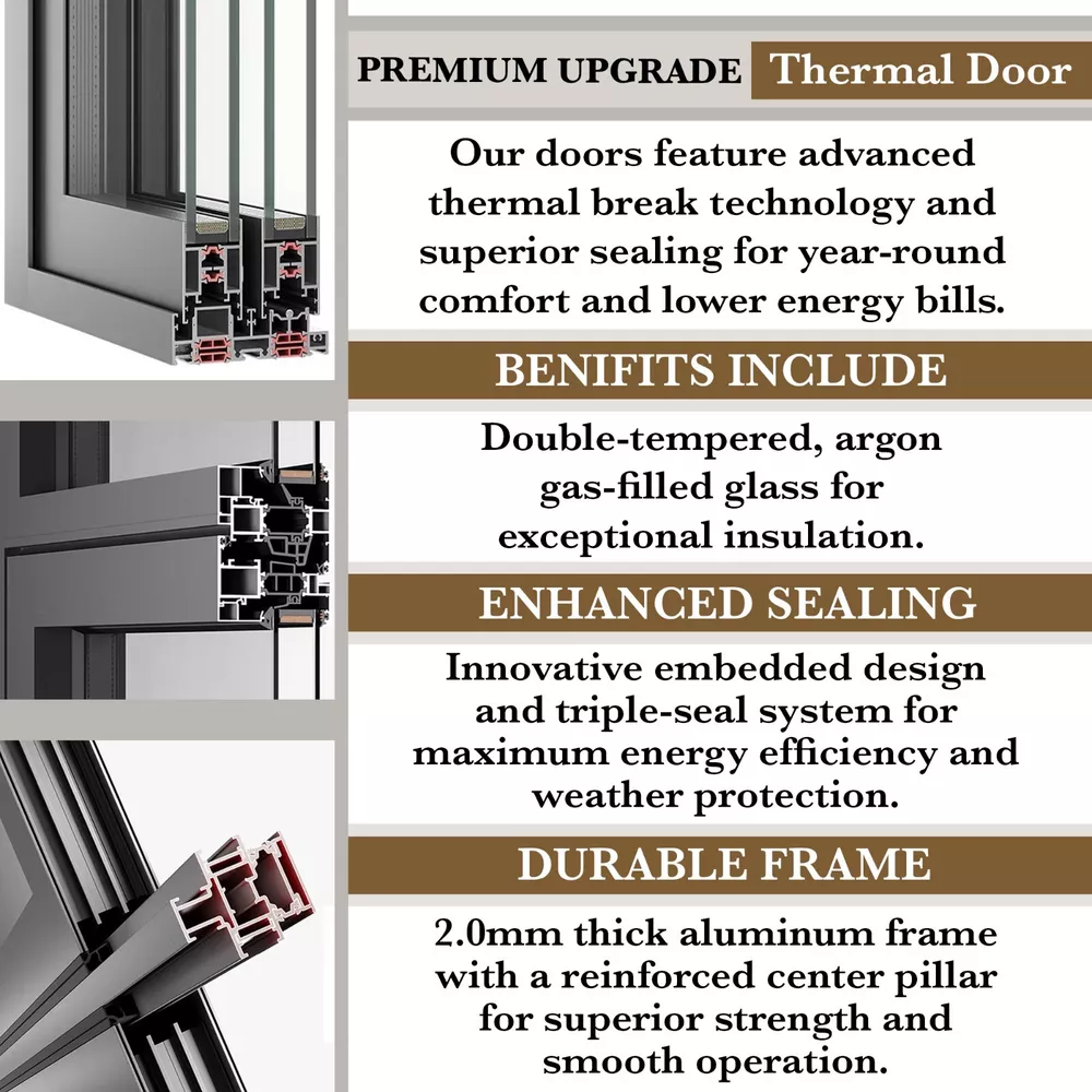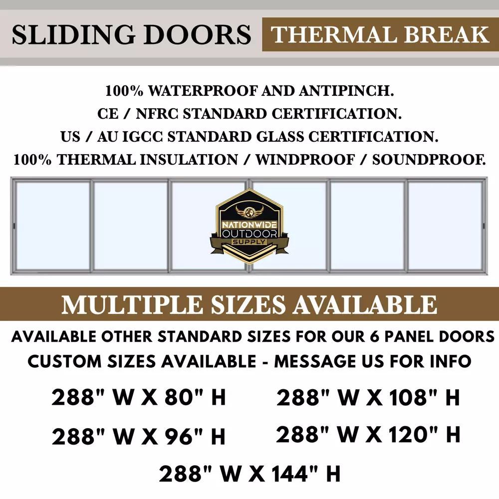 Upgrade your space with our Premium Thermal Break Aluminum Sliding Patio Door, measuring 288" x 96" (24' x 8'). Engineered for maximum durability and thermal efficiency, this heavy-duty 6-panel door features a sleek black powder-coated finish, ensuring long-lasting corrosion resistance. With a robust 2.2mm aluminum frame and double tempered glazing enhanced with Argon gas, enjoy exceptional insulation and noise reduction (30 dB). Certified for winds up to 4500 Pa, it's designed for extreme weather conditions. Choose custom colors and sizes tailored to your needs. Experience unbeatable quality and performanceâÂÂorder your custom sliding door today! Free delivery across the USA. PRODUCT FEATURES PRODUCT FEATURES Upgrade your space with our Premium Thermal Break Aluminum Sliding Patio Door, measuring 288" x 96" (24' x 8'). Engineered for maximum durability and thermal efficiency, this heavy-duty 6-panel door features a sleek black powder-coated finish, ensuring long-lasting corrosion resistance. With a robust 2.2mm aluminum frame and double tempered glazing enhanced with Argon gas, enjoy exceptional insulation and noise reduction (30 dB). Certified for winds up to 4500 Pa, it's designed for extreme weather conditions. Choose custom colors and sizes tailored to your needs. Experience unbeatable quality and performanceâorder your custom sliding door today! Free delivery across the USA. Premium Thermal Break Aluminum Sliding Glass Door Brand New - Upgrade 2025 Model Year Custom Colors 288" x 80" | 24' x 6.7' DEALERS - CONTRACTORS & WHOLESALERS WANTED Lowest Price In The USA Guaranteed FREE DELIVERY IN THE USA ALL DOORS ARE NRFC - IGCC & EU CE APPROVED ( MAKE SURE THE DOOR YOU CHOOSE IS APPROVED TO BE INSTALLED IN THE USA, ALOT OF DOORS ARE NOT!) PICK YOUR COLOR - ALL DOORS ARE CUSTOM MADE ( SEE ORDER INFO BELOW) NEED A DIFFERENT SIZE? OR HOW MANY PANEL IT HAS We offer a variety of sliding door configurations to fit any space. Choose from 2-door, 3-door, 4-door, 5-door, 6-door, 7-door, or 8-door setups, depending on the size you need. Frame Options: Regular Frame (This Listing) Skinny Frame (Available in Our eBay Store – Contact Us for More Info) Other Available Door Sizes (eBay Store): ✔ 2-Panel Doors: 96x80, 80x80, 96x96, 96x108, 108x108, 120x96, 120x120 ✔ 3-Panel Doors: 144x80, 144x96, 144x108, 144x120, 144x144 ✔ 4-Panel Doors: 192x80, 192x96, 192x108, 192x120, 192x144, 240x80, 240x96, 240x108, 240x120, 240x144, 288x96, 288x108, 288x120, 288x144 ✔ 6-Panel Doors: 288x80, 288x96, 288x108, 288x120, 288x144, 360x80, 360x96, 360x108, 360x120, 360x144 💡 Need a custom size? No problem! All orders are custom, so if you don’t see the size you need, check out our eBay store or contact us—we can create any size to fit your space! Heavy-Duty Exterior Sliding Door | French Slider | 3-Track, 6-Panel System 288" x 80" | 24' x 6.7' Upgrade your space with our high-performance Thermal Break Aluminum Sliding Glass Door , a top-tier choice for modern home and commercial applications. Engineered for maximum durability, thermal efficiency, and superior wind resistance , this heavy-duty exterior sliding door combines sleek aesthetics with cutting-edge functionality. Product Overview Profile Material: 6063-T5 Aluminum Alloy (2.2mm thick for unmatched strength) Frame Depth: 217mm | 3 Tracks, 6 Panels Frame Finish: Black Powder-Coated for a sleek, corrosion-resistant look Glass Type: 5+27A+5mm Double Tempered Glazing with Argon Gas Fill Tracks: SUS304 Stainless Steel for long-lasting smooth operation Package: Includes fully enclosed wooden crate for maximum protection Key Features & Benefits 1. Unmatched Strength & Durability ✔ 2.2mm thick aluminum frame —far superior to standard market options. ✔ SUS304 Stainless Steel tracks ensure smooth, rust-resistant sliding for years. ✔ Heavy-duty locking core with key double door system for enhanced security. 2. Superior Thermal Efficiency ✔ Thermal Break Technology prevents heat transfer, keeping indoor temperatures stable. ✔ 5+27A+5mm Double Tempered Glass with Argon Gas Fill —argon is 6 times denser than air , enhancing insulation. ✔ Hidden drainage system and three-seal design provide maximum waterproofing. 3. Extreme Weather & Wind Resistance ✔ Certified for high wind loads up to 4500 Pa (4.5 kPa) — 5x stronger than most doors rated at only 800 Pa. ✔ Waterproof & airtight sealing —designed for all climates, from coastal storms to extreme cold. ✔ Hurricane-rated for safety and protection against extreme weather conditions (not Miami-Dade rated). 4. Noise Reduction & Security ✔ 30 dB Sound Insulation —ensuring peace and quiet inside your home. ✔ Six-point locking system with anti-theft flyscreen for added security. ✔ Impact-resistant double-tempered glass —built to last and resist damage. 5. Modern, Space-Saving Design ✔ Seamless, smooth sliding operation with heavy-duty hardware . ✔ Maximizes natural light while reducing energy costs . ✔ Custom sizing available to fit any project. Performance Ratings Air Permeability: 4.5 m³/m·h Water Tightness: TS EN 12208, 300 Pa Wind Load Resistance: TS EN 12210, 4500 Pa (Far superior to the industry standard B2 rating of 800 Pa) Thermal Insulation: Uw: 2.3 W/m².K U-Factor: 0.29 & SHGC: 0.23 Customization Options We offer fully custom-sized doors to fit your exact needs. Whether you need a specific width, height, or frame color , our doors can be tailored to your residential, commercial, or luxury project . ✔ Choose from multiple frame colors ✔ Custom glass options available ✔ Global shipping available 📞 For bulk orders or contractor discounts, contact us for a custom quote! Order Process & Lead Time ✔ Custom Manufacturing – All doors are made-to-order for 2025 production. ✔ Lead Time: 10-12 weeks (may vary based on location and custom options). ✔ Confirmation Process: A team member will contact you to confirm dimensions, color, and glass options . ✔ 