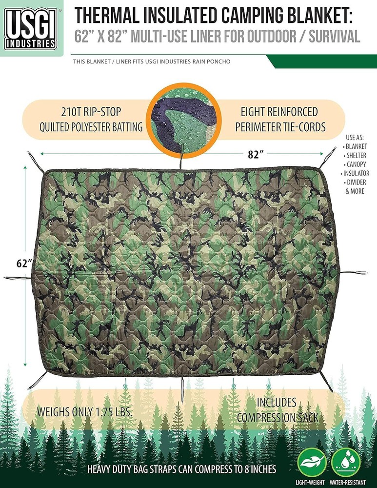 MULTI-USE PONCHO LINER: This essential piece of military survival gear provides warmth and insulation against most weather elements and temperature protection which make for the ultimate camping and outdoor blanket. Camo Pattern is one-sided MULTI-USE PONCHO LINER: This essential piece of military survival gear provides warmth and insulation against most weather elements and temperature protection which make for the ultimate camping and outdoor blanket. Camo Pattern is one-sided MILITARY STYLE CONSTRUCTION: Tightly woven nylon fabric insulated with quick-dry polyester batting is reinforced with wave-pattern insulating quilting. Features 8 pairs of tie cords attached around edges with reinforced bar-tack stitching MEASUREMENTS: This Poncho Liner is approximately 62 by 82 inches total length and weighs 1.75 pounds with compression sack. Includes military-issue style Compression Stuff Sack which reduces space and volume VERSATILITY: Use as a quick-dry beach blanket, stadium blanket, make-shift survival shelter, sun canopy, hammock insulator, pillow, tent divider, privacy screen, emergency carry litter, seat cover, pet bed, disaster relief, concealment blind, carry satchel, backpacking blanket, sleeping bag or tent insulator, and much more Material Polyester Fill Inside Nylon Fabric Color Woodland Special Feature Backpacking, Bagged, waterproof, Corded, ultralight Style Camouflage Blanket Form Travel Blanket Age Range (Description) Adult, Kid Product Dimensions 82"L x 62"W Theme Outdoors Pattern Camouflage Recommended Uses For Product Backpacking, Camping, Hiking Seasons All, Winter, Fall, Spring Weave Type Ripstop Product Care Instructions Machine Wash Size 62" x 82" Fabric Type Nylon/Polyester Unit Count 1 Count Number of Items 1 Item Weight 793.79 Grams Included Components compression carry bag Fabric Warmth Description Heavyweight Sport Hunting Water Resistance Level Water Resistant On Feb 12, 2025 at 00:48:41 PST, seller added the following information:
