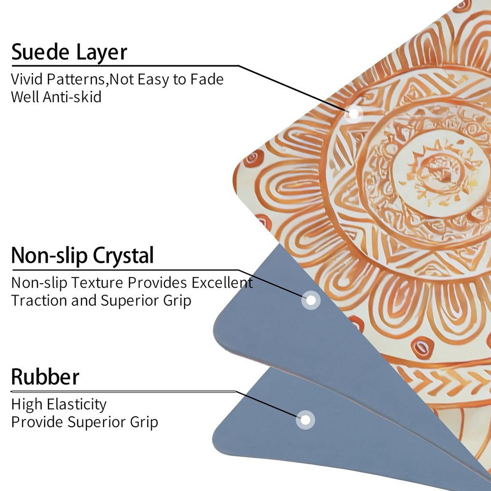 ---Suede surface can obtain a strong anti-skid performance,even if glued to water can also maintain good anti-skid performance ---Anti-slip effect Spraying water on the mat before use can effectively improve the anti-slip performance of the mat ---It is made of TPE&Suede.Excellent traction and grip.Easy to carry, perfect for travel.Non-slip suede for more sweat absorption and anti-slip,perfect for hot yoga. ---High-density lightweight TPE bottom layer. Perfect fitness mats for exercise. ---This yoga mat combines durability and style for the cutest of thick exercise mats for home workouts or even as a hot yoga mat. BIG SIZE: 72"(183cm) x 24" (61cm), 6mm extra thick, high density provides excellent cushioning and soft. All our mats come with a free carry Strap For easily rolled up for storage, making it easy to carry and convenient for practicing at home or on the go PREMIU MATERIAL: Ultra micro-suede top layer and high-density Eco-Friendly TPE bottom,Highly sweat absorbent, Provides a durable and supportive base, double anti tear layer,Made for Hot Yoga EASY TO CLEAN:Thick yoga mats for women,Hand washing can extend the lifespan of yoga mats,Simply gently wipe away surface dirt, no machine washing.Spot clean water or damp cloth with cold water and mild detergent VERSATILE INDOOR & OUTDOOR USE: Perfect for both indoor workouts and outdoor adventures—use it as a gym mat, yoga mat, or even a picnic blanket for ultimate flexibility. MULTIPLE PATTERN DESIGNS: We have a wide range of pattern designs to choose from, suitable for home decoration styles. Beautiful patterns will make people feel happy, great for yoga who values aesthetics
