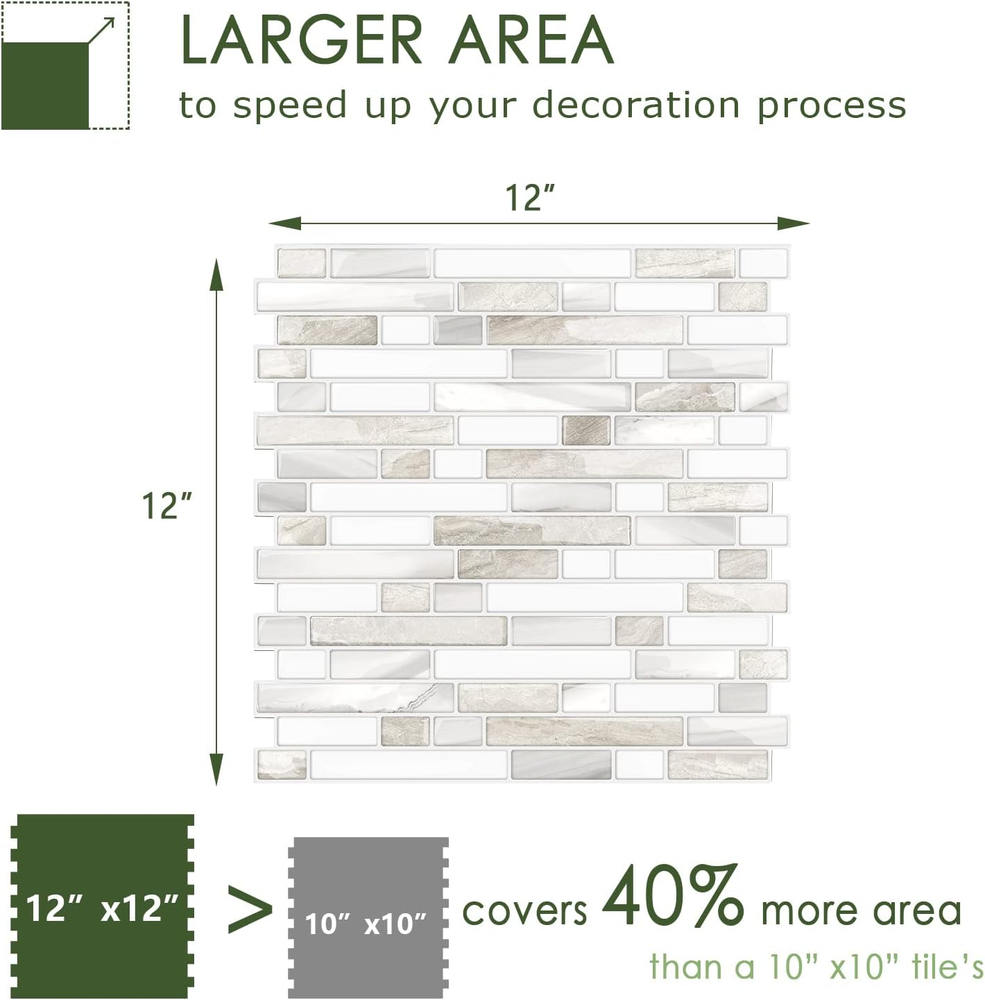 Store New Arrivals Add to Favorite View Feedback Contact Fast deliveries to the customer's home Quality customer service John Make the customers happy! Thicker Design Peel and Stick Tile Backsplash, 12”×12”Stick on Backsplash for Kitchen, Self Adhesive Tile for Kitchen Backsplash and Bathroom(10 Sheets,Beige & White) Description 2-3 Times Thickness: Much thicker than ordinary peel & stick tile, 2mm-2.5mm each, durable and solid tile, unlike soft sticker tiles Stronger Upgrade Adhesive: 3X Stronger backing glue than ordinary vinyl backsplash tile, not only stick firmly to the smooth surface, but also available on lightly textured wall 1.4 Times Coverage Area: 10 sheets thickened self-adhesive tiles, 12" X 12" each, which covers 40% more area than 10"x10" tile Widely Use: Perfectly decorated in kitchen island walls, bathroom backsplash, shower, fireplace, and installed behind the stove Easy Do It Yourself: Just peel, interlock and stick. No need to overlap, no grout and no mess, save your time and money on labor Product Description STICKGOO Peel and Stick Backsplash Tiles, Self Adhesive Kitchen Backsplash (Thicker Design) Exclusive Technology: Much Thicker than Others STICKGOO tiles are 2-3 times (2-2.5 mm) thicker than most peel & stick tile (1 mm) on the market, solid tile and more durable High Waterproof & Heat Resistance Performance The only stick on tile can be applied on shower, especially design for kitchen island walls, bathroom backsplash New Upgraded Powerful Backing Glue High quality adhesive, 3X Stronger than ordinary self adhesive tile. Stick firmly to the wall, don't worry about peel off Interlock with Each Other and Easy Do It Yourself No need to overlap each other like sticker tiles. Just interlock one by one, save your time and money on labor The Best Choice For Remodeling Kitchen & Bathroom STICKGOO is a leading & professional brand specializing in 3D-gel tile. We have a dedicated design team and a factory with advanced production technology. We are committed to providing customers with a variety of high-quality and cost-effective products. The products you receive are shipped directly from the factory, saving you the agio earned by dealers. NOTE: Please consider 3-5% cutting loss and purchase enough tiles at a time to make sure they come from the same batch to avoid slight color difference. Use a level or chalk line to create at least one vertical and one horizontal reference lines to guide tile placement. Reinforce with a laminated roller after installation. Recommend to use tile trim and caulk (or glass glue) if contact with water. The new painting walls need to dry for 3 weeks, make sure the wall is completely dry and dust-free. The surface of the tile will be sticky and the stickiness will disappear with time. You can use sponge cleaning products and non-corrosive soapy water to clean it. Item model number 02A-T12 Style Modern Item Thickness 2.5 Millimeters Pattern Oblong Country of Origin China Batteries Included? No Usage Backsplash Tiles for Kitchen & Bathroom Unit Count 10 Square Feet Batteries Required? No Finish Polished Material Vinyl Installation Type Peel and Stick Edge Style Square Edge Form Factor Rectangular tile (12x12 inches) Manufacturer Direct Item Package Quantity 10 Water Resistance Level Waterproof Item Weight 1.12 Kilograms Special Features Waterproof Special Feature Waterproof Part Number 02A-T12 Color Beige & White Finish Type Polished Shape Rectangular Recommended Uses For Product Wall Size 12x12 Inch Product Dimensions 12"L x 12"W Number Of Pieces 10 ABOUT US We offer the best prices around on high quality products. Our E-store includes media such as books, movies, music and games while offering electronics, toys, sporting apparel, clothing, tools, general home, garden items and more. SHIPPING We are always working hard to ensure your package arrives as soon as possible. Please understand that some factors like weather, high postal traffic, and the performance of shipping companies are outside of our control. We offer free shipping to the lower 48 states and ship within 2 business days of payment, usually sooner. We do not accept P.O. Boxes. Please provide a physical address. For shipping outside of the continental USA, we only use eBay's Global Shipping Program. The item is shipped to KY and then sent to the rest of the world. International customers are responsible for all duties and taxes. Continue to 'check out' to calculate costs for shipping the item to your country. Messages regarding eBay's Global Shipping Program MUST be directed at eBay EXCLUSIVELY. RETURNS We offer a 30-Day Return Policy on items in which you are not completely satisfied with. You have the option of a full-refund or an exchange of the item. No returns are available on items shipped outside of the USA PAYMENT We accept PayPal. CONTACT US This page content is yet to come Please ad us to your favorite seller and visit again later Thank You CUSTOMER SATISFACTION We try our very best to make sure every customer is completely satisfied. If there's a problem, message us! We're happy to help. WE ACCEPT