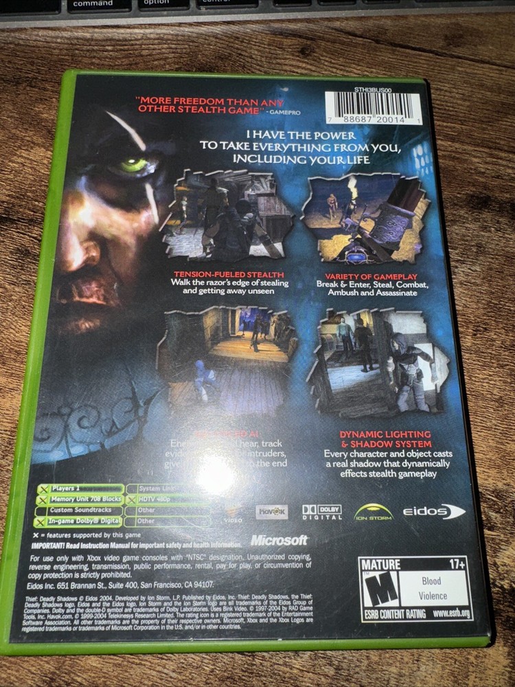 Immerse yourself in the world of Thief Deadly Shadows for Xbox, a thrilling game that combines extreme sports, stealth, wrestling, and sneaking. This complete edition includes the game manual and is rated M for mature audiences. Experience the excitement of a fantasy world with battle and strategy elements, all while playing as a detective in search of clues. This game is compatible with NTSC-U/C (US/Canada) region codes and was released in 2004 by Eidos. Get ready for an action-packed adventure with Thief Deadly Shadows.