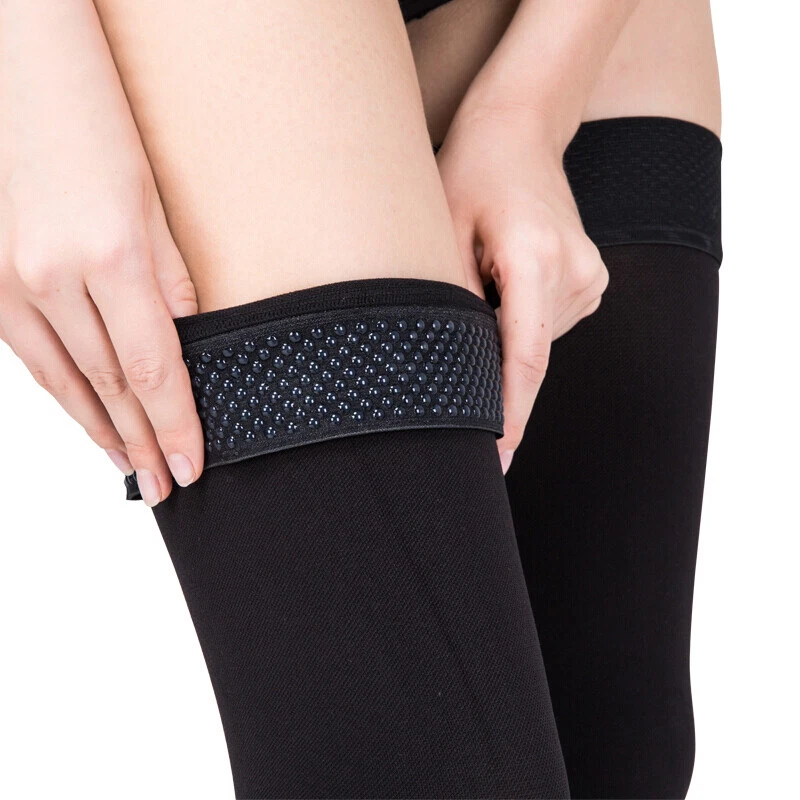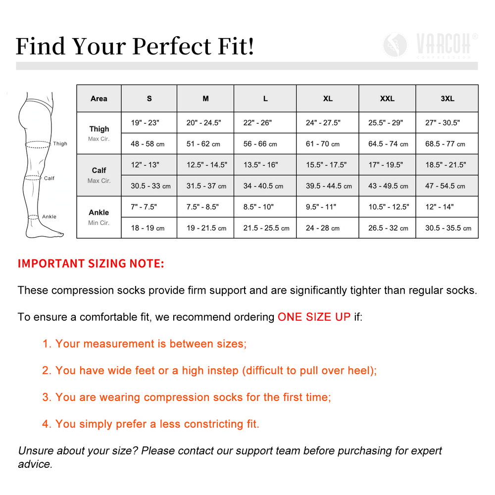 Store Categories Store Categories Other Thigh High 30-40 mmHg Compression Stockings Medical Varicose Vein Relief Edema Product Description 30-40 mmHg Compression This stocking provides 30-40 mmHg of gradient compression and should be worn under a doctor’s supervision. This level helps relieve severe varicosities, severe edema (swelling), and chronic venous insufficiency. It helps during healing after surgical and sclerotherapy procedures and helps prevent venous ulcerations. This level also helps relieve superficial thrombophlebitis. 30-40 mmHg Very Firm Gradient Compression Indication Guide: ▸ Moderate varicose veins with mild to moderate swelling (also during pregnancy) ▸ Post-procedure of larger veins to maintain treatment success ▸ Prevention, management and treatment of DVT or Post-Thrombotic Syndrome ▸ Superficial phlebitis ▸ Mild lymphedema after decongestant therapy to maintain reduction ▸ Orthostatic/postural hypotension ▸ Post-fracture, post-traumatic edema Feature: Brand: VARCOH ® Series: Medical Gender: Unisex | Women | Men Compression Level: 30-40 mmHg Fabric: 70% Nylon, 30% Spandex Colors: Beige, Black Sizes: S – 4XL Age group: Adult Package Includes: 1 Pair Suitable for sports, training, travel, fitness, office personnel, aircraft passengers, rehabilitation. All in all, a veritable necessity for anyone working long hours standing on their feet, or those heavily invested in athletics and a fitness lifestyle. Great gift for your loved one or friend. 100% money-back guarantee. Finest product and service guarantee. Your satisfaction and health is our goal. Enjoy your shopping. Shipping Size Chart Return / Exchange Washing FAQ Shipping Free Shipping and Fast Delivery - VARCOH ® We offer free standard shipping on all orders within the U.S., including Puerto Rico, other US Territories. ( No minimum order is required! ) FREE 📦 Continental U.S. 3-10 Business Days By default, your order will be shipped by USPS Standard Shipping ( USPS First Class ® ). FREE ✈️ PR, Territories & APOs 7-15 Business Days For orders to Puerto Rico , other US Territories , and Military APOs , please allow extra time to receive your order. Please note that we ship from Monday to Friday Shipping Information We have 3 warehouses in the U.S.: Rowland Hghts, CA 91748 Houston, TX 77090 Hebron, KY 41048 Your package will be shipped from the warehouse closest to your order address . If the nearest warehouse is out of stock, it will be shipped from one of the other 2 warehouses. Items are generally dispatched within 1 business day after payment is cleared. Please contact us via eBay message if you do not receive them within 14 business days . Size Chart Compression Size Chart and Measuring - VARCOH ® Area S M L XL XXL 3XL cG ( Thigh ) Max Cir. inch: 19" - 23" cm: 48 - 58 inch: 20" - 24.5" cm: 51 - 62 inch: 22" - 26" cm: 56 - 66 inch: 24" - 27.5" cm: 61 - 70 inch: 25.5" - 29" cm: 64.5 - 74 inch: 27" - 30.5" cm: 68.5 - 77 cC ( Calf ) Max Cir. inch: 12" - 13" cm: 30.5 - 33 inch: 12.5" - 14.5" cm: 31.5 - 37 inch: 13.5" - 16" cm: 34 - 40.5 inch: 15.5" - 17.5" cm: 39.5 - 44.5 inch: 17" - 19.5" cm: 43 - 49.5 inch: 18.5" - 21.5" cm: 47 - 54.5 cB ( Ankle ) Min Cir. inch: 7" - 7.5" cm: 18 - 19 inch: 7.5" - 8.5" cm: 19 - 21.5 inch: 8.5" - 10" cm: 21.5 - 25.5 inch: 9.5" - 11" cm: 24 - 28 inch: 10.5" - 12.5" cm: 26.5 - 32 inch: 12" - 14" cm: 30.5 - 35.5 This size chart applies to all varcoh brand compression products. ▲ Please swipe right on the size table. >>> IMPORTANT SIZING NOTE: These compression socks provide firm support and are significantly tighter than regular socks. To ensure a comfortable fit, we recommend ordering ONE SIZE UP if: 1. Your measurement is between sizes; 2. You have wide feet or a high instep (difficult to pull over heel); 3. You are wearing compression socks for the first time; 4. You simply prefer a less constricting fit. Unsure about your size? Please contact our support team before purchasing for expert advice. How to Measure for the Perfect Fit Essential Tip: For accuracy, measure legs first thing in the morning before any swelling occurs. 1. Ankle (Crucial Step) Measure circumference at the narrowest part , just above the ankle bone. 2. Calf Circumference Find the widest part of your calf and measure around it. 3. Thigh Circumference Measure the widest part right under your buttocks. 4. Leg Length Stand straight. Measure distance from buttocks to floor . Return / Exchange 30-Day Returns & Exchanges Policy - VARCOH ® Shop with Confidence We maintain strict quality control to ensure every product is perfect. However, we are humans, and occasionally mistakes happen. If you are not 100% satisfied, we've got you covered. Quick Tip: Please inspect your package upon arrival. If anything is wrong (damaged, missing, or incorrect item), contact us immediately for a priority solution. Hassle-Free Return Process 1 Message Us First Before opening an eBay request, please contact us directly via eBay Message. We can often resolve issues faster (e.g., sending a replacement) without the formal wait times. 2 Pack It Up Ensure the product is in its original, unworn, and unwashed condition. Include the authorization form inside the package. 3 Get Refunded Ship it back via your local post. Once we receive and inspect the item, we will issue your refund within 7 business days . Issues with Delivery or Wrong Item? Don't Panic! If you haven't received your item, or the size/color is wrong, we take full responsibility . You don't need to worry about the loss. Response Time General Qs: Within 1 hour (Working hours) Verification: Within 24 hours (Checking with carrier) Please allow us a chance to fix the problem before leaving negative feedback. We promise a solution that makes you happy. "We aim to communicate in a friendly manner and solve issues during a pleasant chat. Nothing means more to us than providing the customer service you truly deserve." Washing How to Wash Your Compression St