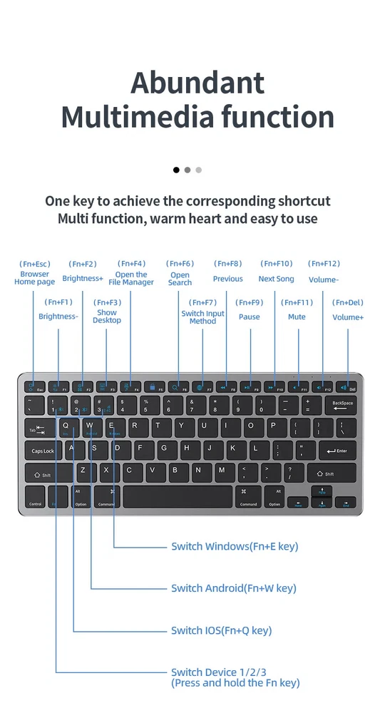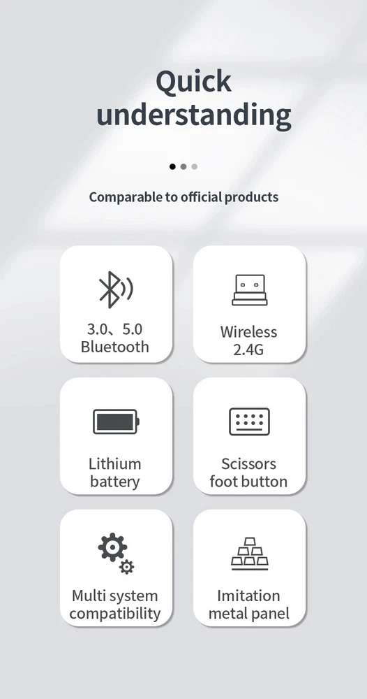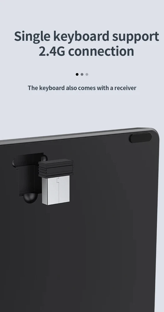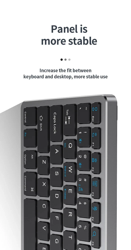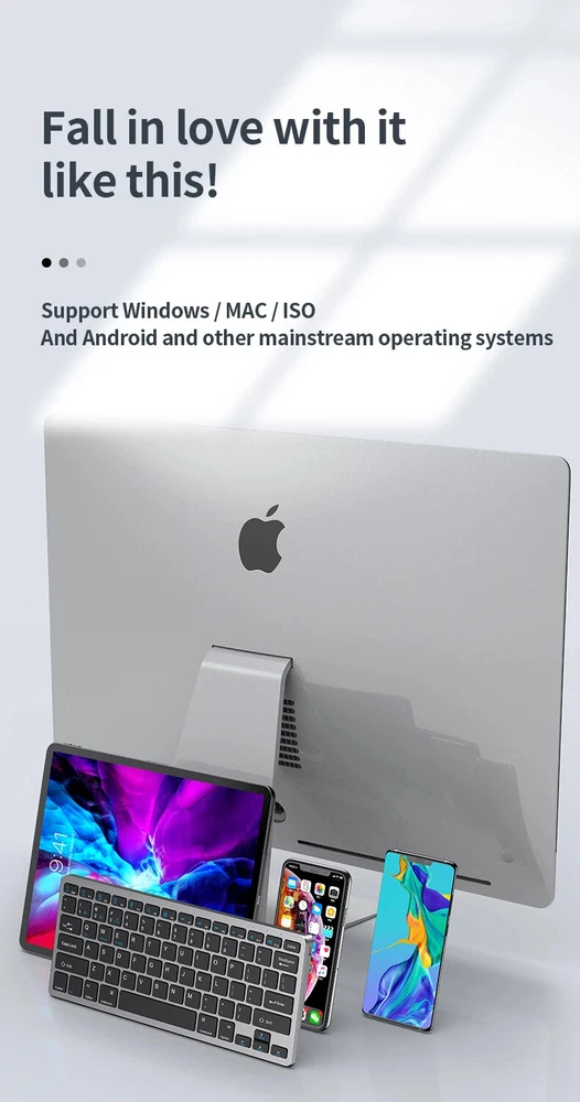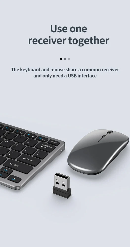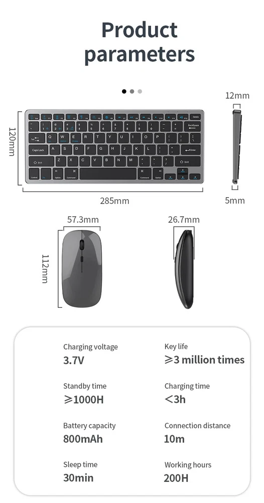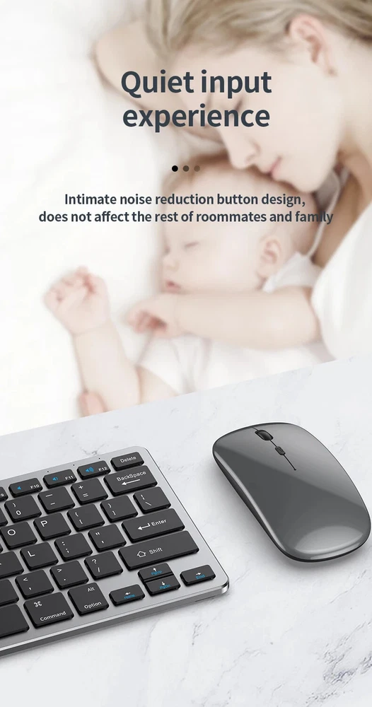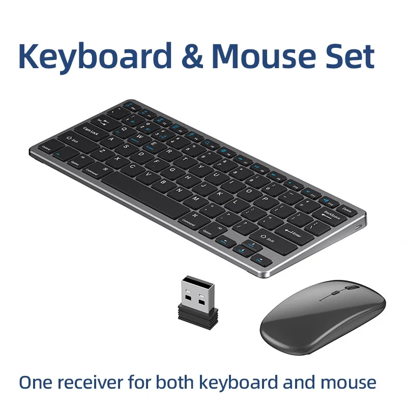 Thin Small Wireless Bluetooth 5.0&2.4G Keyboard,78 Keys,USB Charging. 6 Major Reasons To Choose This Keyboard 78-key simple design, multi-function keys to meet usage needs, small and slim appearance, easy to carry; Thickened ABS plastic body, thick feel, sturdy and durable; Supports BT 5.0+BT 3.0+2.4G, can connect to three devices such as PC, Pad, iPhone at the same time, through shortcut key selection, efficient and convenient to use; Compatible with Windows, Android, IOS multiple systems, adapt to a variety of device terminals, to meet the needs of various scenarios; Built-in battery, rechargeable design, charging for 3 hours, battery life up to 30 days; Silent button design, whether used at home or in the office, will not easily disturb others; Secifications Keyboard 1. Color: Tin Grey 2. Material: Thickened ABS 3. Button life: 3 million times 4. Wireless distance: 5-10m 5. Battery capacity: 800mAh 6. Charging cable length: 50cm 7. N umber of keys:78 8. Compatible Systems:Windows,Android,IOS 9. Rated voltage/current: 3.7V/18mA 10. Power supply typerechargeable (charging time 3 hours, working 200 hours) Mouse 1. Color: Tin Grey 2. Material: ABS 3. Button life: 3 million times 4. Wireless distance: 5-10m 5. Type: Ergonomic Optical Mouse 6. Resolution: 800 1200 1600 (default 1200dpi) 7. Operation mode: photoelectric type 8. Rated voltage/current: 3.7V/18mA 9. Power supply type: rechargeable (charging time 3 hours, working 200 hours) 10. Type: BT+2.4G wireless mouse 11. Buttons: 2 buttons, 1 scroll wheel (middle button) and DPI key Usage tutorials and steps Step 1: Take out the keyboard from the box and check whether the appearance is intact. Step 2: Remove the mini receiver at the bottom of the keyboard, insert it into the computer USB interface, plug and play. Step 3: Turn the power switch to ON to turn on the keyboard.The system defaults to 2.4G connection mode. Plug the receiver into the computer and you can use it. Step 4: In Bluetooth mode, press and hold the Fn function key + 1/2 number key for 5 seconds. When the blue light flashes, it enters the search state. Add it in the Bluetooth setting interface of the terminal device and you can use it. Kind tips: 1.This product has built-in lithium battery, keep away from fire sources. 2.The charging cable is included in the package, please check it carefully when unboxing. 3.When there is a delay in cursor movement, please plug the charging cable into the USB to charge. 4.It can be used when powered by USB, please stop in time when fully charged. 5.When the keyboard is not used for 30 minutes, it will automatically enter sleep mode and can be woken up by clicking the button.