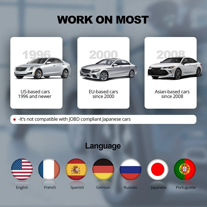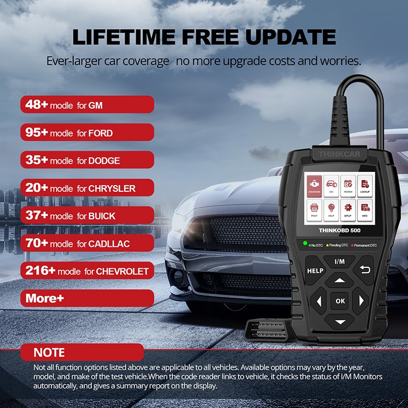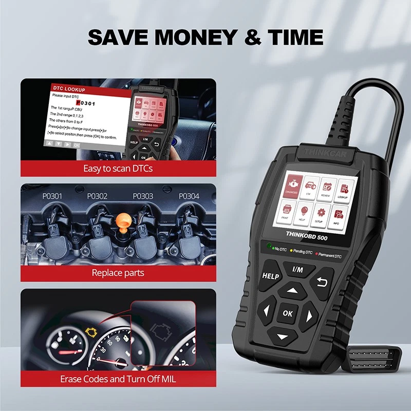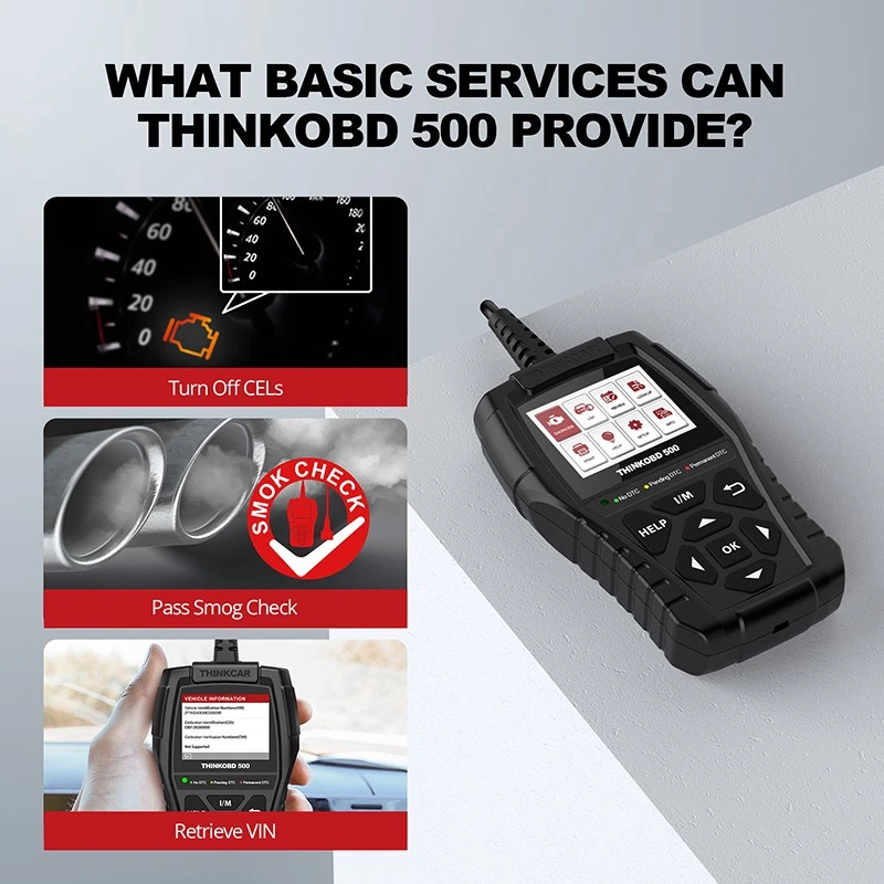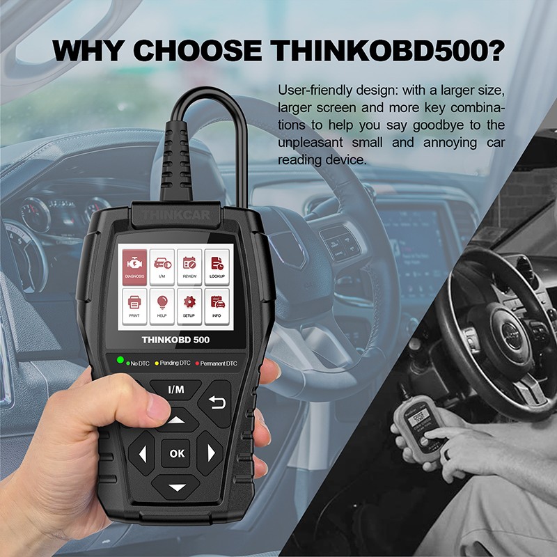 Product information THINKCAR was founded in Los Angeles, USA. It is made up of a group of partners who are passionate about car modification, are experts in vehicle maintenance, and master mobile internet technology. 80% of our team members have a technical background and have been engaged in research and technological development in related fields for many years. User experience is our top priority. We aim to integrate cutting-edge mobile internet technology with traditional automotive diagnostic and testing technology, and solve automotive diagnosis and testing problems more efficiently and conveniently. WHY CHOOSE THINKOBD500? -- THINKOBD 500 is equipped with 10 modes of full OBD2 functions, DTC lookup, and a 2.8-inch LCD color display. It is truly an outstanding OBD2 code reader, enabling DIY enthusiasts and mechanics to perform smog tests and fix basic engine and emission issues. -- THINKOBD 500 is an excellent diagnostic tool for vehicle Check Engine Light (CEL) issues, boasting practical diagnostic functions. It provides fast and accurate diagnosis for DIY users to avoid costly repairs: Locate faulty O2 sensors / loose gas caps / ... Pass smog tests; Verify repair effectiveness Turn off the MIL (Malfunction Indicator Light) All-in-One OBD2 Scanner – Keep Your Car Safe on the Road Supports all OBD2 protocols: ISO 14230-4 (KWP2000), ISO 15765-4 (CAN), ISO 9141-2 (ISO), ISO 14229 (UDS), SAE J1850 (VPW & PWM) THINKOBD 500 is compatible with most OBD2/EOBD-compliant vehicles, including U.S. cars from 1996 onward, European cars from 2000 onward, and Asian cars from 2008 onward. However, it is not compatible with JOBD-compliant vehicles. Supports 10 OBD2 test modes I/M and HELP hotkeys for quick testing 3-color LED display for different DTCs Supports data preview and printing DTC lookup and LCD color display What Makes THINKOBD 500 Stand Out? Beyond standard OBD2 functions, the THINKOBD 500 car code reader comes with a host of extra features. These allow DIY enthusiasts to handle repairs on their own and help mechanics significantly boost their work efficiency. Expand Your Diagnostic Capabilities – The HELP Hotkey Provides instant access to built-in help menus linked to the current DTC Offers advanced DTC queries to identify the detailed meaning, causes, and recommended solutions for trouble codes Enables you to diagnose and resolve vehicle issues independently 3-Color LED Display 3-Color LED Display - Shows the vehicle's health status at a glance. This diagnostic scanner displays different colors for different fault codes. Green - No fault codes; Yellow - Pending fault codes; Red - Permanent fault codes. Detailed Description of DTCs DTC Lookup - Turn this OBD2 scanner, OBD500, into an electronic dictionary of DTCs. Get a DTC explanation in 2 seconds. Enter the 5-digit code; View the detailed definition; Press the [HELP] button. View diagnostic tips/solutions for current DTCs. Data Sharing via Printing Data Printing – Print records stored in read codes or data streams and share your diagnostic data with others for further analysis. Connect the OBD500 to a PC; Download and run the update tool. Select and print the data. 2 shortcut keys to save time I/M hotkey: Use this OBD2 scanner to directly access the I/M readiness function and check if your vehicle is ready for emissions testing. Help hotkey: Quickly get detailed descriptions or tips for the current diagnostics. Robust and Durable The anti-collision structure makes this OBD2 scanner robust and durable. Turn off the check engine light The OBD2 scanner can quickly and accurately determine why the check engine light illuminates, helping DIYers or mechanics locate or even fix the problem. Simply clear the codes after a few repairs, and the light will automatically turn off. I/M Readiness for Smog Tests This OBD2 scanner's I/M readiness function allows you to check if the various emissions-related parts or systems on your vehicle are functioning correctly and ensure the monitors are ready for a smog test. If not, repair them before the smog test to pass and avoid fines. Retrieving Vehicle Information This OBD2 code reader can easily access the vehicle's ECU and retrieve its information, including VIN (Vehicle Identification Number), CID (Calibration Identification Number), and CVN (Calibration Verification Number), for accurate diagnostics. There's no need to search for the VIN. Intuitive Design Clearly arranged buttons, an easy-to-understand user interface, handheld size, etc., make this OBD2 scanner easy to use. Supports 8 languages Multilingual support: English\Spanish\German\Russian\Italian\French\Portuguese\Polish Wide Coverage The OBD2 500 diagnostic tool works with most OBD2/EOBD-compliant vehicles, such as 1996 and newer US cars, 2000 and newer European cars, and 2008 and newer Asian cars. However, it is not compatible with JOBD-compliant cars. Contents : 1 * Main unit with OBD cable 1 * Quick start guide 1 * Box