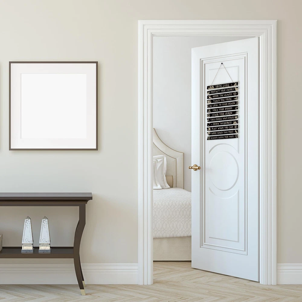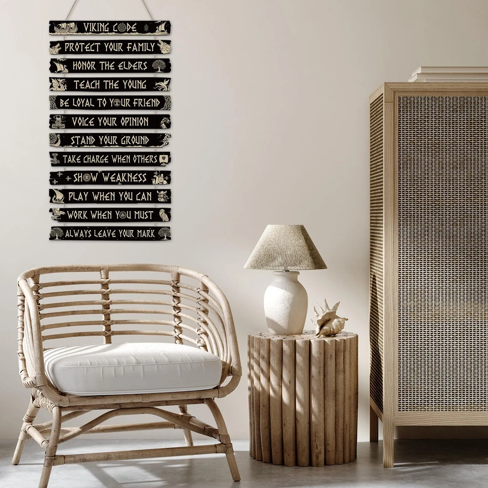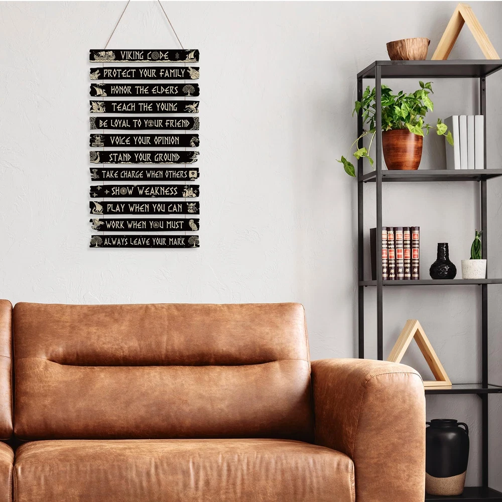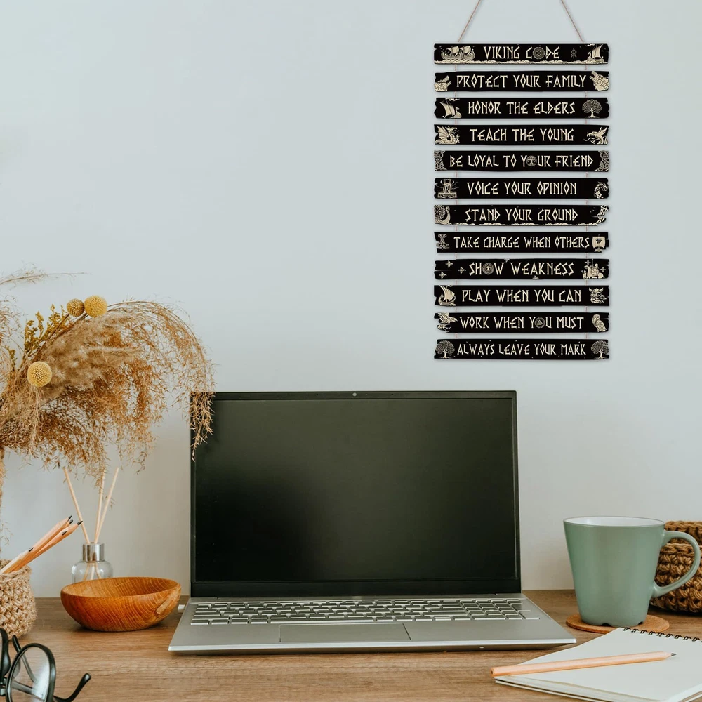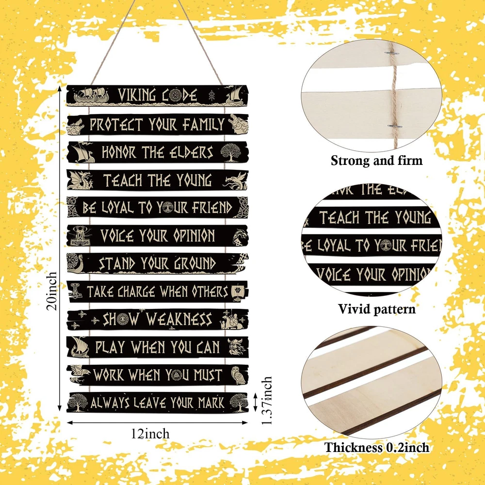 Inspirational Wooden Sign: Our inspirational wall decor consists of 12 pieces Viking style wooden board, each wooden board has inspirational words and Viking sign on it, which can easily meet your Viking style decoration needs and bring you positive strength in your life Reliable Material: Our Viking style wall art supplies are made of quality material, with clear print, quality and safety, light and solid, which is easy to install and remove, saving your decoration time, and can be applied for a long time. It will be a great wall decoration for your home Appropriate Size: A whole piece of the Viking rune wooden board measured approx 50 x 30 x 0.5 cm/ 20 x 12 x 0.2 inch, each wooden board is about 11.8 x 1.37 inches in size, which is the ideal size for any space. There is a certain space in the middle of each wooden board, which looks more comfortable Easy to Hang: Each wooden board has a rope for easy hanging on the wall, you can hang the Viking wall decoration set in the living room, bedroom, kitchen, yard and so on. You can also freely remove it to other places at will, creating a chic atmosphere for your life Viking Style Design: Various Viking themes printed on the wooden board, such as Vikings boat, Vikings compass, Nordic Viking sign, Celtics runes, black wooden board, golden words and patterns. It can be a nice gift that you can give to your friends, family, colleagues and more