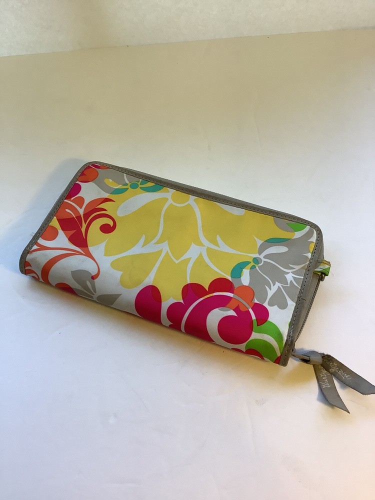 This Thirty-One Save Your Way Coupon Organizer Clutch is a must-have for any fashion-savvy woman. The Island Damask pattern adds a touch of elegance to the clutch, while the Save Your Way theme offers a practical and stylish solution for organizing your coupons. The clutch measures 8.5 inches in length and 5 inches in width, with a zip-around closure and dividers for easy organization. The clutch features inserts for added convenience, making it perfect for use as a purse or as a coupon organizer. The material is made of polyester and nylon, with a nylon fabric type and a pink, green, and yellow multicolor design. This clutch is a great addition to any collection and is perfect for anyone who wants to stay organized and stylish on the go. In excellent condition. May have very minor, unnoticeable staining. See all pics for condition