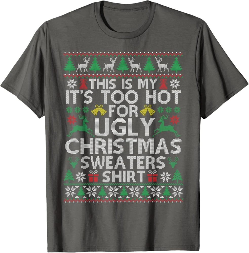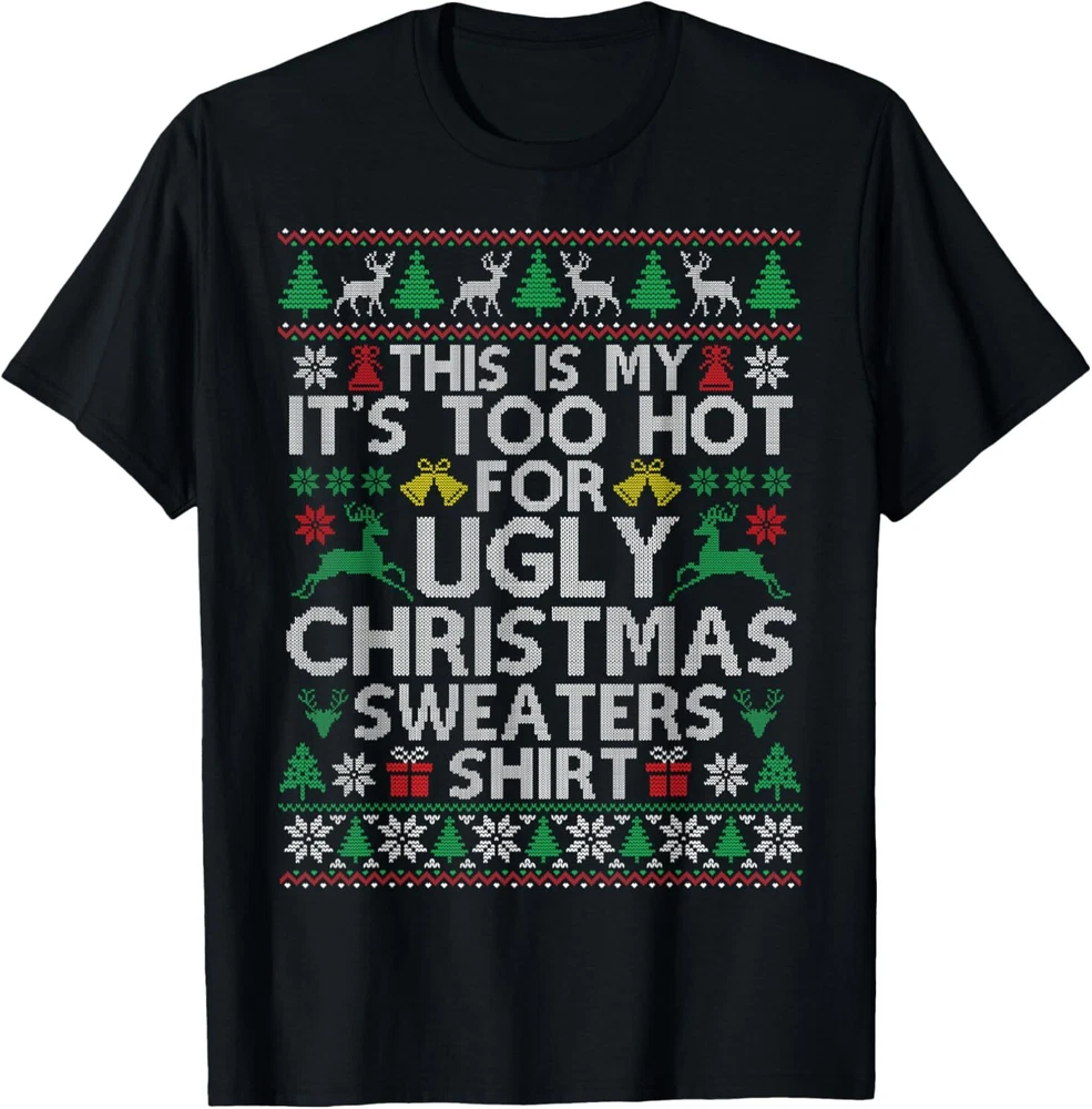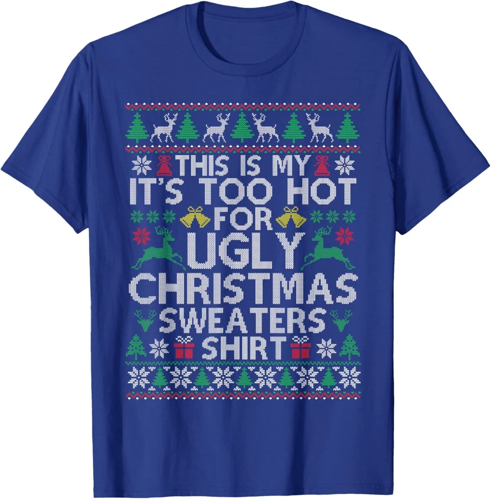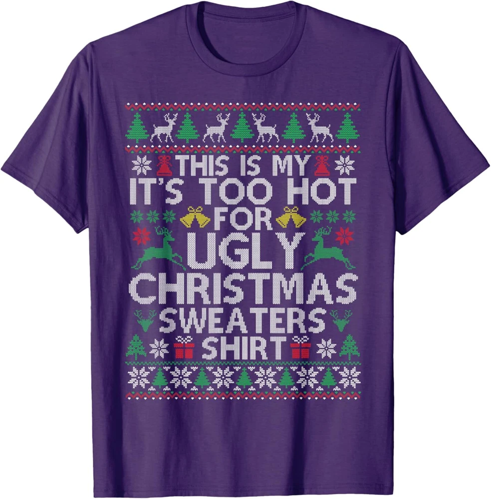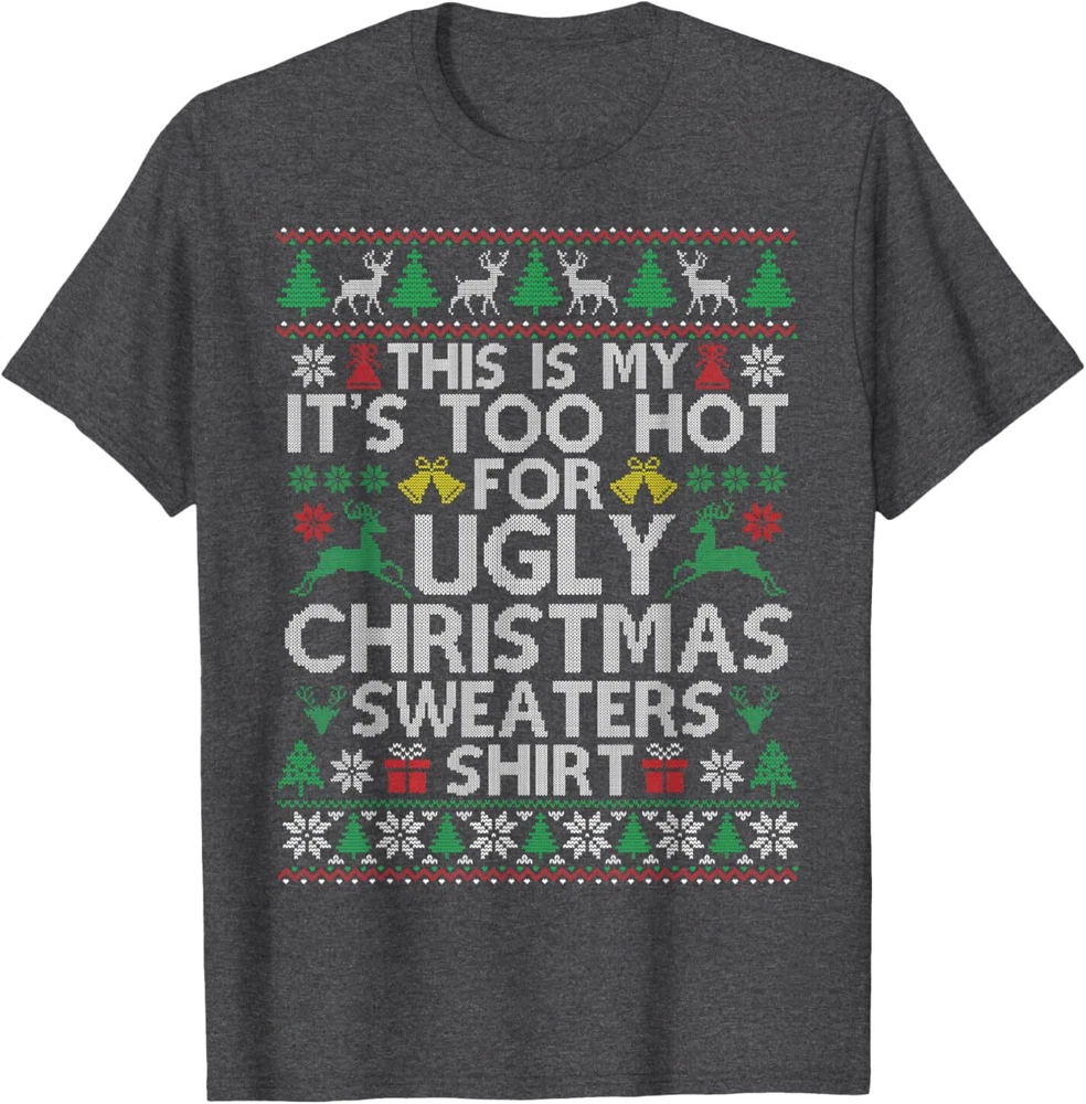 This Is My It's Too Hot For Ugly Christmas Sweaters T-Shirt Designed and Printed in USA Product Features: • Classic Look and Feel: This ultra cotton tee offer the timeless appeal of traditional cotton. The high-quality print enhances its casual appearance. • Material: Made from 6.1-ounce, 100% cotton. (Note: Dark Heather variant is 50% cotton, 50% polyester.) • Durability: Features double-needle stitching on the neck, sleeves, and hem for added durability. Designed for a roomy, unisex fit. • Print Type: DTG (Direct to Garment) • Manufacturer: Gildan 5000, 5000b (Made in USA) Shipping Information: • Handling Time: With POD(Print-On-Demand) product model, we typically require about 3 business-days handling time before shipping. In most cases, our handling time’s , rang e from 1-2 business days. • Delivery Time: • USA: Approximately 2 -6 business days • Canada: Approximately 6-10 business days (We currently don’t offer international Shipping) • Worldwide: Approximately 15-25 business days (We Currently don’t offer international Shipping) • Shipping Carriers: USPS and DHL • Note: Business days exclude weekends and holidays. Return & Exchange Policy: • Quality Guarantee: We stand behind the quality of our products and workmanship . Any defects or errors on our part must result in a refund/ replacement at no charge. • Conditions for Returns: Returns are generally not accepted for user errors such as incorrect selection of sizes, designs, or colors. Returns /Replacements are acceptable for damages such as poor printing results, incorrect size or design caused by us. • Note: Please reach out to us if there are any questions or issue s with your item, we’ll do our best to resolve any issue you might have. Note: • We’re glad to have your support! If you have a moment, y our honest feedback is very valuable to us. Thank you!