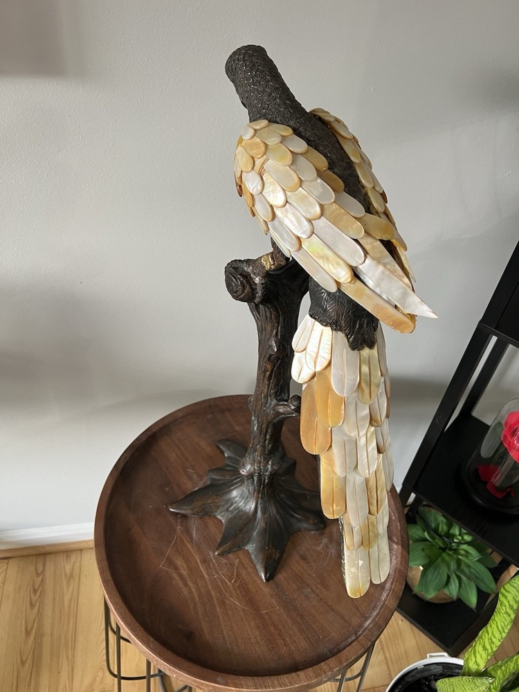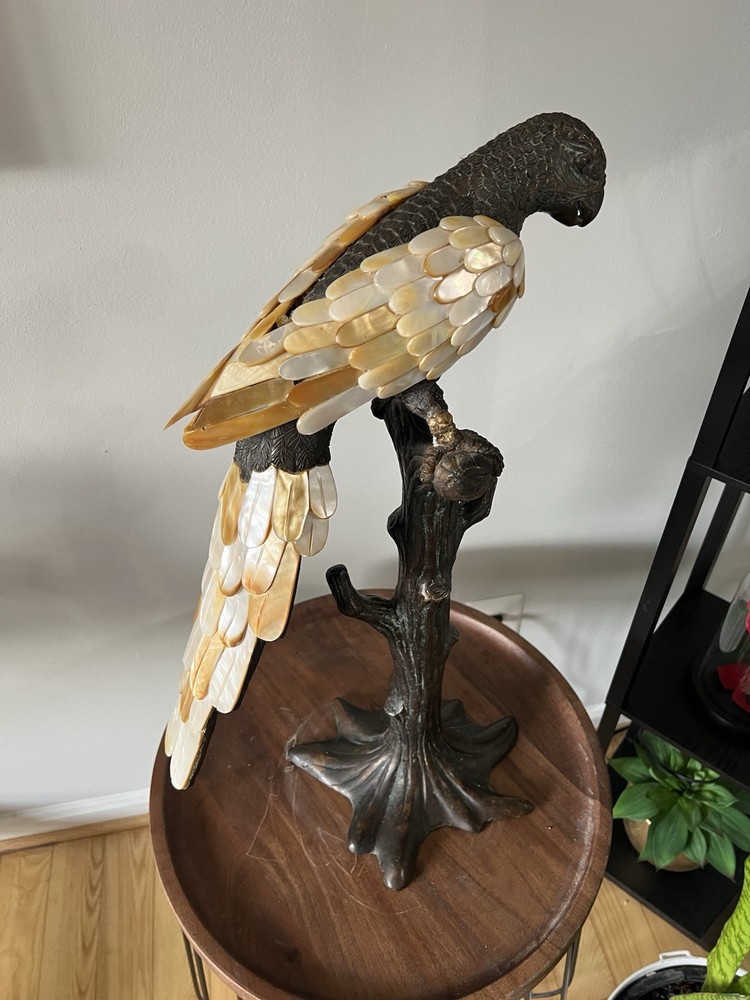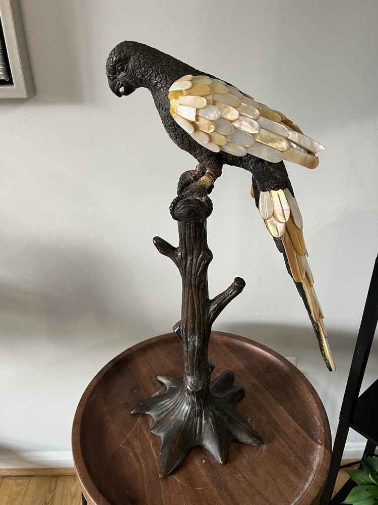 Summer discount: Maitland Smith bronze macaw parrot sculptures. With a rich verdigris bronze finish. featuring applied mother of pearl to the tail and wing feather. Modeled on a branch and tree form base. Original MAITLAND SMITH MADE IN PHILIPPINES foil labels to underside of one.