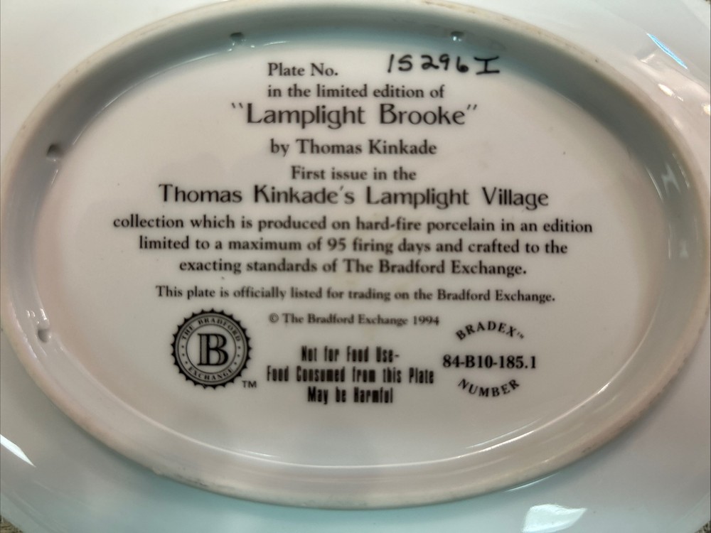 This beautiful oval collector plate by Thomas Kinkade features the charming scene of Lamplight Brook. The plate is a perfect addition to any collection of decorative collectibles. With its intricate design and exquisite craftsmanship, it is sure to impress any admirer. The plate is a great gift for any Thomas Kinkade fan or collector, and would make a perfect display piece in any home or office.