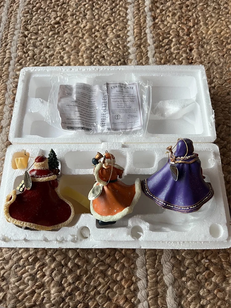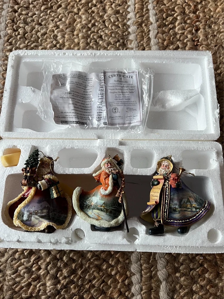Set of three Thomas Kinkade Old World Santa Christmas ornaments from Ashton Drake. From set #4. Includes COA and original packing.