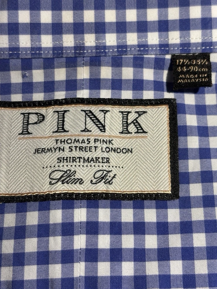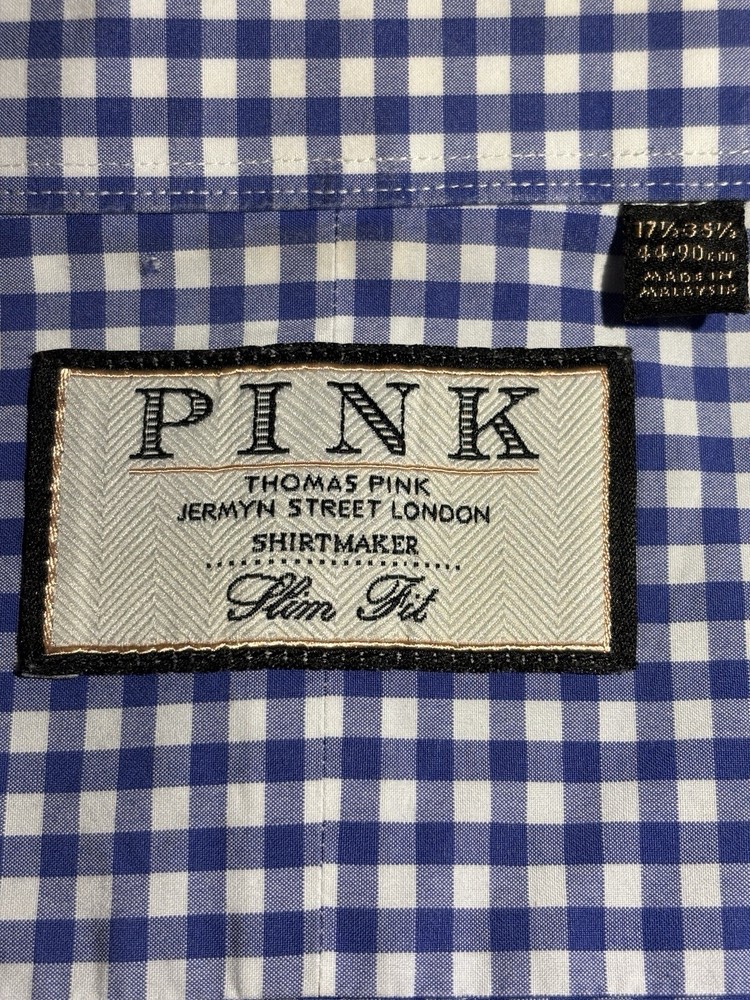 The Thomas Pink Jermyn Street London 17.5-35.5 Slim Fit Traveller Dress Shirt in Blue Check is a stylish and sophisticated choice for any formal occasion. Made from 100% cotton with a woven fabric type, this shirt features a collared neckline and long sleeves with a button closure. The slim fit and spread collar style add a modern touch to the classic design, making it a perfect option for weddings, parties, workwear, or business events. The blue check pattern and designer brand Thomas Pink bring a touch of London charm to this timeless and colorful dress shirt. C-22