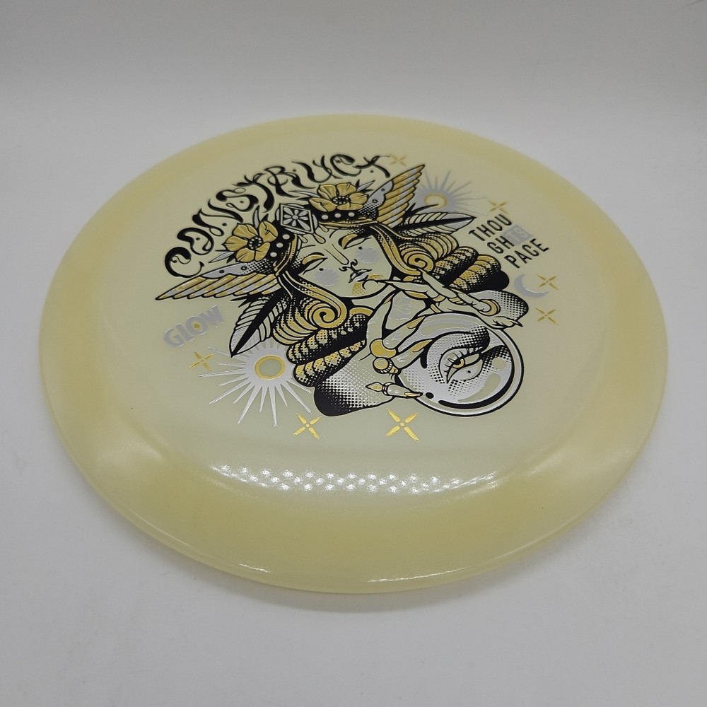 The Thought Space Athletics Soft Glow Construct Glow/Gold-Silver 170g disc is a premium plastic distance driver designed for disc golf enthusiasts. With a speed rating of 10 and a glide rating of 6, this special edition disc features a unique glow design that not only looks attractive but also enhances visibility in low-light conditions. Weighing 170 grams, this disc offers a balanced feel and is ideal for players looking to achieve long distances with each throw. The soft glow construct disc is a valuable addition to any disc golfer's collection, offering both aesthetics and performance.