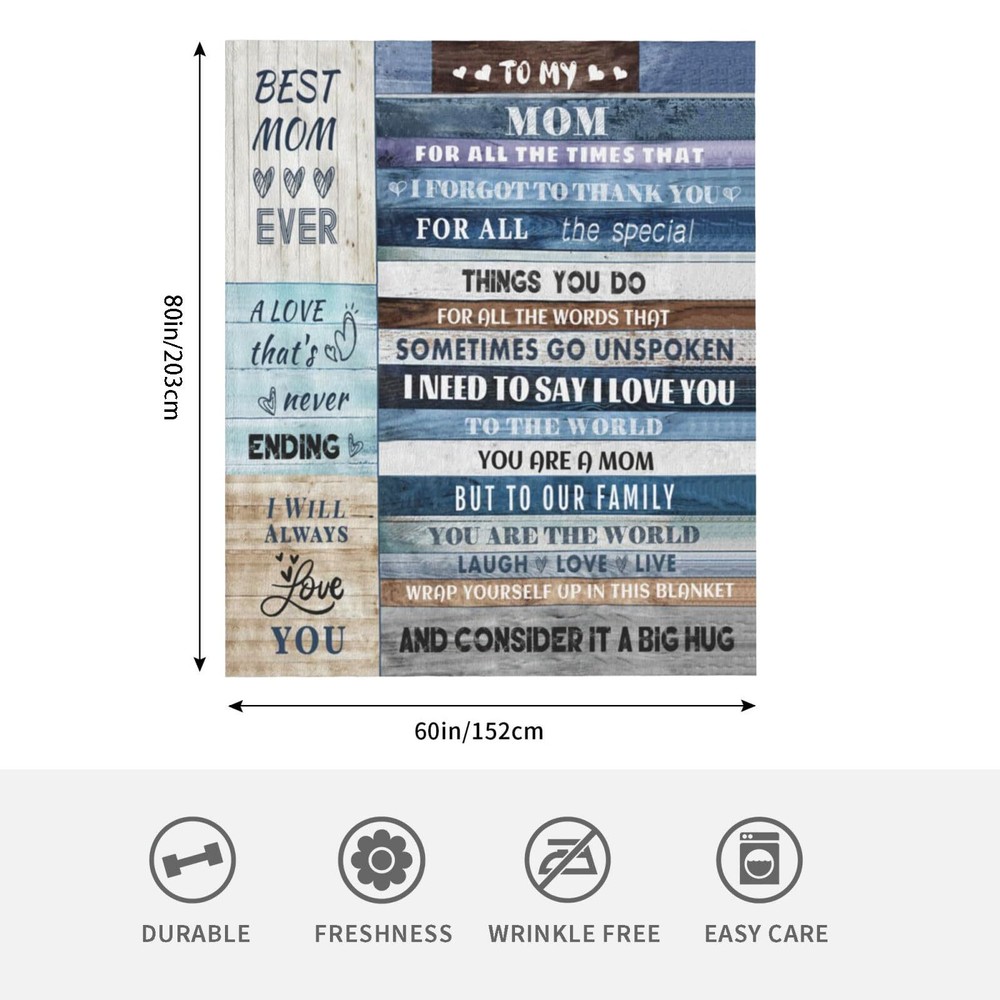 The Perfect Way To Add Color, Pattern, And Decor To Your Home. Whether On Your Sofa, Bed, Or Couch, This Soft And Fuzzy Throw Is The Perfect Addition For Any Living Room. Warm, Stylish, And Most Importantly Comfortable. 【Premium Material】This super soft throws blankets is made of premium microfiber flannel fleece, soft & light weight but still warm. Wrinkle and fade resistant, doesn't shed. Easy to care for, machine washable. When put on this blanket, your mom will feel its softness and warmth, bring her comfortable and relaxed feeling. 【Gift idea】Engraved with the text “Dear Mom Even When I'M Not Close By ,I Want You To Know I Love And Appreciate You , Always.Wrap Yourself Up In This And Consider It A Big Hug !!I Love You! ” and your mom will surely like it.The intent of this blanket is not only to bring warmth but also bring smile, Joy, and feeling of love. 【Size&About the wash】This ultra soft microfleece blankets are machine washable and hand washable, easy to dry, easy to care, durable, and do not use bleach. There are two sizes,50''x60'' and 60''x80''. You can choose according to your needs and preferences.This beautiful and fashion blanket is designed for luxurious feel and elegance. 【Gifts for mom】Gifts for mom, This soft blanket with pre-written warm words makes it to be a great gift choice for mother’s day, mother’s birthday, wife's birthday, Christmas, Thanksgiving, or Valentine’s Day. It’s a perfect present. Imagine the moment she opens the pack and realizes this is a perfect gift for her! 【Special occasions】This gift mom blanket makes a great presentation on Birthdays, anniersaries, Christmas, Valentines, Mother’s day, and other special times of the year. This thick fluffy blanket is suitable for all seasons, indoor and outdoor use. Use it as a bed blanket, living room sofa blanket, couch office spare blanket while reading, watching TV, or having a chat. Also, she can fold up it to go on holiday, camping, or travel.
