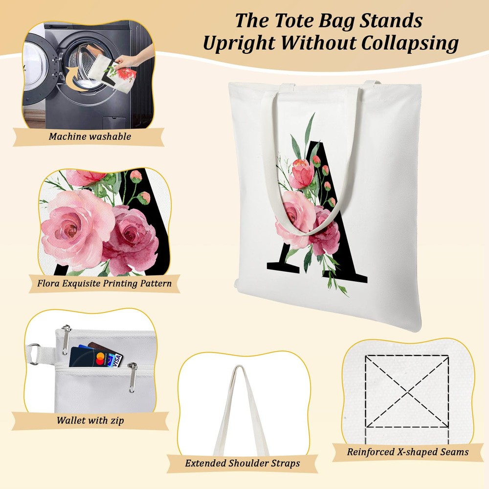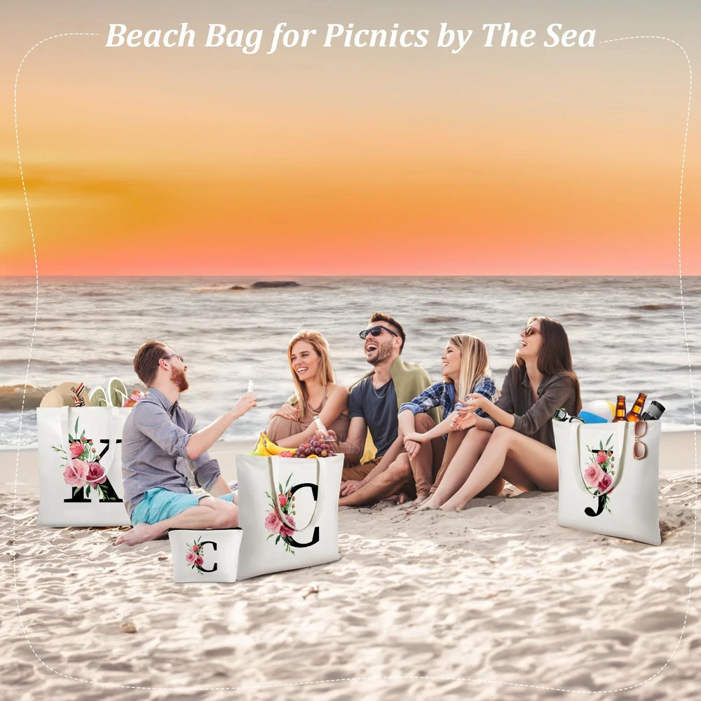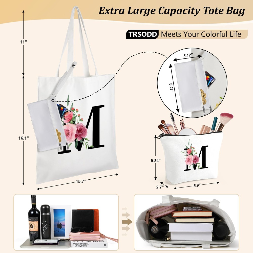 Sweet Perfect Gift Set: The thoughtful and exquisite gift set includes 1 uti-lity tote bag, 1 makeup bag, 1 exquisite gift box, 1 blessing card, both the gift box and the blessing card are made of high-quality materials, very beautiful. Interwoven mono-gram tote bags for bride, bride-to-be and bridesmaids at Bachelorette Party, Wedding Party, Bridal Shower Party, Engagement, Honeymoon. Christmas Gifts, Valentines day gifts, best friend gifts for women, Teacher's Day Gift, Thanksgiving Gifts. Inside Pocket, Cosmetic Bag and Front Pocket:The size of can-vas tote bag for women measures 17" x 11.8" x 7.8", personalized tote bags for easy portability or shoulder carry. Closeable 1x inner pocket, 1x large make-up bag for small items such as bank cards, keys, air mattress, sunscreen and tissues. The paneled canvas front pocket of work bags for women is perfect for storing magazines, flip flops, tablet, so that your items can be seen at a glance, you don't have to worry about finding them. Exquisite Colour Printing and Clever Design: Each character on the weekender travel bag is printed using a special technique that will not fade or distort. Exquisite and durable, your heart will never fade.Personalized tote bags are designed with a small pouch that can be closed, so that you can easily access and store small items such as mobile phones, bank cards, keys. The bottom of bag features upgraded reinforcement technology to better support the item and enhance the durability of the bag. Multiple Occasions and Versatility: First, place heavy, flat items like books and magazines on the bottom of the beach bag. Then, place your towels, clothes, shoes, pouches, etc. and follow with snacks and drinks. Finally, add sunglasses, sunscreen, swim goggles. At the same time, it can be used in many occasions, such as outdoor beach tote bag, cross body bag, reusable grocery bags, laptop bag, gym bag, weekender travel bag, travel cloth tote bag, thank you bags, overnight bag, gym bag. Matching, After-sales Service: The mono-gram tote bags are very versatile, the personalized tote bags can be matched with T-shirts, shirts, shorts, short skirts, long skirts, leggings, jeans, duffle shoes, sandals, sports shoes, sun hats, sunglasses, etc. 21" long handle for comfortable carrying or shoulder, and can be worn to suit your style. If you have any questions about our gifts bag , please feel free to contact us.