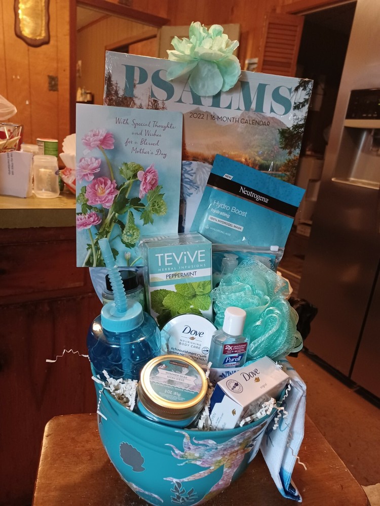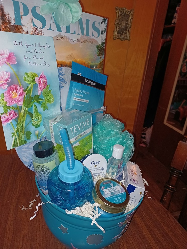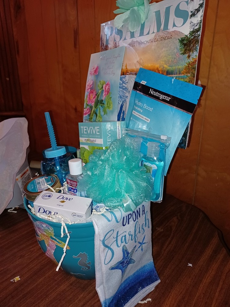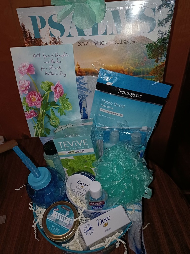 BEAUTIFUL MOTHERS DAY GIFT π. BEACHSHORE THEME, hair, face and body products π kitchen plate,bowl and towel set, candle, mermaid cup, peppermint tea, card,and psalms calendar , all in a large flower pot.