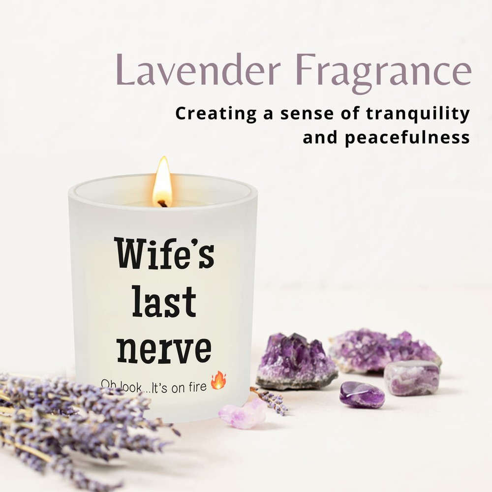 GIFTS FOR WIFE FROM HUSBAND: Let this scented candle show your affection humorously to your wife and remind her how much you love & care for her. Suitable for Birthday such as birthday gifts for wife from husband, wife birthday gifts from husband, birthday gift for wife, gifts for her birthday, birthday gifts for her, Mothers Day Gifts for Wife, or Valentine's Day such as valentine day gift for wife, valentine gifts for wife, valentines day gifts for her wife, valentines day for wife, valentines gifts for wife ... ANNIVERSARY GIFT FOR HER: Treat your wife to a candle and a smile. Ideal for romantic gifts for her on anniversary, wedding anniversary gifts for wife, anniversary gifts for her, wife anniversary gifts for her, anniversary gift for wife like 10 year anniversary gifts for her, 5 year anniversary gifts for her, 2 year anniversary gift for her... SWEET LAVENDER SCENT: This Valentine for Wife Candle is a light and lovely way to relax. It's scented with lavender essential oils, whose calming qualities are well suited for what ails you: stress, depression, insomnia. The soft fragrance will make your room full of faint fragrances and smell clean and fresh. 45-50 HOURS BURNING TIME: Our 100% premium soy wax melts evenly and consistently thanks to a lead-free wick. This candle burns for approximately 45-50 hours, giving you plenty of time to enjoy the warm light, fresh scent and peaceful atmosphere. MULTIPURPOSE USE: Lighting this candle can create a calm, relaxing environment, a lovely companion to home relaxation and morning yoga flow. After full use, this candle jar can be used for home decor and is also suitable for placing your small objects.