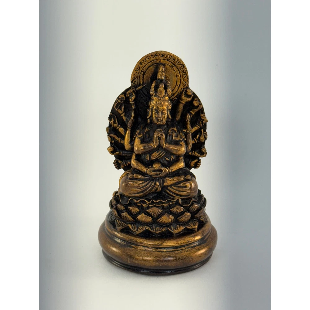 Size: 4.5" Bronze/Black Resin Thousand Armed Kwan-Yin The Bodhisattva of Compassion is here shown with many arms with which to help beings in need, and with multiple heads which can see in all directions in order to identify need and provide help. Avalokiteshwara Kanzeon Kwan Yin Quan Yin