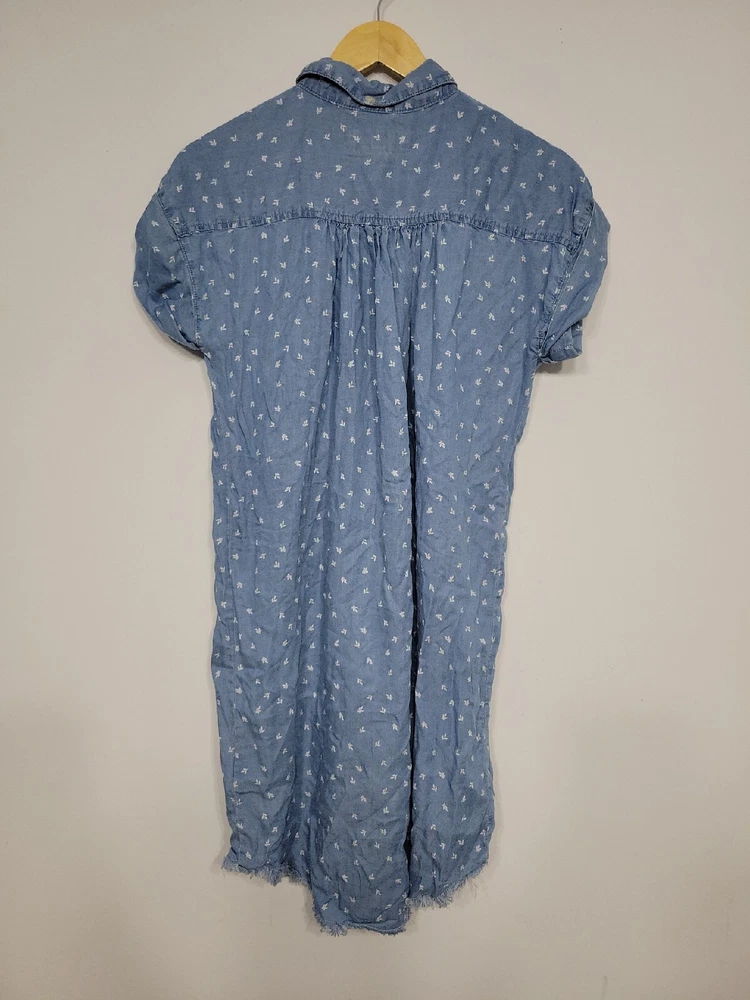 Thread & Supply Women’s Dress Size Small Button-up Fringe. Pre-owned great condition 100 percent lyocell Rolled stitched sleeve button-up t-shirt dress style with leaf detail print 34 inches long 20 inches across 2 front pockets G4F