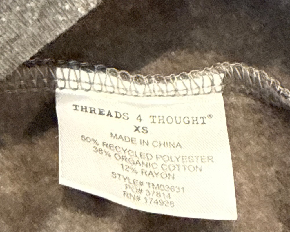 Threads 4 Thought most popular zip hoodie ever. Made from our sustainable triblend fleece, this ultra soft medium weight hoodie has the perfect amount of mechanical stretch and is built for everything from lounging to adventures. - Carbon Neutral - Sustainable Fabric - Zipper Front - Size - XS - Color - Gray - New with tags or EUC. No flaws - Material and Care Tag in Photos. 50% Recyled Polyester 38% Oganic Cotton 12% Rayon - Measurements approx laying flat Length 27" Armpit to Armpit 19" - Smoke and pet free home * I accept reasonable offers. * Same or next day shipping. * New items posted daily. * All used items are cleaned, washed, and/or thoroughly steamed before listing. * Bundle discounts in closet Thank you for your consideration. Size: XS