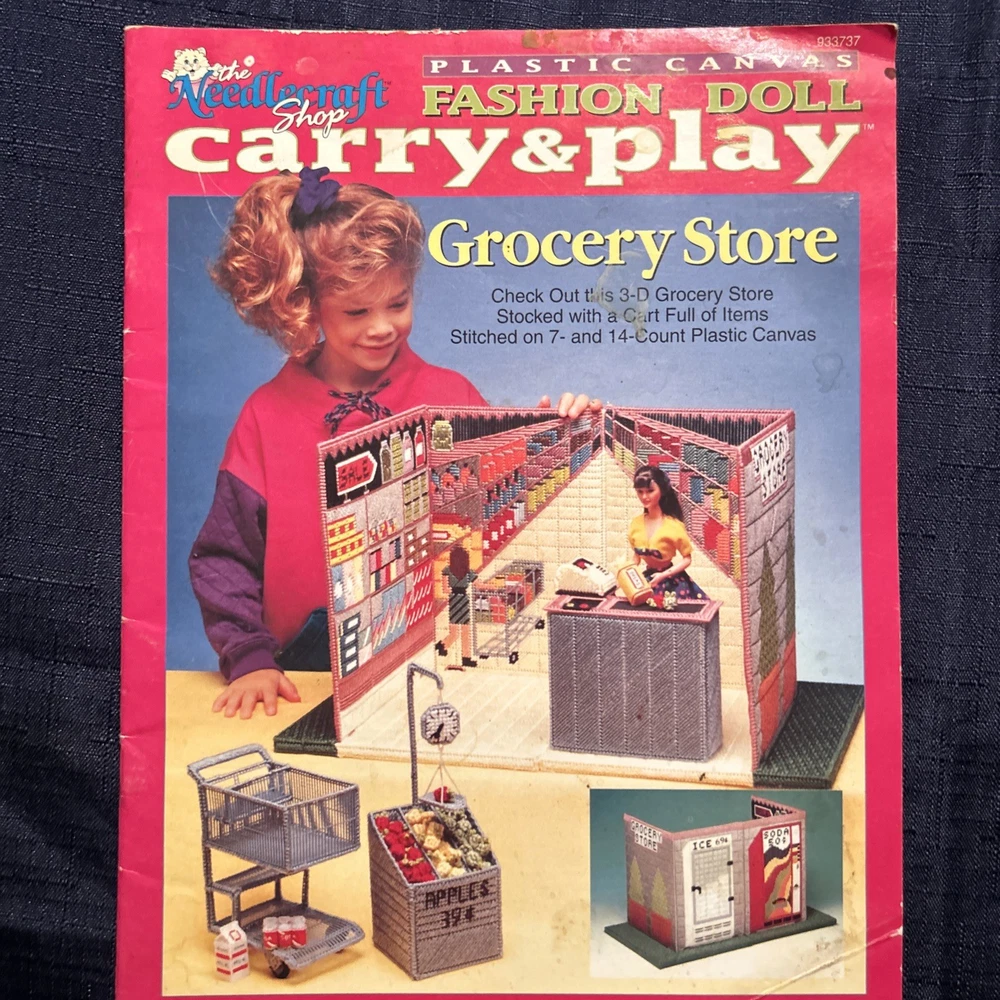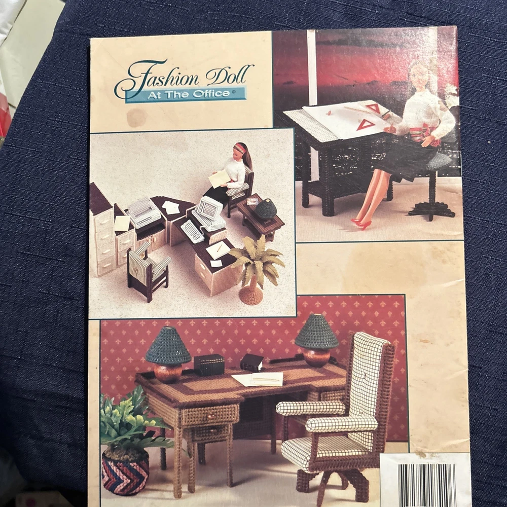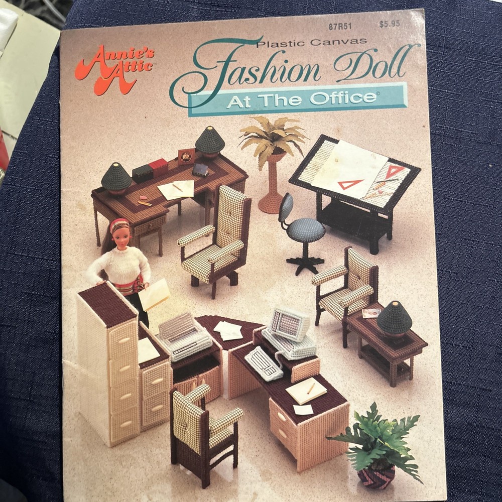 Three Annie’s Attic plastic canvas pattern booklets. 1-condo & snowmobile 87R52 , 2-fashion doll carry & play grocery store 933737, and 3-fashion doll at the office 87R51. All are in excellent condition. There are scribbles on the last page which is advertising so doesn’t affect patterns. All are clear and no bent or ripped pages.
