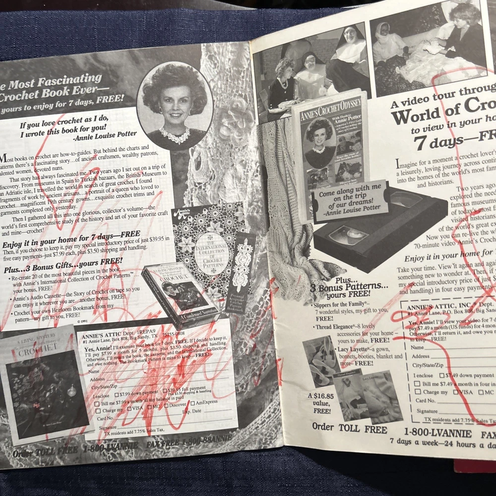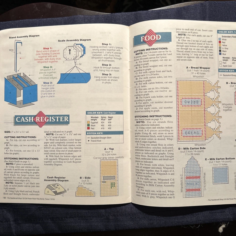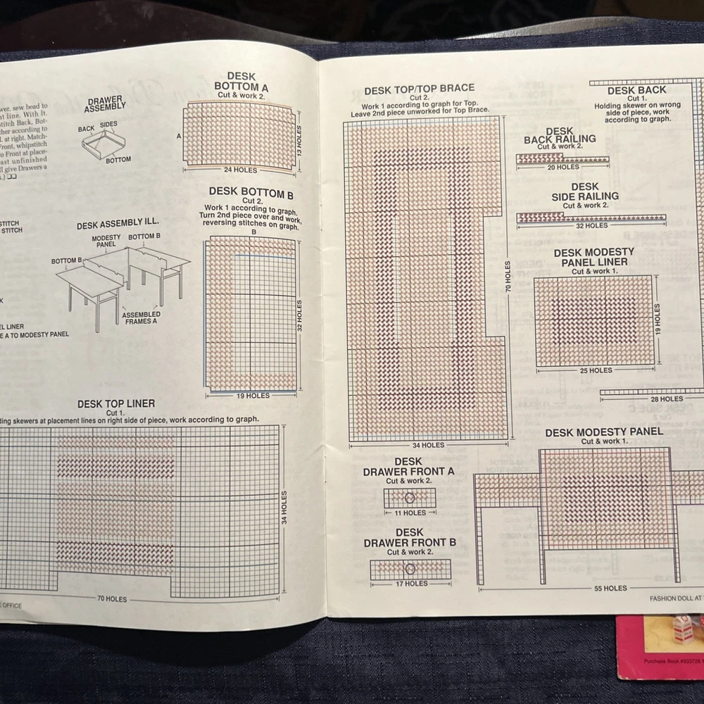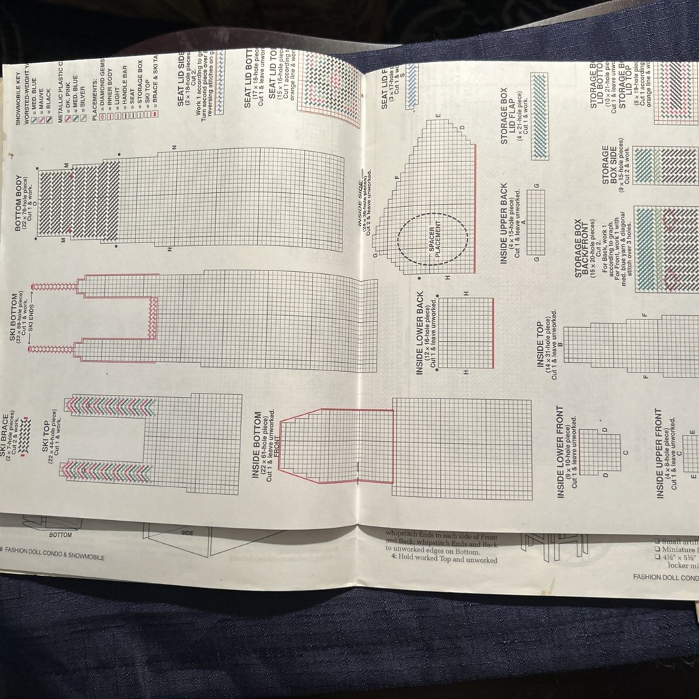 Three Annie’s Attic plastic canvas pattern booklets. 1-condo & snowmobile 87R52 , 2-fashion doll carry & play grocery store 933737, and 3-fashion doll at the office 87R51. All are in excellent condition. There are scribbles on the last page which is advertising so doesn’t affect patterns. All are clear and no bent or ripped pages.