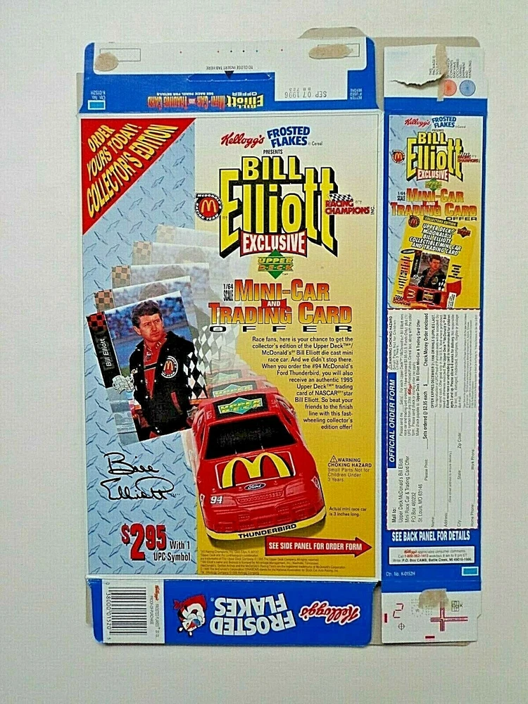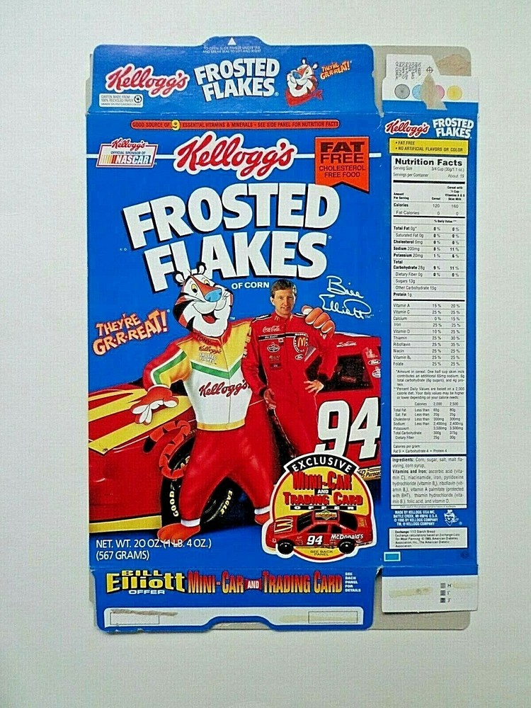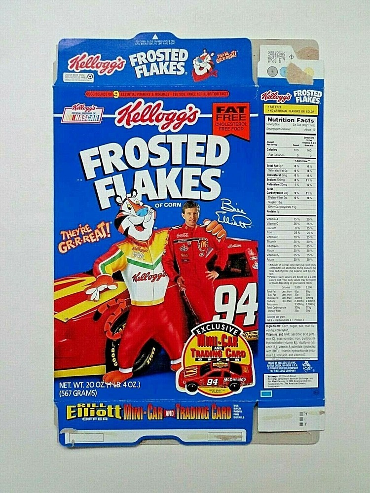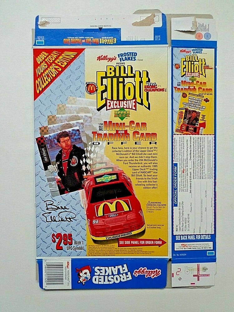 This is a lot of 3 Bill Elliott cereal boxes. One is a Wheaties box and 2 are Kellogg's Frosted Flakes. All have been flattened for easier shipping. Purchaser will include $7.00 to cover shipping and insurance. Please pay within 5 days of end of listing. Thanks for looking.