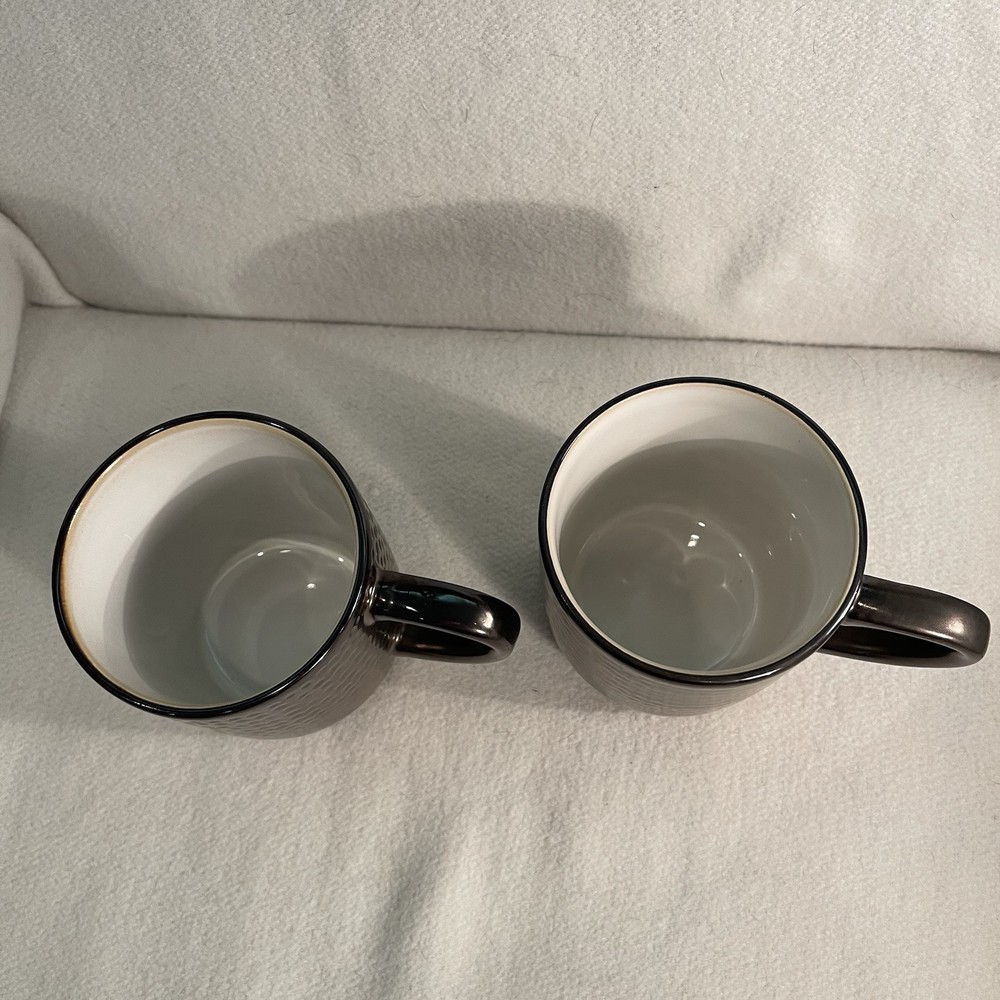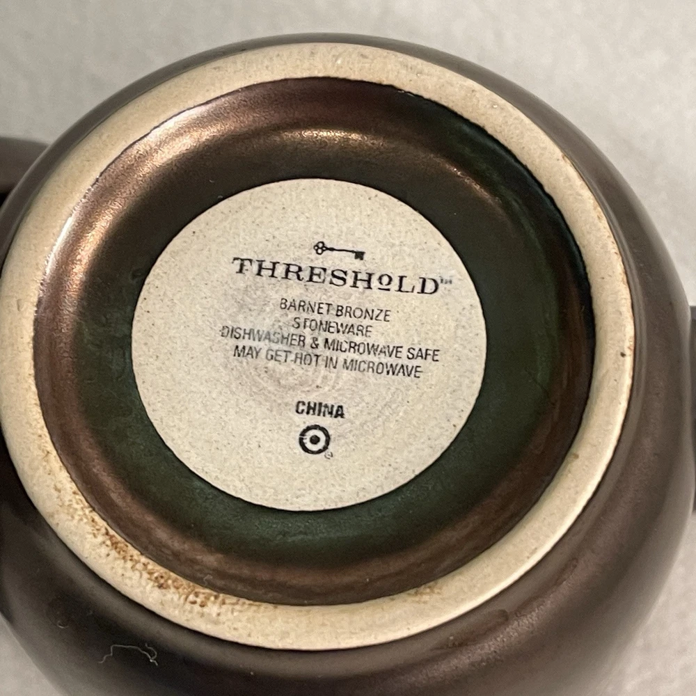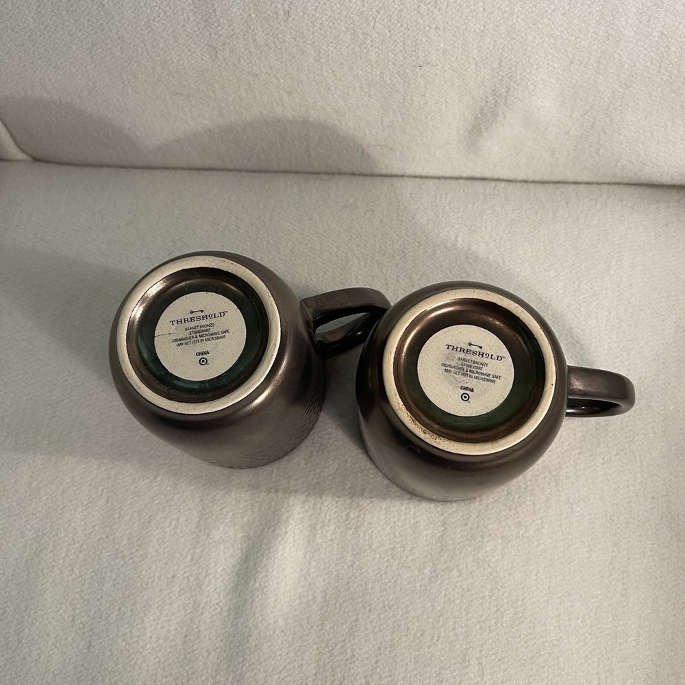 Elevate your morning routine with the Threshold Barney Bronze Stoneware Coffee Mugs. Each mug in this two-piece set showcases an elegant embossed dot pattern, enhancing the contemporary Barnet Bronze design. Crafted from durable stoneware, these round mugs are a blend of functionality and decorative appeal, ideal for any occasion. The mugs are designed to be both dishwasher and microwave safe, simplifying your daily chores. With a comfortable diameter of 3.5 inches and a height of 4.25 inches, they're the perfect size for your favorite hot beverage. The matte finish and art pottery production style make them a sophisticated addition to your home. Excellent condition. No chips or cracks.