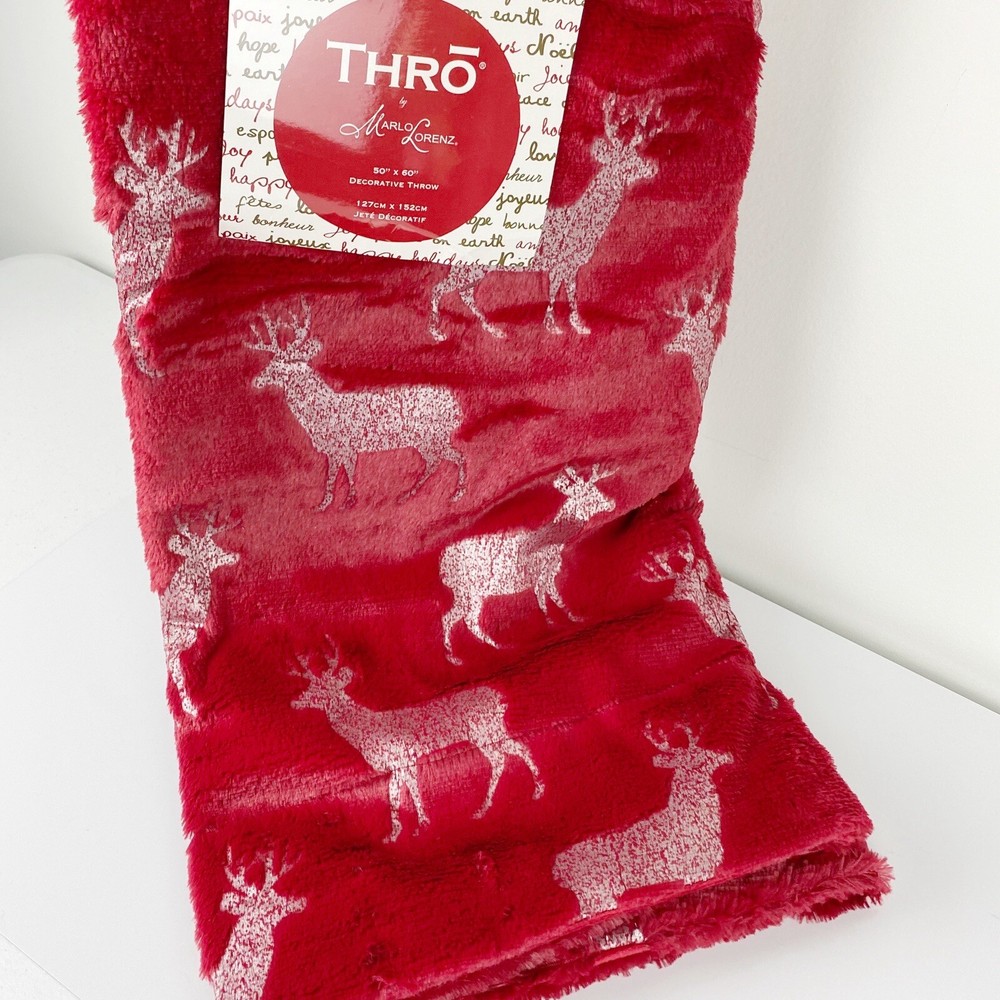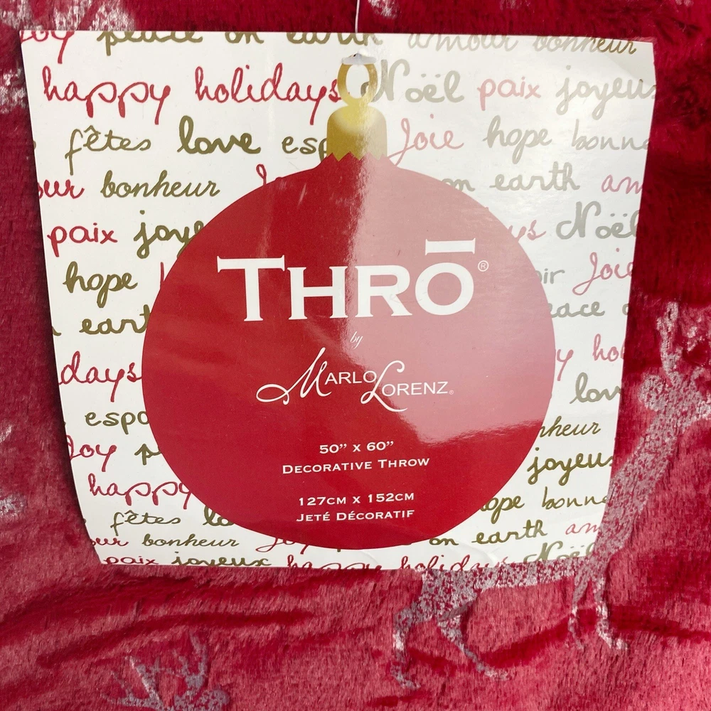 Snuggle up and get cozy this holiday season with this beautiful Thro Marlo Lorenz Reindeer Print Blanket Throw. The stunning red and silver color combination is perfect for adding a festive touch to your bedroom or living room. Features/Style: - Reindeer Print - Christmas - Machine wash in cold water on the gentle cycle. Use only non-chlorine bleach as needed. Tumble dry using the air setting (no heat) or line dry. Size: 50"×60" Color: Red/Silver Condition: NWT, Smoke Free Home