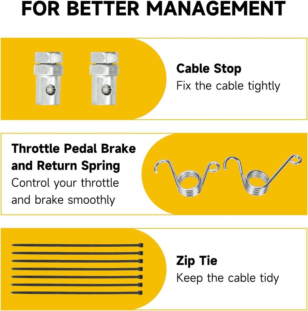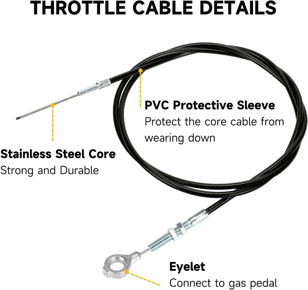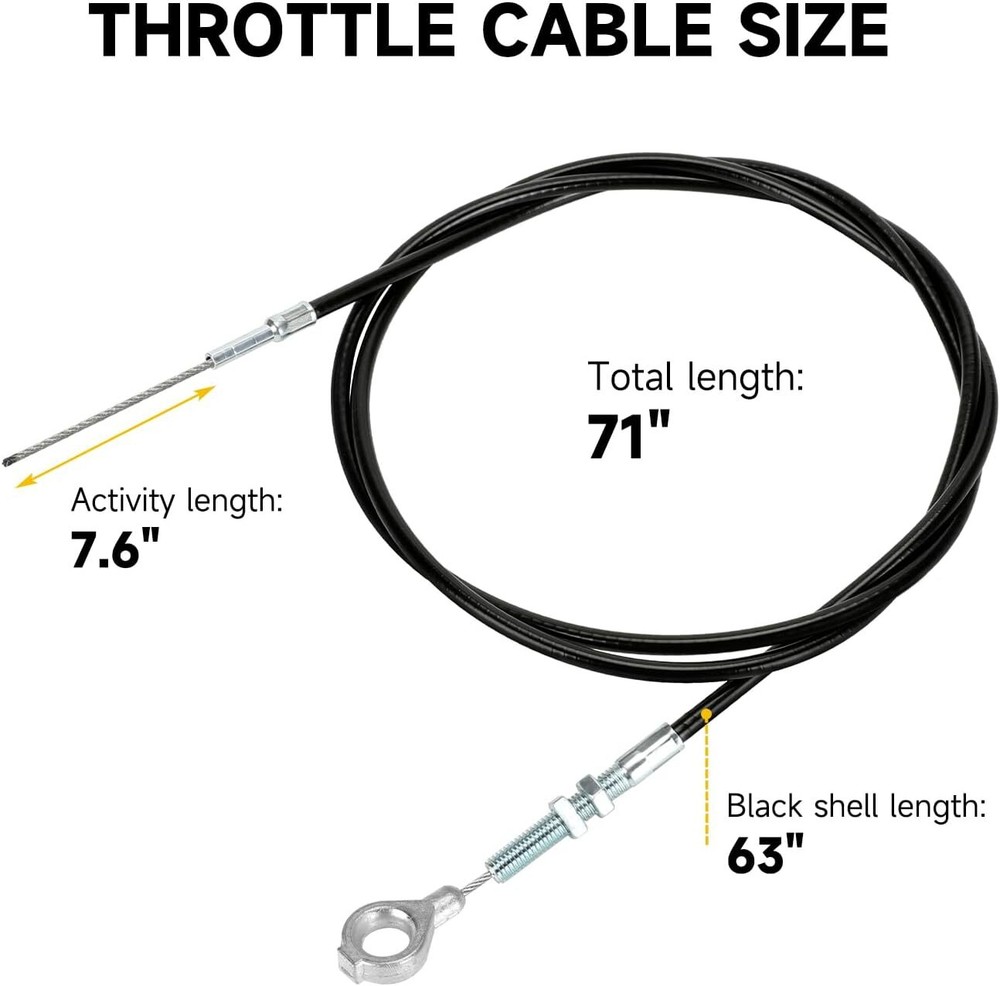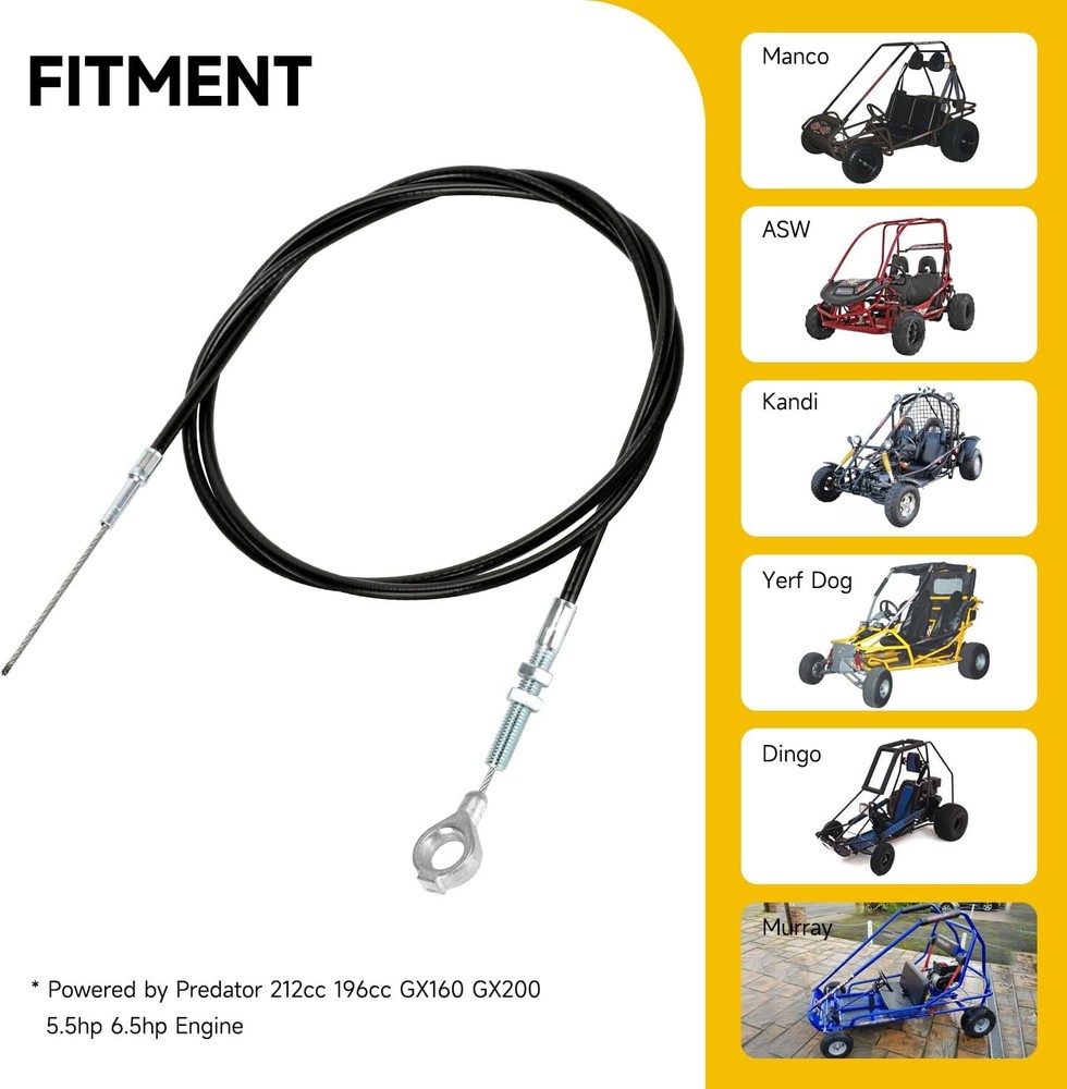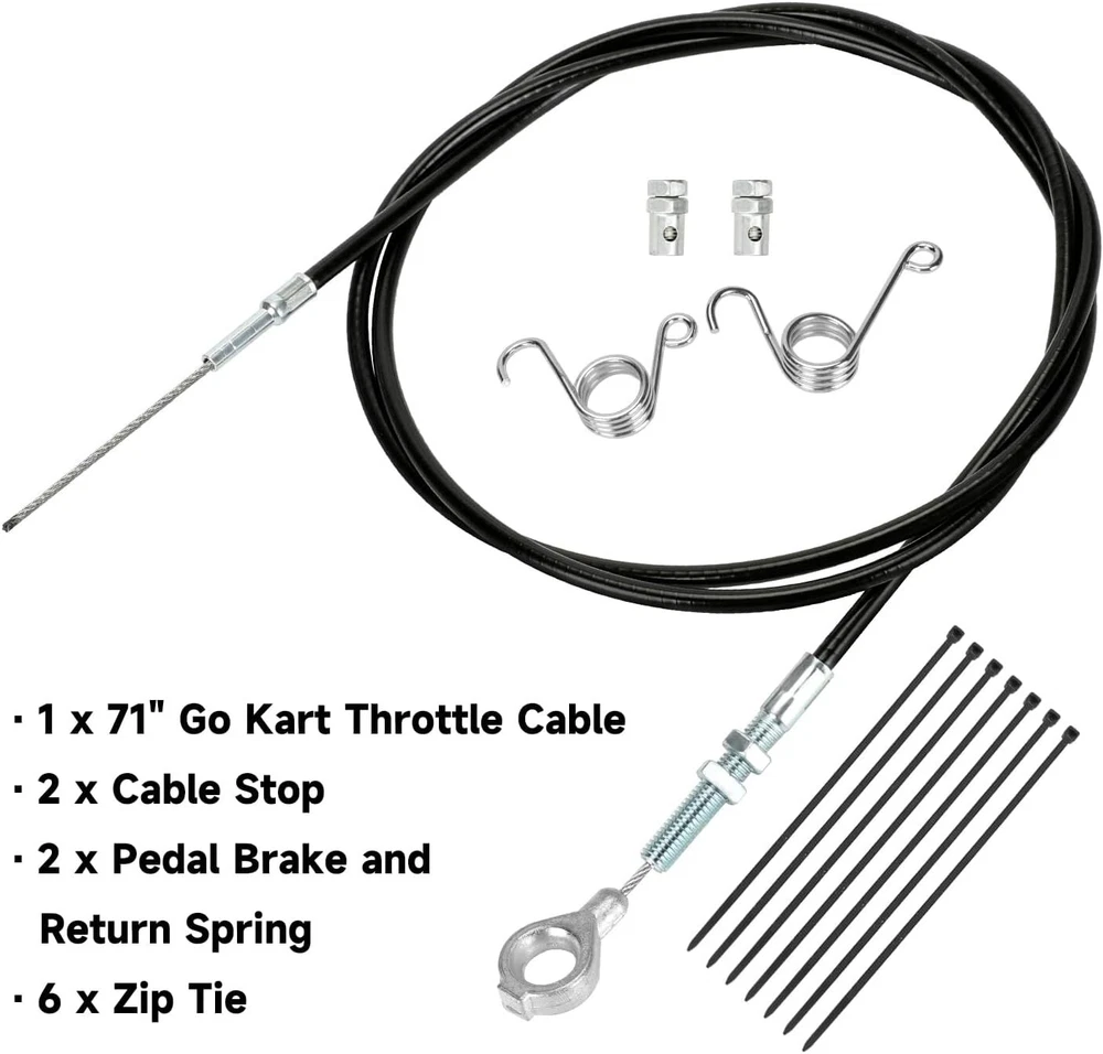 Fitment: 71”throttle cable with 63”casting length is suitable for predator 212cc 196cc 224cc GX160 GX200 5.5hp 6.5hp engine Manco 4xx Manco fox2 Manco Dingo Yerf dog Murray and Kandi American Sportworks Go Kart Cart Mini Bike Buddy Scooter; Part Number: Replaces 8252-1390 throttle cable; Strong and Durable: Made of high quality PVC protective shell with stainless steel core and heavy duty eyelet, our throttle cable will protect the inner from wearing down effectively and lasts for several racing seasons; Function: Go kart throttle cable connects to the gas pedal and the engine’s throttle plate as a link. When the gas pedal is pressed, the cable is pulled and the throttle starts; In addition, control your throttle and brake smoothly with our brake and return spring; Package Including:1*71” go kart throttle cable, 2*cable stops, 2*throttle pedal brake and return springs, 6*zip ties; Product Description Throttle Cable Connector The eyelet side on throttle cable connects to gas pedal, the other side links to engine throttle plate. When the gas pedal is pressed, the cable is pulled and the throttle starts. Stainless Steel Core High quality material, made of stainless steel strong, durable and high wear resistant. PVC Protective Sleeve Made of strong and thick pvc, outer black shell will protect the core cable from wearing down. Cable Stop Please get the cable through carefully, screw to press and fix tightly. Throttle Pedal Brake and Return Spring Replace your brake pedal return spring with our attached springs to control the throttle and brake smoothly. Zip Ties To keep the cable tidy and from dangling, we specially add six ties for better cable management. Kindly Reminder Please check the cable length carefully before you order. About HIAORS HIAORS is a leading manufacturer and exporter which is concerned with the design, development and production of aftermarket parts for motorcycle HIAORS considers more on safety and practicability, pursuing to let all users enjoy the reliable products. Quality Control The company has a complete assembly line production and installation, after inspection.