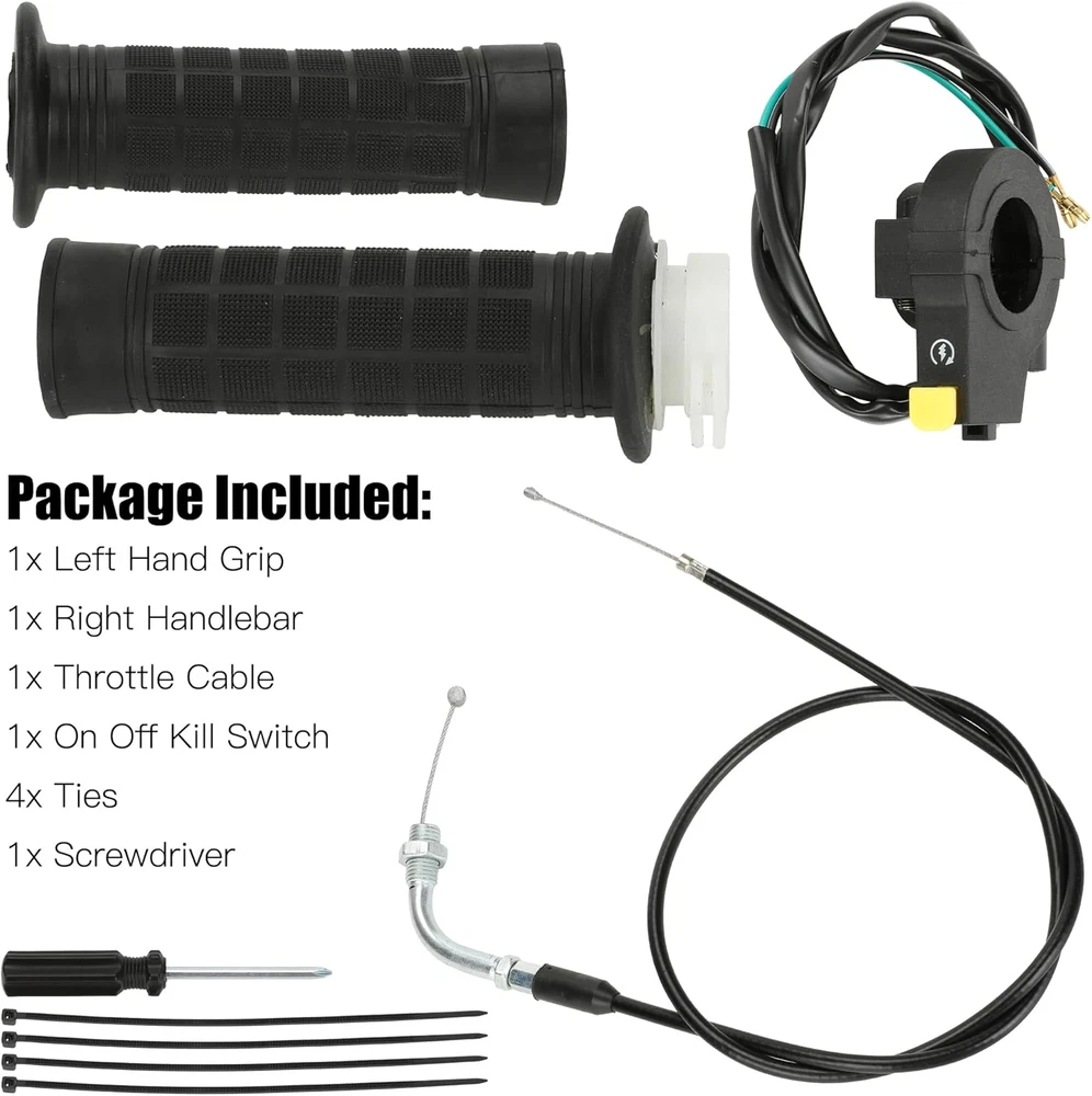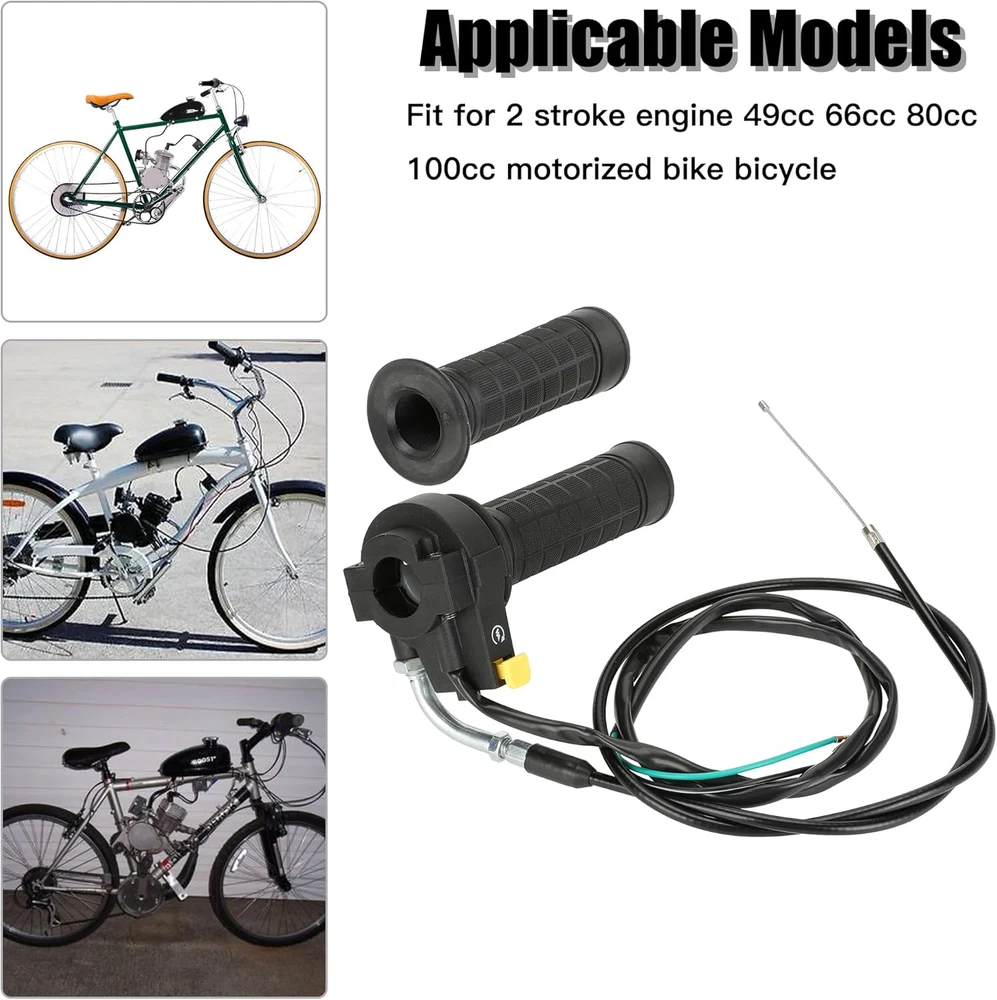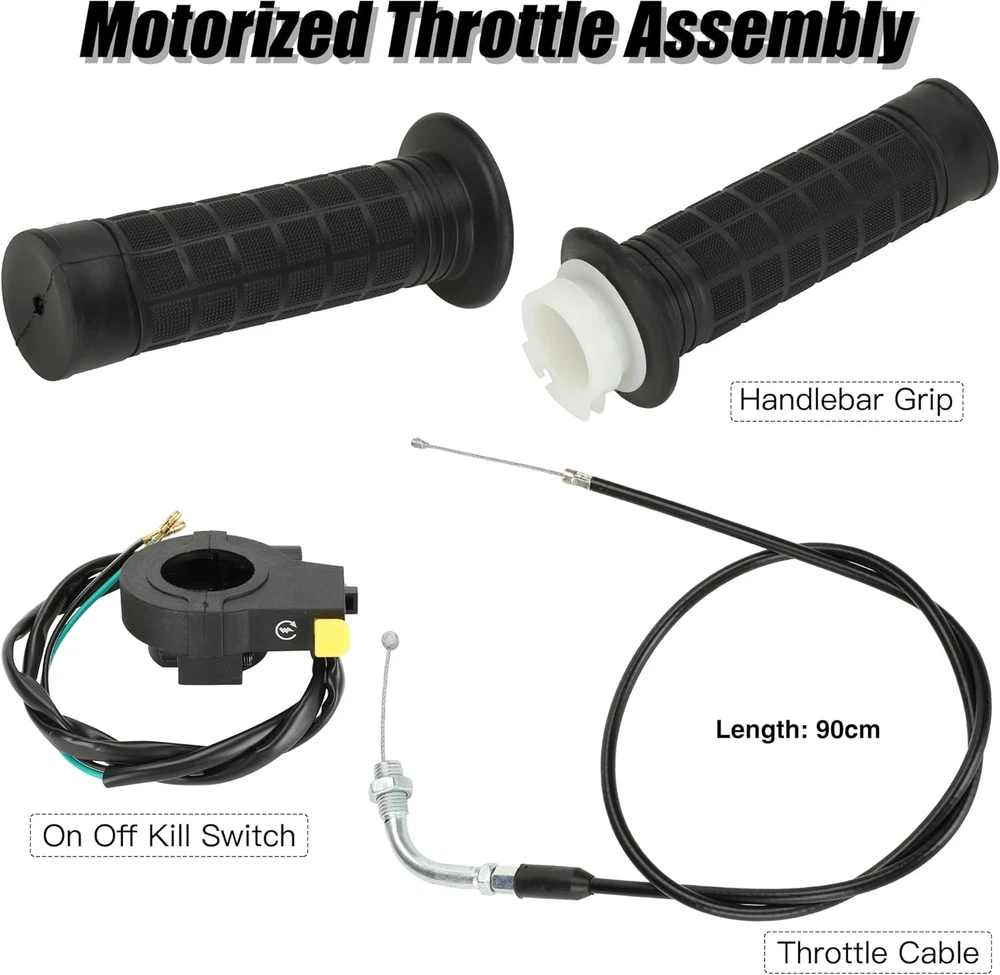 【Fitment】This Motorized Bicycle Parts with Motorized Bike Throttle Cable Assembly, 7/8 Throttle Grip Assembly Work on 49cc 66cc 80cc 100cc Motorized Bicycle 【Grip】Mini Bike Throttle Assembly Grip Inner Diameter: 22 mm, fit 7/8 inch (22 mm) handle bars 【Size】Total Length of Throttle Cable: about 90 cm (35.4"), and the copper wire is about 10.5 cm (4.3") 【Material】The throttle handle is made of high quality soft rubber to make it more comfortable and the rubbler handlebar has corrosion resistance and durability 【Packing List】: 1 * Throttle Cable, 1 * Left and Right Handle Grip, 1 * Throttle Kill Switch Product Description 22mm (7/8") Throttle Handlebar Grip The throttle handle is made of great soft rubber to make it more comfortable and the rubbler handlebar has corrosion resistance and durability. ON OFF Kill Switch Mounting hole diameter: 22mm (7/8") Total length of wire: 783mm (30.83") Motorize Bike Throttle Cable The inner material is stainless steel. The outer material is rubber. The cable is more durable and can be used for long time. ·Overall length: 88.5cm / 34.84" ·Moving length: 11cm / 4.33" Motorized Bike Throttle Assembly Includes Throttle Cable 35.43 inch Handle Grips 22mm Kill Switch Replacement for 2 stroke 49cc 50cc 60cc 66cc 80cc 100cc engine parts motorized bicycle bike push bike