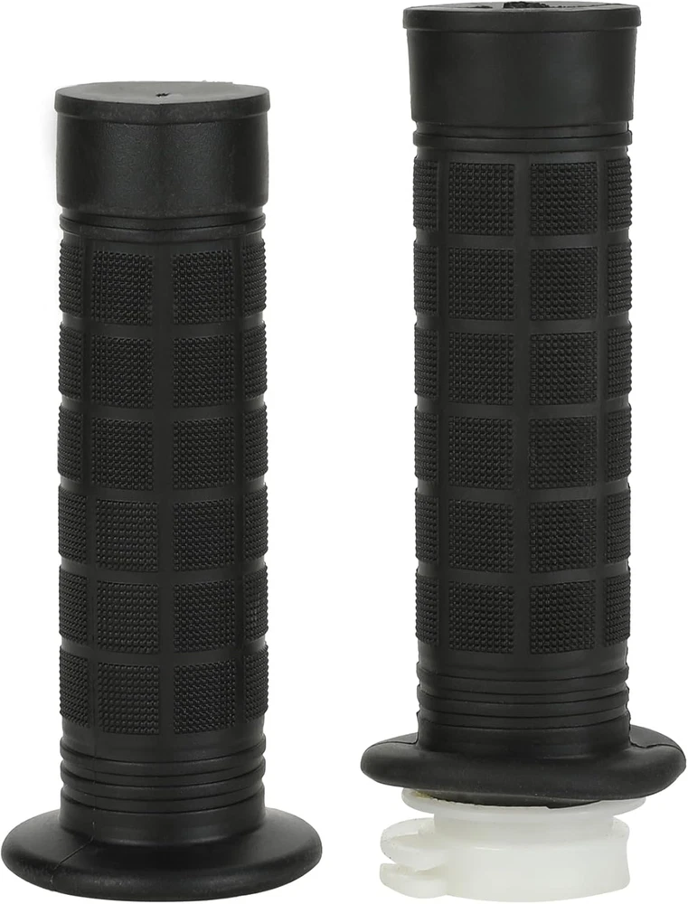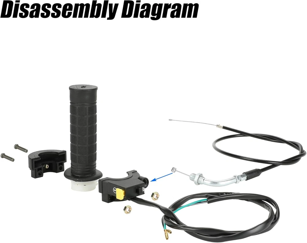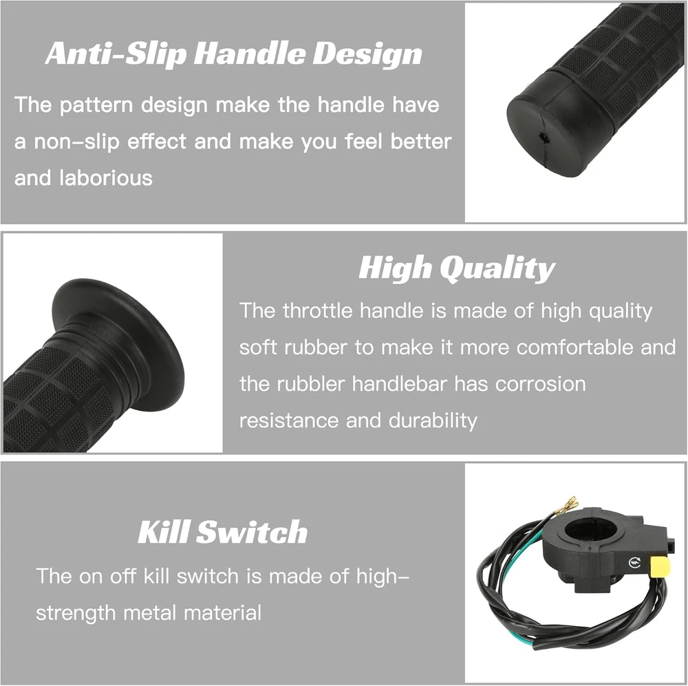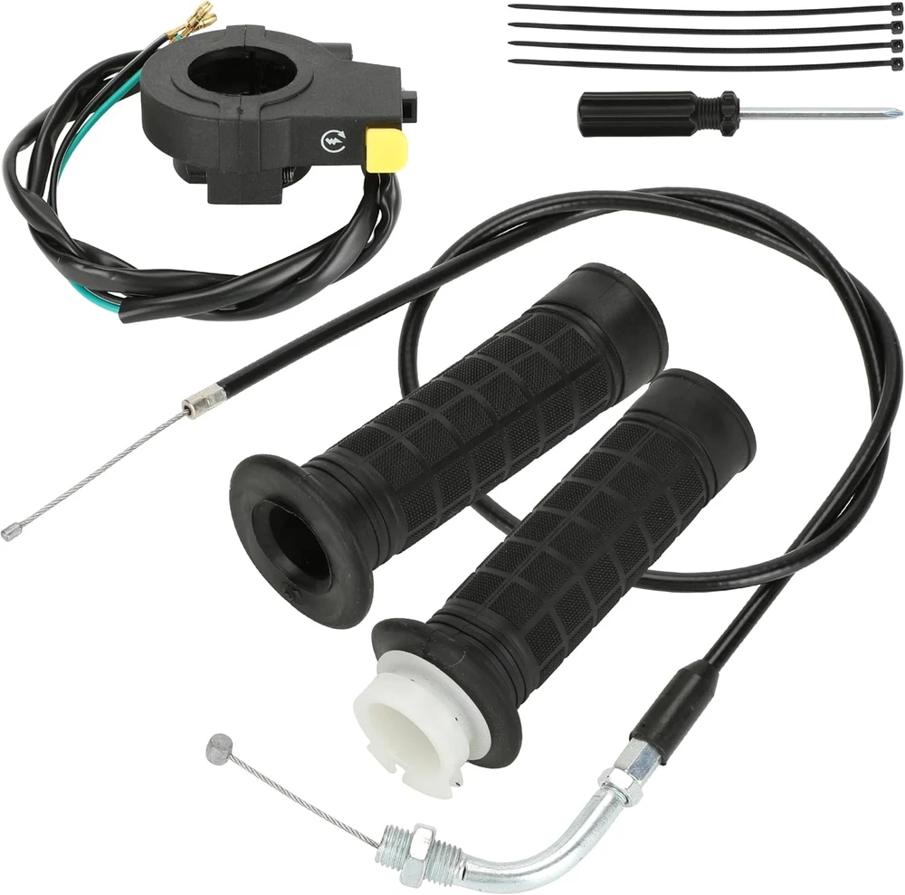 【Fitment】This Motorized Bicycle Parts with Motorized Bike Throttle Cable Assembly, 7/8 Throttle Grip Assembly Work on 49cc 66cc 80cc 100cc Motorized Bicycle 【Grip】Mini Bike Throttle Assembly Grip Inner Diameter: 22 mm, fit 7/8 inch (22 mm) handle bars 【Size】Total Length of Throttle Cable: about 90 cm (35.4"), and the copper wire is about 10.5 cm (4.3") 【Material】The throttle handle is made of high quality soft rubber to make it more comfortable and the rubbler handlebar has corrosion resistance and durability 【Packing List】: 1 * Throttle Cable, 1 * Left and Right Handle Grip, 1 * Throttle Kill Switch Product Description 22mm (7/8") Throttle Handlebar Grip The throttle handle is made of great soft rubber to make it more comfortable and the rubbler handlebar has corrosion resistance and durability. ON OFF Kill Switch Mounting hole diameter: 22mm (7/8") Total length of wire: 783mm (30.83") Motorize Bike Throttle Cable The inner material is stainless steel. The outer material is rubber. The cable is more durable and can be used for long time. ·Overall length: 88.5cm / 34.84" ·Moving length: 11cm / 4.33" Motorized Bike Throttle Assembly Includes Throttle Cable 35.43 inch Handle Grips 22mm Kill Switch Replacement for 2 stroke 49cc 50cc 60cc 66cc 80cc 100cc engine parts motorized bicycle bike push bike