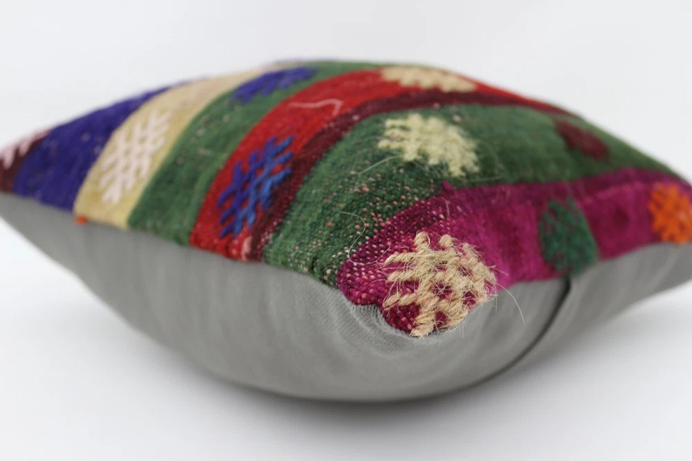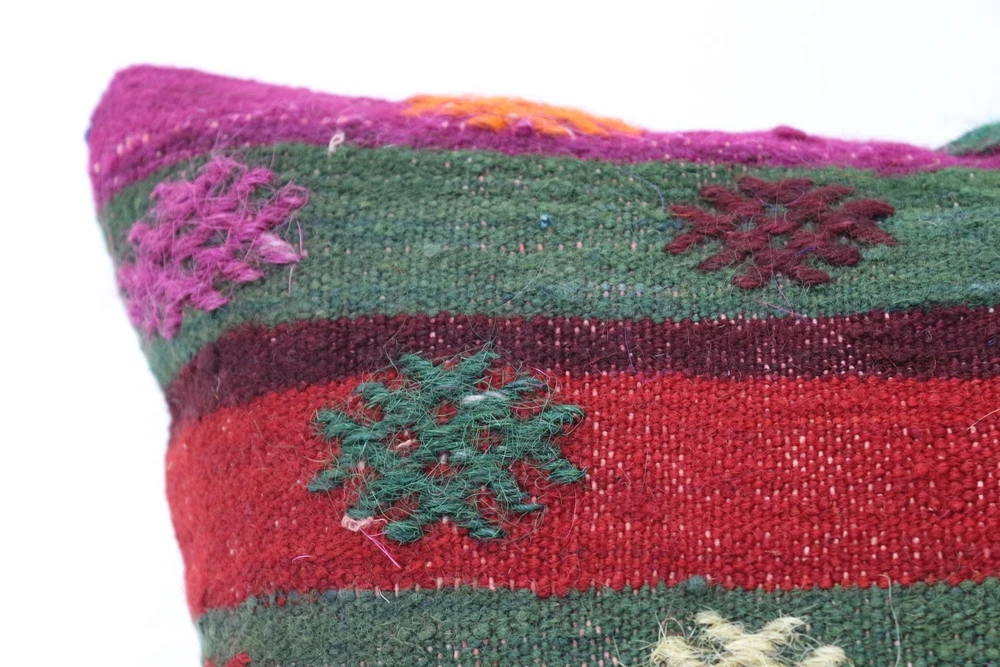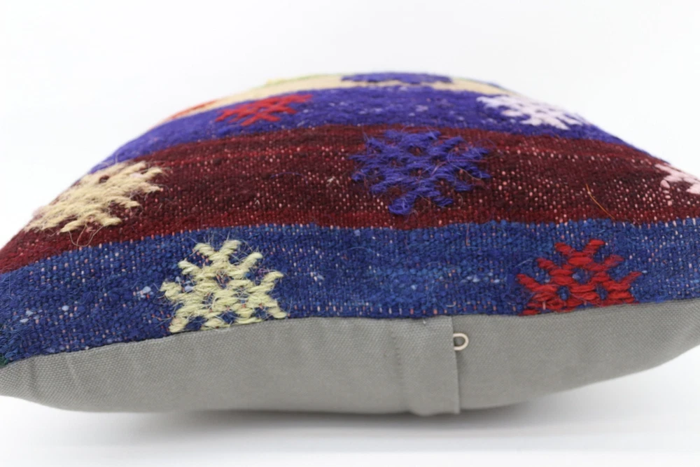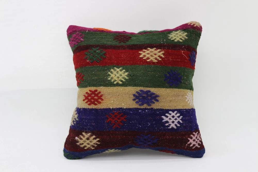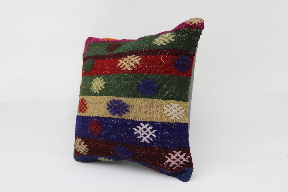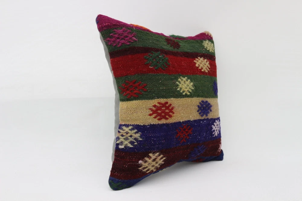 Kilim Pillow Details: All of my beautiful pillow covers or cushion cases are designed and made by me. I am making my throw pillow covers from handmade vintage rugs, Turkish rugs. Therefore, each of my vintage kilim pillowcase is one of kind. These cushions covers are piece of an art. The size of this pillow is 16 x 16 inches or 40 x 40 cm. The front side of this decorative pillow cover, cushion cover is wool on wool vintage kilim rug. The backside of this throw is high quality cotton fabric with a high quality zipper. This listing has 2 option for this handmade pillow. You can choose with insert or without insert. The listing photos is with insert in the pillowcase which is just for demonstration purpose. All of my vintage Turkish rugs have been professionally washed before I cut them as pillow case or cushion case so these kilim covers are 100 posent clean and ready to use. Due to the age and handmade nature of these vintage rugs, there might be imperfections and flaws that are not considered defects. This is a piece of a handmade vintage rug with minor signs of wear consistent with age and use that give it an antique look. You can see the condition of the rug pillow clearly in the detailed photos. I am going to ship your order of decorative pillow as soon as possible. I usually ship in the next day with DHL Express or FedEx which will deliver the kilim pillow, cushion cover just in 3-5 business days. It is my responsible until you receive pillow cover or pillow cover with insert at your door. If the pillow cover or insert get lost or damage during the shipping, I will ship the new kilim pillow cover or pillow insert for free as soon as possible. I take photos of my throw pillows indoor with professional camera which shows the real colors. The photos of these Turkish pillow covers are not altered. Keep in mind the colors of the rug vary slightly in different lights. Please contact to me for additional photos. I take the photos of my vintage rugs outside with daylight to show you the real and natural colors. My photos are not altered. Keep in mind the colors of the rug vary slightly in different lights. Please contact to me for additional photos. SATISFACTION GUARANTEED for your order in my shop. Your SATISFACTION is the most important to me. Please write me if you have any question or if you don't like anything from my pillow covers, cushion covers. If any reason, you are not happy from your Turkish pillow cover, I accept return without any hassle. Please read my shop policies for details. This cushion case or pillow cover can be used as decorative throw pillow, gift pillow, Christmas pillow case, bedding pillow, lumbar pillow, sofa pillow, bohemian pillow, boho pillow. You can find in any kind of Turkish kilim pillow cover in different design such as striped pillow, embroidered pillow, and geometric pillow.
