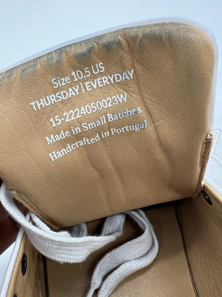 Department: Women Performance/Activity: Walking Country/Region of Manufacture: Portugal US Shoe Size: 10 Pattern: Solid Insole Material: Leather Style: Sneaker Heel Height: Flat (Under 1 in) Occasion: Casual, Activewear Brand: Thursday Boot Company Theme: Classic Toe Shape: Round Toe AU Shoe Size: 10 Vintage: No Character: Boots Product Line: Thursday Boots Type: Casual Upper Material: Leather Season: Summer, Spring, Fall Outsole Material: Rubber Handmade: Yes EU Shoe Size: 40.5 Heel Style: Flat UK Shoe Size: 8 Color: White Shoe Width: Standard Features: Comfort, Breathable Closure: Lace Up Shoe Shaft Style: Low Top Model: Co. Legacy Thursday Accents: Logo, Lace Lining Material: Leather Fabric Type: Leather