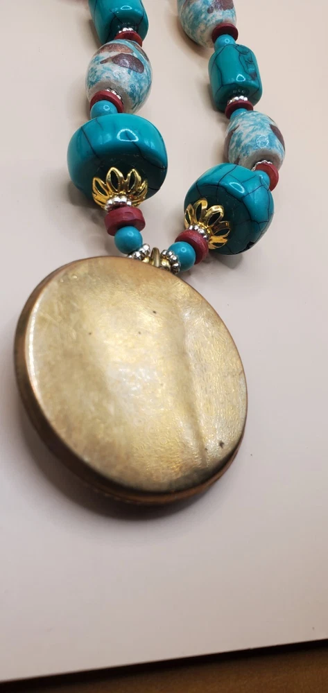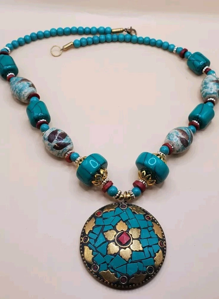 This beautiful handcrafted necklace is a stunning example of Tibetan jewelry artistry. The intricate beadwork and use of natural stone make it a unique piece that will be treasured for years to come. The large round pendant features red and turquoise color stone inlay and brass accents. The necklace is made of red and turquoise color beads. The round pendant is 2" across. The necklace measures 21 inches in length and weighs 3.5 ounces. It is perfect for anyone wants to add a statement necklace with a touch of cultural elegance to their wardrobe. This necklace is in good condition. Includes black gift box.