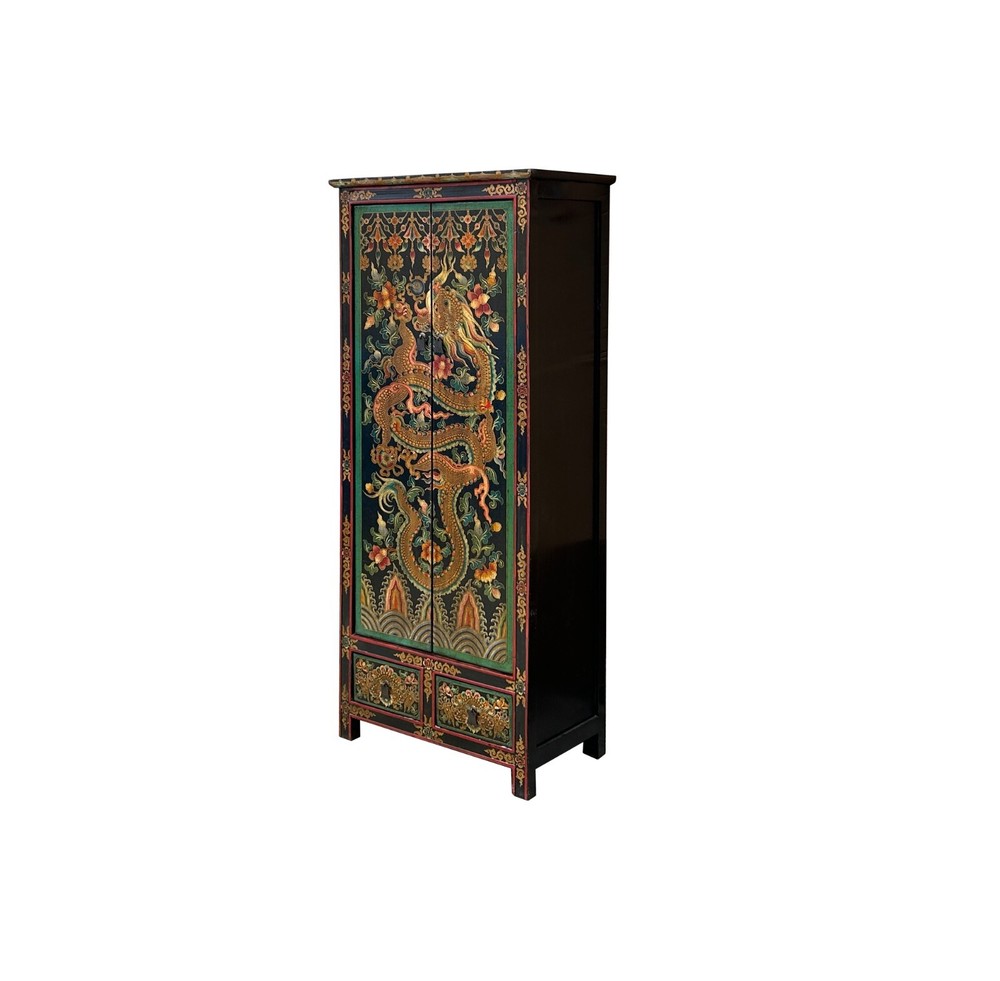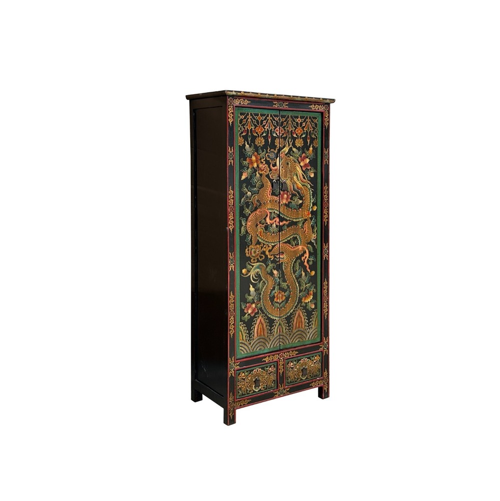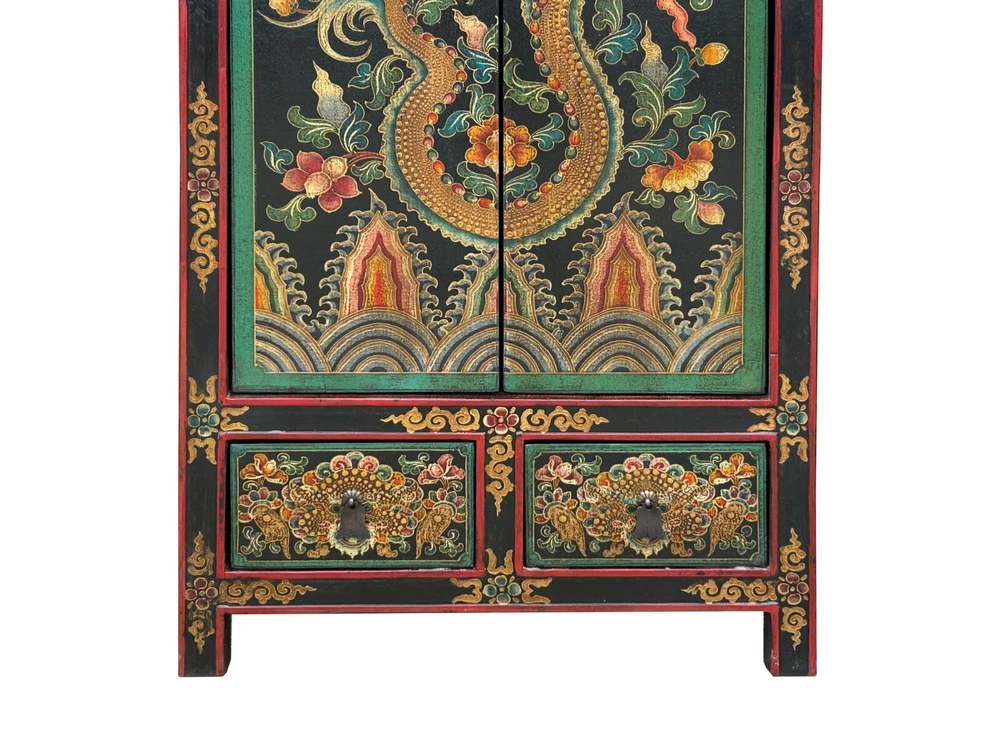 Tibetan Style Golden Dragon Graphic Tall Slim Narrow Storage Cabinet ws4610 DESCRIPTION This striking tall cabinet showcases exquisite Tibetan artistry, likely a vintage or antique piece that serves as a captivating focal point. The double doors are adorned with a dramatic, hand-painted golden dragon, a powerful symbol of good fortune, strength, and wisdom in Tibetan culture. The intricate details of the dragon are further enhanced by surrounding floral and geometric motifs, characteristic of traditional Tibetan design and often imbued with Buddhist symbolism. The cabinet features a dark, possibly lacquered background that accentuates the vibrant colors of the artwork. With additional storage in the lower section, this unique piece offers both aesthetic appeal and practicality, perfect for collectors of Asian art, those seeking spiritual and symbolic decor, or anyone desiring a bold and culturally rich statement in their home. Dimensions: w27.5" x d15.5" x h67" Origin: China Material: Wood Condition: hand-made, distressed marks Work : Ship in one piece We offer a flat shipping fee of $445 for customers in the contiguous United States (48 states) for convenient curbside delivery. (Additional shipping costs will apply to customers in New York, Hawaii, Alaska, US Islands, Florida Keywest, or Canada, based on their specific location). The shipping cost includes insurance and handling charges for added protection.For customers in San Francisco or the Bay Area, we provide local delivery at a cost determined by the distance. You can find the exact cost by entering your zip code during checkout. Alternatively, you can pick up your order in-store with no extra shipping fee.If you need extra care and a white-glove experience, we offer a specialized service with a 4-8 week transit time, tailored to your destination. Contact us for a detailed quote on this service.Upon receiving your shipment, please carefully inspect the exterior packaging while the delivery personnel are present. Note any visible damage on the delivery paperwork, as carriers do not typically honor concealed damage claims. Your cooperation in documenting any visible damage is greatly appreciated Shipping Payment Return Contact Us Shipping Payment Return Contact Us US domestic continental buyer of 48 state pays listed shipping charge for curbside delivery. Customer from Hawaii, Alaska, US Island, Florida Key West and Canada pays extra Shipping cost. Insurance and handling charge are included in the shipping cost. Curbside - trucker drops off the pallet roadside of your location. We normally ship within 5 to 7 business days after payment, usually sooner. When your shipment is delivered, carefully inspect the outside of the packaging before the delivery personnel leave. It is important to clearly indicate if there is any visible damage to the packaging or items on the delivery paperwork. Carriers usually do not honor concealed damage claims so it is crucial to clearly indicate any visible damage to the packaging or items on the delivery paperwork. In-store pickup is highly welcomed if you are in San Francisco Bay Area (No charged) White Glove In-house Delivery service can be arranged - estimate an additional $500 -$700 based on the furniture size and volume. The Shipping company needs to accumulate shipments to move from coast to coast, so please understand the transit time is about 6 - 8 weeks. For customer who are looking to buy multiple items, we can do combine shipping - several items on the same pallet or small item inside the largest items as long as it can fit in. Global shipping is available, please contact us. We accept Paypal and all major credit card (Visa, Master, American Express and Discover) For internatinal customer, the easiest way is to pay by Paypal, we will only ship to Paypal comfimed address. - In the event that you would like to return your purchase, we allow returns that are processed within the defined return date (the return date is to be found in the return policy/shipping and handling section) - Please contact us for a return authorization and the return shipping address - We advise you to use a reputable carrier service when returning your goods. Please pack all returns appropriately. - Buyer may be responsible for round trip shipping. Damage Claim: For Curbside trucking shipment, please check the product is in good condition before you sign the release paper and accept the shipment. Report to the driver and write a note on the shipping document if there is any damage. Take photos for the record. We are not responsible for any conceded damage reported afterward. Customer is responsible to report any damage as soon as possible after receiving the item, All packing material should be kept for damage claim. We will not responsible for any damage cost if damage claim cannot be filed to the insurance company due to customer mistake " did not keep the original packaging material and box" If you have any question, please contact us via ebay. We usually respond within 10 min during office hour. Monday ~ Sunday (7days 10.00 am till 6.00 pm). See our other items This striking tall cabinet showcases exquisite Tibetan artistry, likely a vintage or antique piece that serves as a captivating focal point. The double doors are adorned with a dramatic, hand-painted golden dragon, a powerful symbol of good fortune, strength, and wisdom in Tibetan culture. The intricate details of the dragon are further enhanced by surrounding floral and geometric motifs, characteristic of traditional Tibetan design and often imbued with Buddhist symbolism. The cabinet features a dark, possibly lacquered background that accentuates the vibrant colors of the artwork. With additional storage in the lower section, this unique piece offers both aesthetic appeal and practicality, perfect for collectors of Asian art, those seeking spiritual and symbolic decor, or anyone desiring a bold and culturally rich statement in their home. Dimensions: w27.5