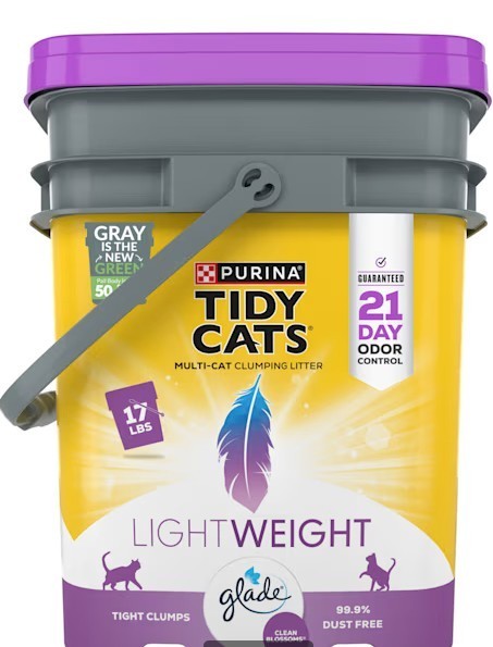 Tidy Cats Scented Glade Clean Blossoms Low Dust Clumping Multi Cat Litter 17-lbs Usage Instructions Between litter changes, clean the litter box with warm water and a gentle detergent. Use this product similarly to traditional scoopable litter: Fill the box to a depth of about 3–4 inches. Remove waste daily. Refill as needed to maintain the 3–4 inch level. For a cleaner pour, keep the container close to the box when adding litter. Description Purina Tidy Cats LightWeight with Glade Clean Blossoms offers a fresh, pleasant environment around your cat’s litter area. Its natural clay formula produces minimal dust, helping keep the space around the box tidier. The Clean Blossoms scent adds a gentle fragrance that helps mask strong smells and keeps the area feeling refreshed. The formula helps slow the development of ammonia-related odors for up to 14 days when used as directed for one cat. With a weight significantly lighter than many traditional scoopable litters, the product is easier to lift, pour, and manage. Its ability to form firm, easy-to-remove clusters makes box maintenance simple. Ideal for multi-cat households, this litter helps maintain a dry and comfortable box environment. It delivers the reliable performance Tidy Cats is known for, now presented in updated packaging. Key Features: Low-dust formula for a cleaner pour Helps minimize ammonia smells for up to 14 days when used correctly Light scent keeps the litter area feeling fresh Reduced weight while retaining full litter volume Made with natural clay and mineral materials plus a built-in freshening system