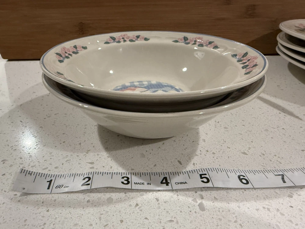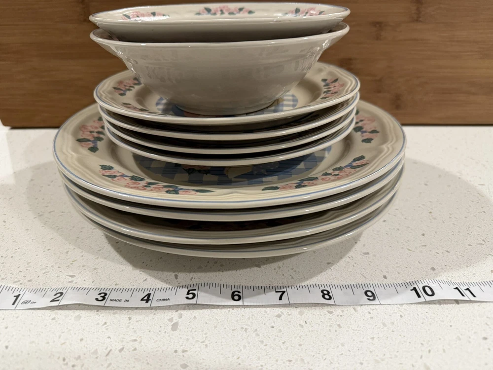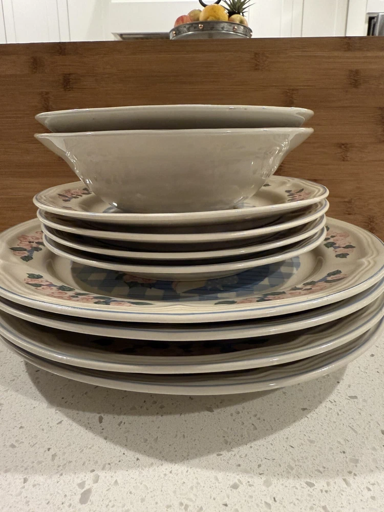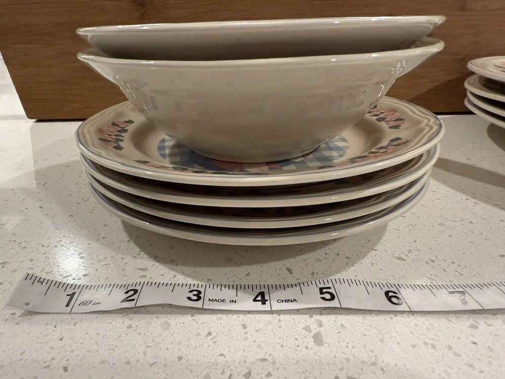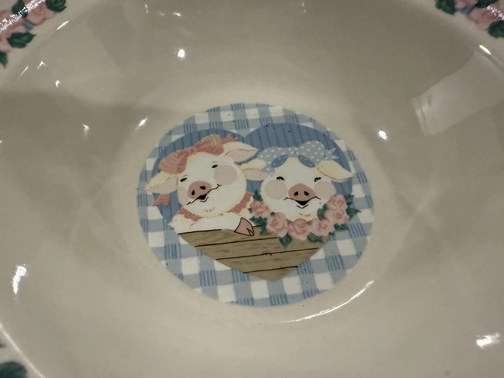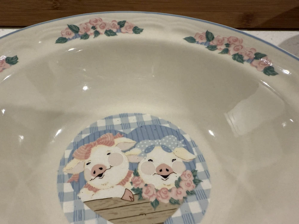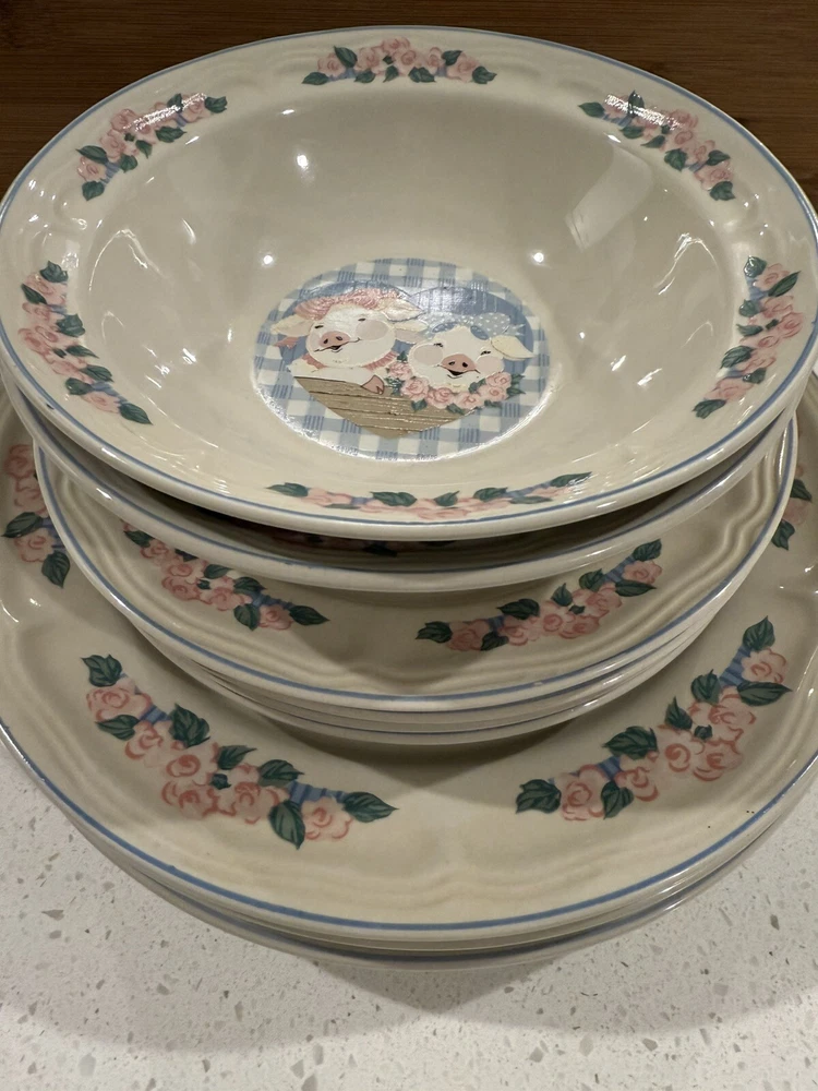 Product Line: Tienshan Stoneware Time Period Manufactured: 1990-1999 UPC: Does not apply gtin13: Does not apply Color: Multicolor Manufacturer Warranty: None Original/Licensed Reproduction: Original Brand: Tienshan Custom Bundle: No Type: Dinner plates, salad, plates, bowls Finish: Glossy Vintage: Yes Year Manufactured: 1997 Number of Items in Set: Ten-Piece Production Style: Art Pottery Shape: Round Material: Stoneware Style: farmhouse Country/Region of Manufacture: China Antique: No Handmade: No Set Includes: 4 Dinner Plates, Dessert Plate, Bowl Occasion: All Occasions Theme: Pig MPN: Does Not Apply Pattern: Pig Pal Backstamp: Printed Features: Dishwasher Safe, Microwave Safe, Oven Safe Era: Late 20th Century (1970-1999) Production Technique: Pottery