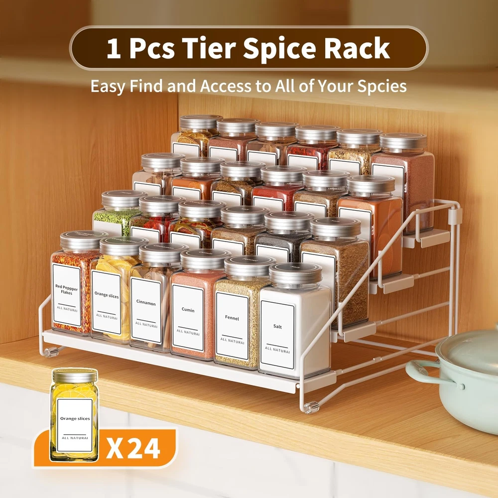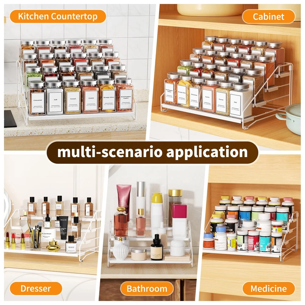The 4-tier tiered spice rack is a depth adjustable spice rack organizer for cabinets that effectively increases cabinet storage capacity. Its unique ladder design keeps spice bottles neatly arranged and easily accessible. Each spice rack can hold up to 24 spice bottles, with dimensions of 13 inches x 10 inches x 6.5 inches and a depth of 2.5 inches. This design is not only suitable for cabinets but also for storing various items on countertops, in pantries, bedrooms, bathrooms, and more. Made of high-quality metal, the spice rack is strong and sturdy, with a sheet metal base on each tier that ensures stable placement of spice bottles and reduces the risk of tipping over. You can flexibly adjust the depth according to the size of the bottles, making efficient use of cabinet space and providing the perfect storage solution for spice bottles of various sizes. Note that the spice bottles are not included. 4-tier tiered spice rack features a folding design that makes it easy to assemble without screws and comes with simple instructions. You can quickly put together a cabinet countertop spice rack with ease. Cleaning is a breeze; just wipe it with a rag to make it look brand new. In addition to storing spice bottles, this spice rack can also be used to store toiletries, nail polish bottles, cosmetics, medicines, or arts and crafts supplies. You can neatly arrange and display them on the desired countertop, in the cabinet, or in the corner, keeping your kitchen or pantry neat and organized. This spice rack is not just a spice organizer; it is a multi-functional storage solution suitable for various home environments. 4 Tier Spice Rack Increased Cabinet Storage Capacity: 4 tiered spice rack organizer for cabinet with ladder design keeps your spices organised and easy to reach. Holds 24 spice jars capacity, each spice organizer size is: 13 inchx10inchx6.5inch, depth has: 2.5 inches. Suitable for most items storage for cabinets, countertops, pantries, bedrooms, bathrooms and more. Adjustable Depth Design, Rationalisation of Space: The tiered spice rack adjustable depth, 4 shelf can be combined to adjust the depth at will. Adjust the depth according to the size of spices you are storing, making efficient use of cupboard space. The perfect storage solution for multi-size spice jars. NOTE: JARS NOT INCLUDED. Easy to Assemble & Clean: Spice shelf organizer for cabinet with folding design, easy to assemble, no screws required, with simple instructions. Get a cabinet countertop spice rack organizer in a breeze. Simply wipe with a rag and the spice rack is ready, brand new, caring for your spice cabinet organizer has never been easier. Metal Material Strong & Sturdy: Spice shelf is made of high-quality metal, the each tier has a sheet metal base design. making the spice bottles more stable to place and less likely to tip over. With cabinet spice rack, you can nicely organized your spice bottles in your cabinet in leveled tiers. Multiple Item Storage: Countertop spice rack, more than just a spice organizer for your cabinet, it can also be used to store toiletries or nail polish bottles, cosmetics and medicines, or arts and crafts supplies. You can arrange and display them in an orderly manner on the desired countertop, in the cabinet, or in the corner!