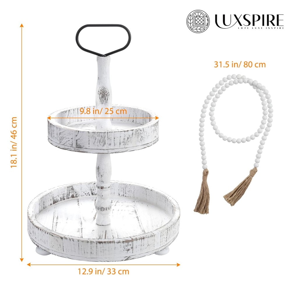 Farmhouse 2 Tiered Tray: This wooden tiered tray comes with a delicate wooden bead garland for decoration, adding an touch of elegant to your home decor. The 2-tier tray features a sturdy metal handle for easy and safe movement. Handmade & Natural Wood: This 2 tiered tray stand is crafted from natural and eco-friendly paulownia wood, 100% handmade by skilled artisans. Each decorative tray boasts a unique texture, and this tiered tray boasts robust construction, ensuring durability and stability for long-term use. Multi-purpose: Perfect for serving, storing, and displaying a variety of items from kitchen essentials to living room decor. You can display it anywhere you like and fill it with many small items and decorations. Various Holiday Decor: This farmhouse decorative tray serves as a versatile option for holiday decorations, such as Christmas, Thanksgiving, Halloween, Easter, Independence Day, family gatherings, housewarming parties, and many other festivals, adding a warm and festive atmosphere to your space. Easy to Assemble: No tools required, install and remove the tiered tray stand in just a few steps. You can break it down into two round trays for individual organizer or decoration, or construct it into a two-tiered tray. Assemble the tiered tray freely according to your preferences.