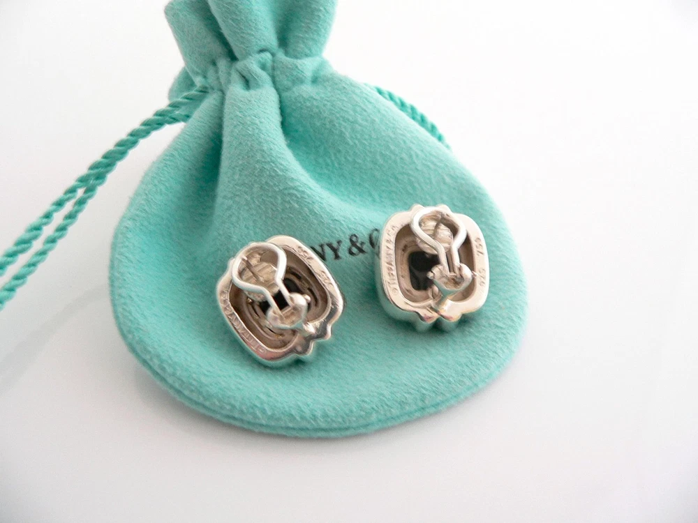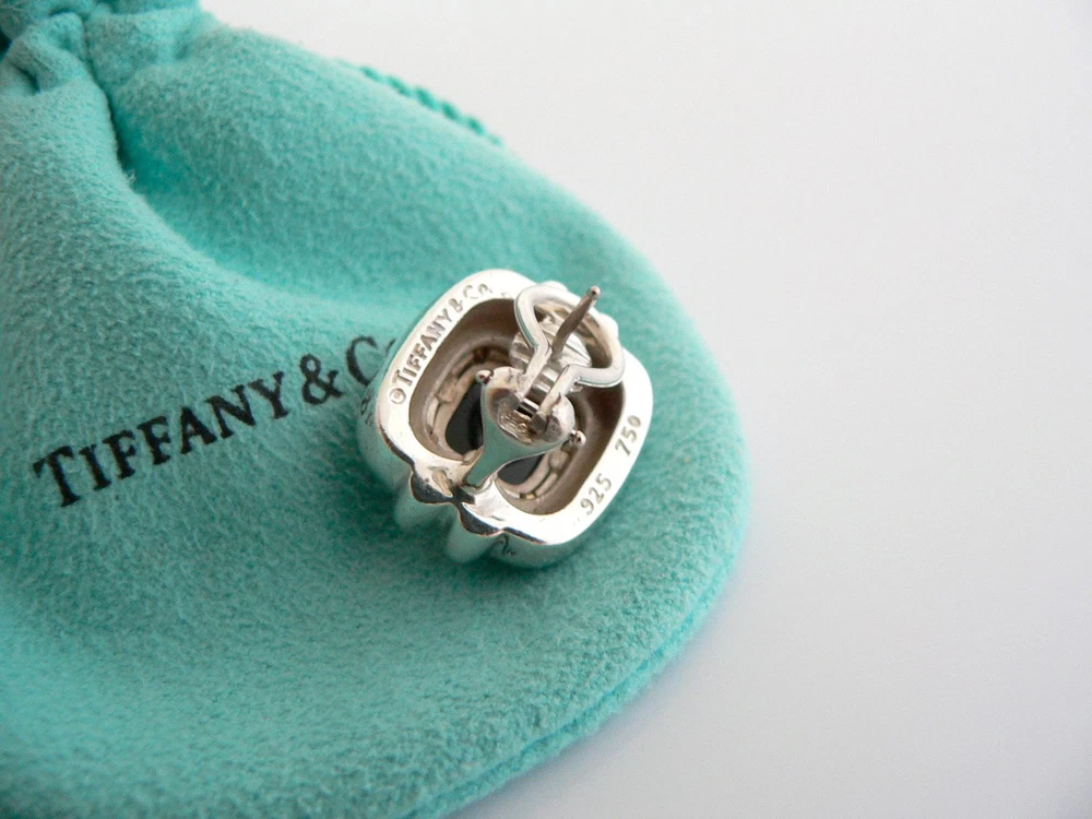 Overview: Time to pull your hair back and show off your awesome and gorgeous earrings! Offered for sale is a wonderful and very rare pair of Tiffany and Co. Sterling Silver and 18K Gold Rope & Black Onyx Square Pierced earrings. A very pretty pair that will certainly be a conversation starter! I am 100% sure you will get many compliments when you wear them, so be ready :) It is like wearing a piece of art - right on ears! Adds just the right "Pop" of color and Tiffany style to any outfit! Very versatile pair of earrings that works well with almost any outfit you put on. And because it is two tone, it will go with pretty much any other piece of jewelry you already own! Imagine the piece with a nice sundress ... now imagine wearing it with jeans and a crisp white shirt ... or with your ultra chic cocktail dress ... Perfection! Certainly a wonderful treasure to find ... right here on Ebay! Great piece to start or add to your Tiffany collection. The earrings are fully hallmarked and is guaranteed to be 100% authentic. Wonderful present for yourself or anyone you love! Will surely delight! It will come with its Tiffany pouch as shown! Perfect and ready for gifting! Particulars: Size & Measurements: The earrings are approx. 0.75 inches each. Metal & Hallmarks: Tiffany & Co. / 925 / 750 Solid 925 sterling silver and 18K gold Please check out my other unique and interesting Tiffany items on sale.