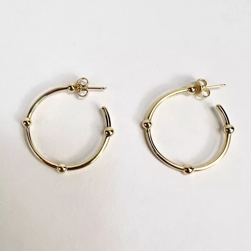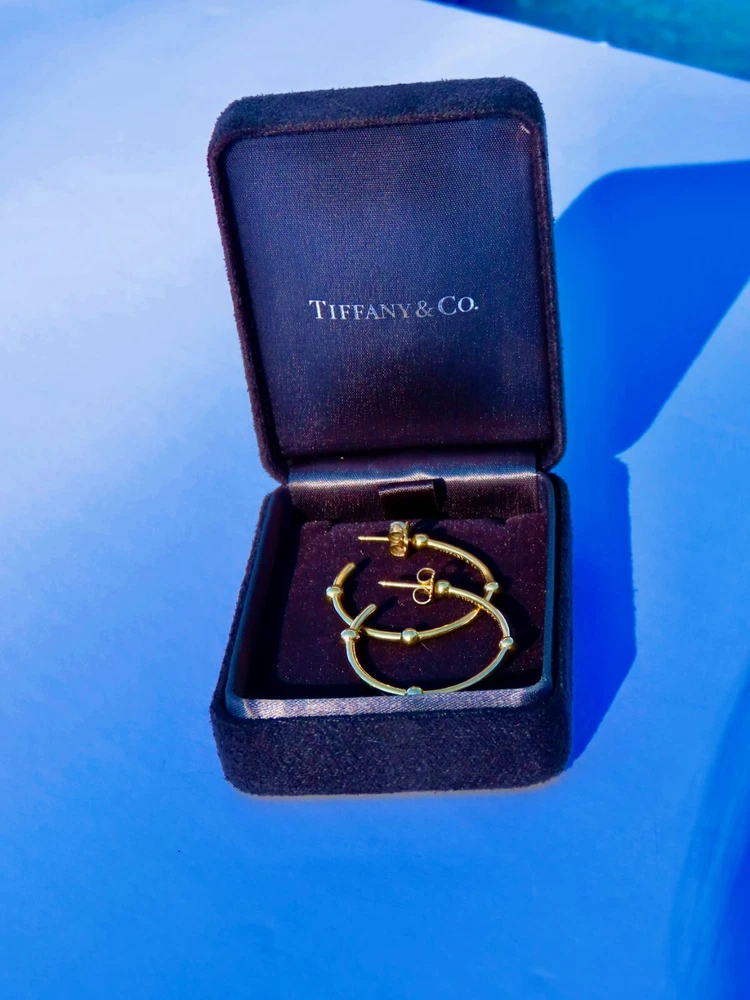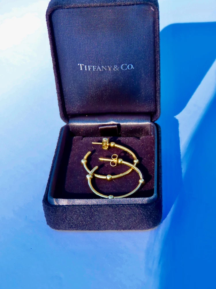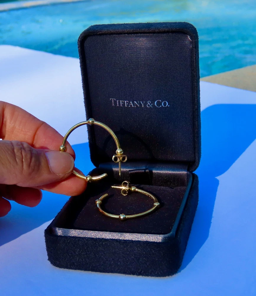 Elevate your style with these stunning Tiffany & Co. 18k 750 Yellow Gold Large Rondelle Ball Hoop Earrings. Crafted with precision and care, these earrings are a true statement piece that exude elegance and luxury. The beautiful yellow gold color of the earrings pairs well with any outfit, making them a versatile addition to your jewelry collection.The earrings are designed with a hoop style and feature a large rondelle ball design that adds a touch of sophistication to any look. They are 1'' in length and weigh 8.2 grams, making them a perfect choice for those who want to make a bold statement with their jewelry. These earrings are ideal for any occasion and are sure to turn heads wherever you go. They are in excellent pre-owned condition.