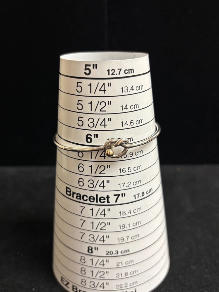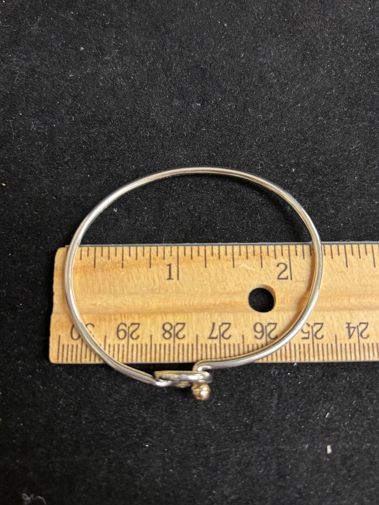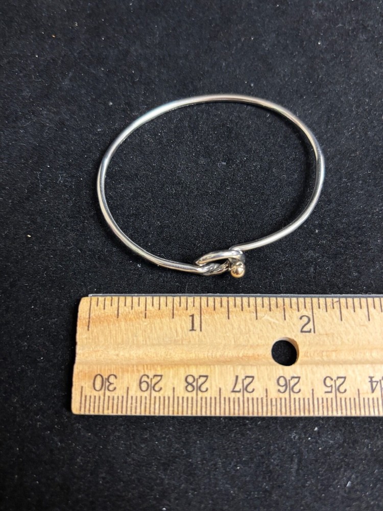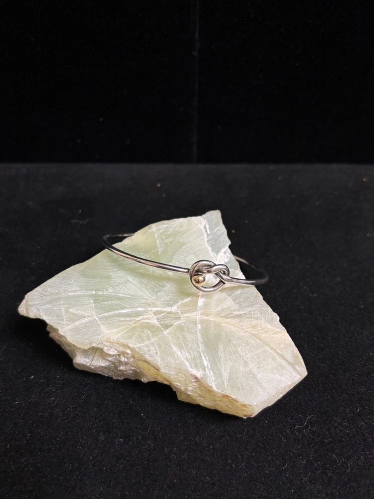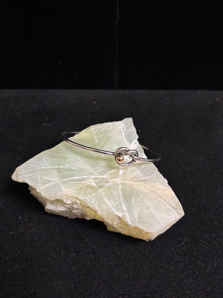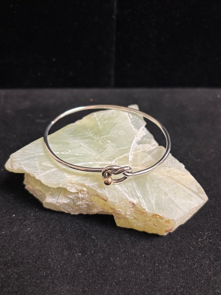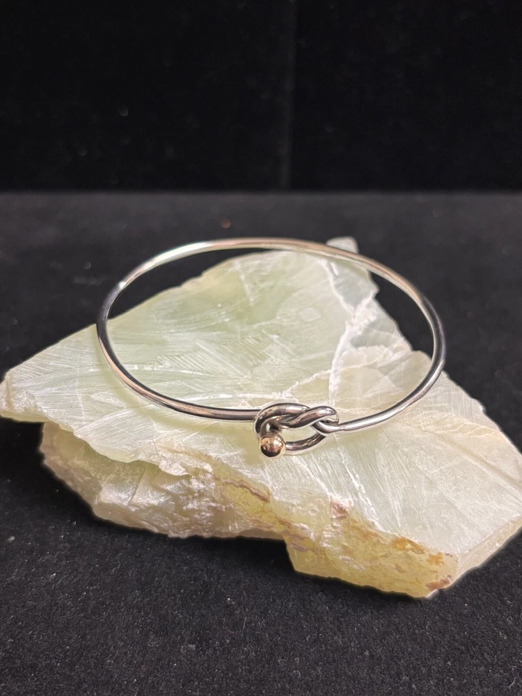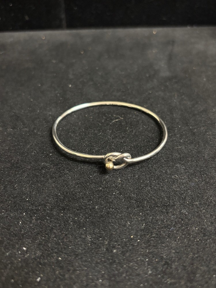 TIFFANY & CO. 925 STERLING AND 14K GOLD LOVE KNOT BANGLE BRACELET IN SIZE 6. IN EXCELLENT CONDITION, WITH NO VISIBLE FLAWS OR SIGNS OF WEAR. IT IS SLIGHTLY MISSHAPEN FROM USE BUT DOES NOT AFFECT COMFORT.